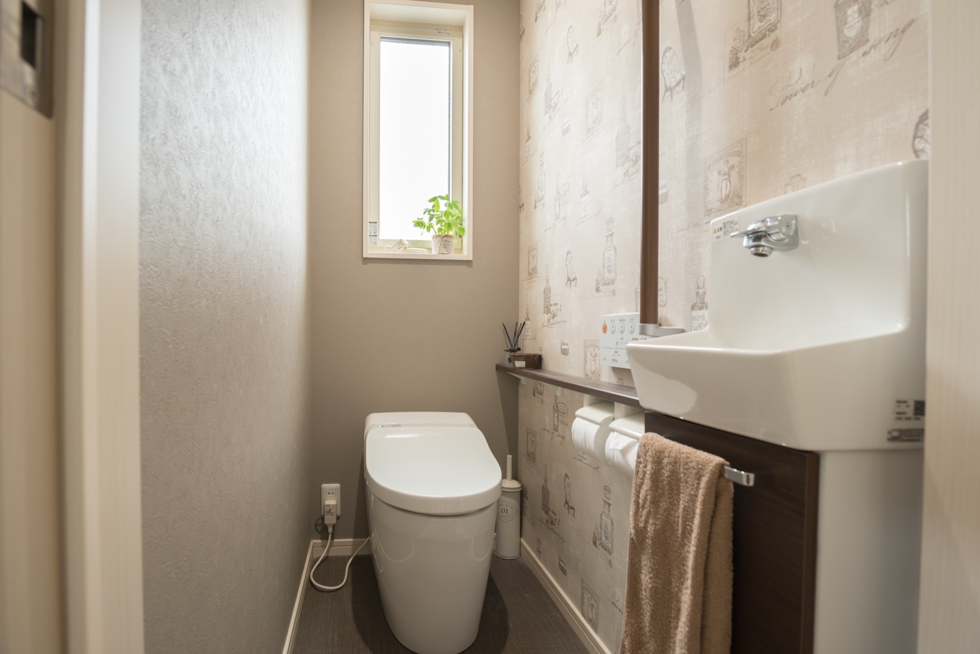 トイレの印象を大きく変える内装仕上げ。近年では、壁にアクセントクロスを施すデザインが人気です。さらに、消臭効果や防汚効果など機能性の高い内装材を採用すれば、おしゃれでより快適な空間に変化させることが可能です。