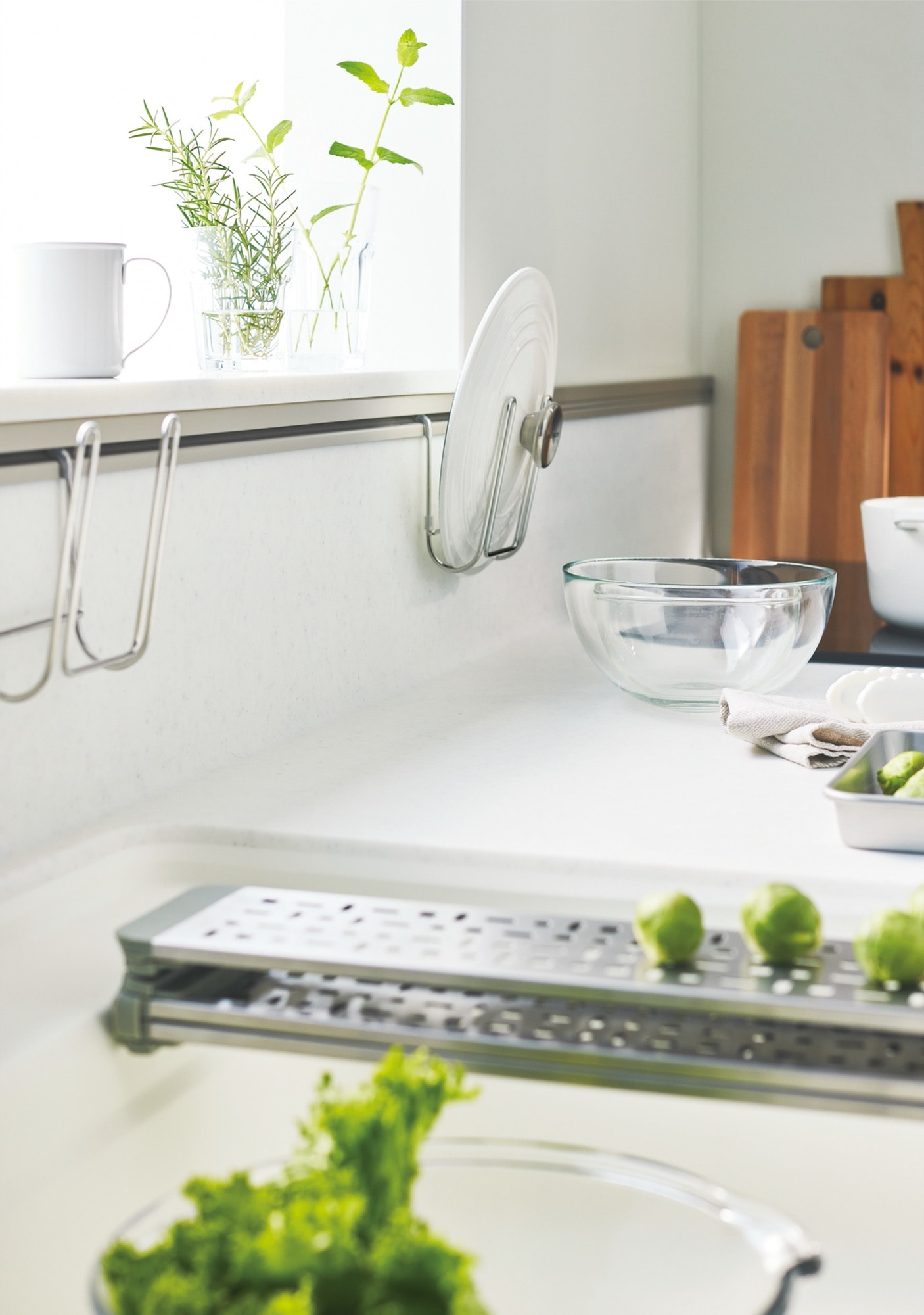 「コラージア」のシンクは、使いやすさとお手入れのしやすさを徹底的に追求したデザインが特徴。シンクとカウンターが一体成形されているため、隙間や段差がなく、汚れがたまりにくい構造になっています。さらに、シンク内には折りたたみ式のプレートやラックが設置可能で、食材の水切りや調理器具の一時置き場として活用できるのもポイント。シンクスペースを有効に使えるため、調理作業の効率がアップします。