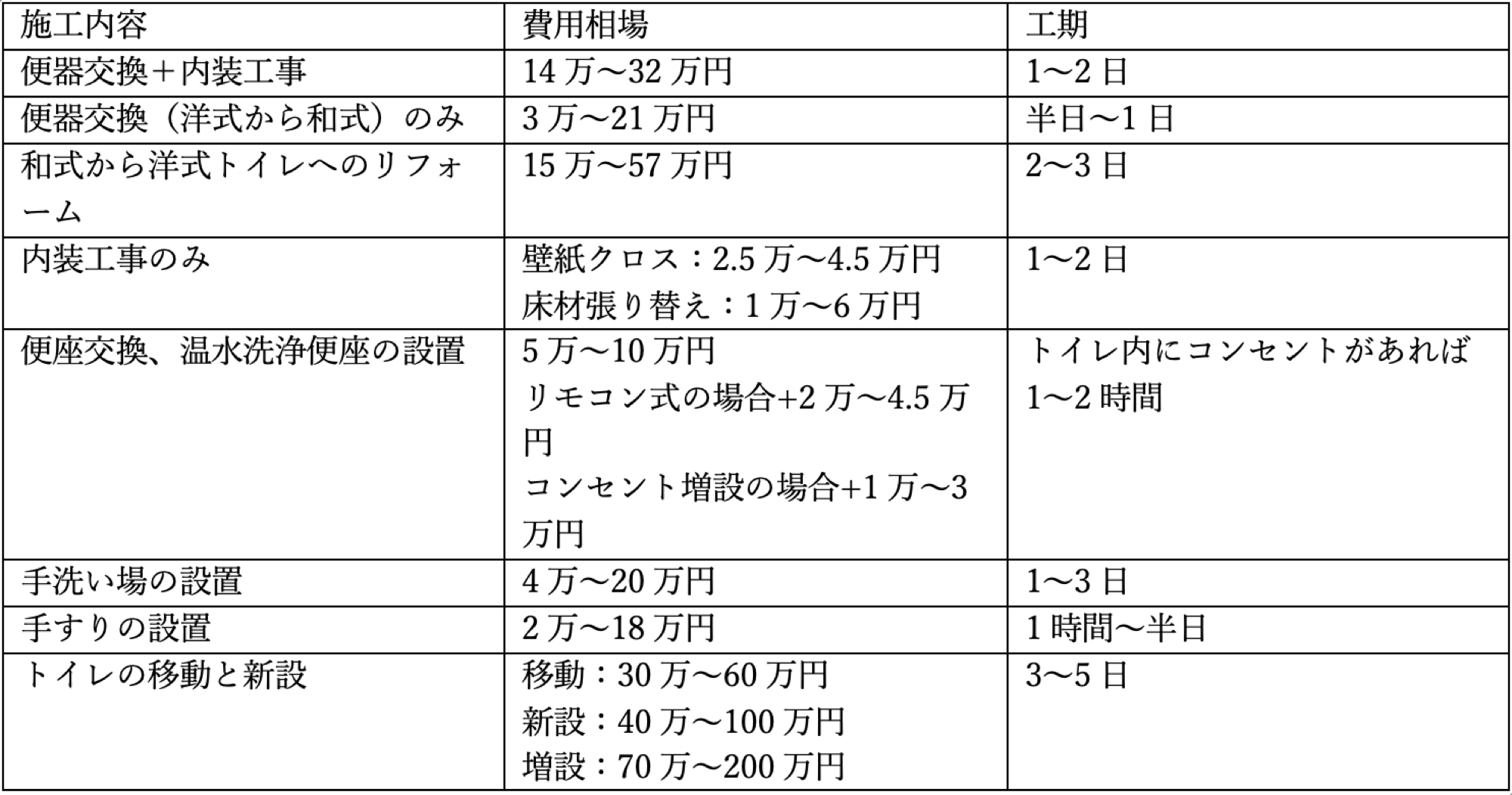 トイレの交換やリフォームで行う施工内容別の相場と工期を、以下の一覧にまとめました。