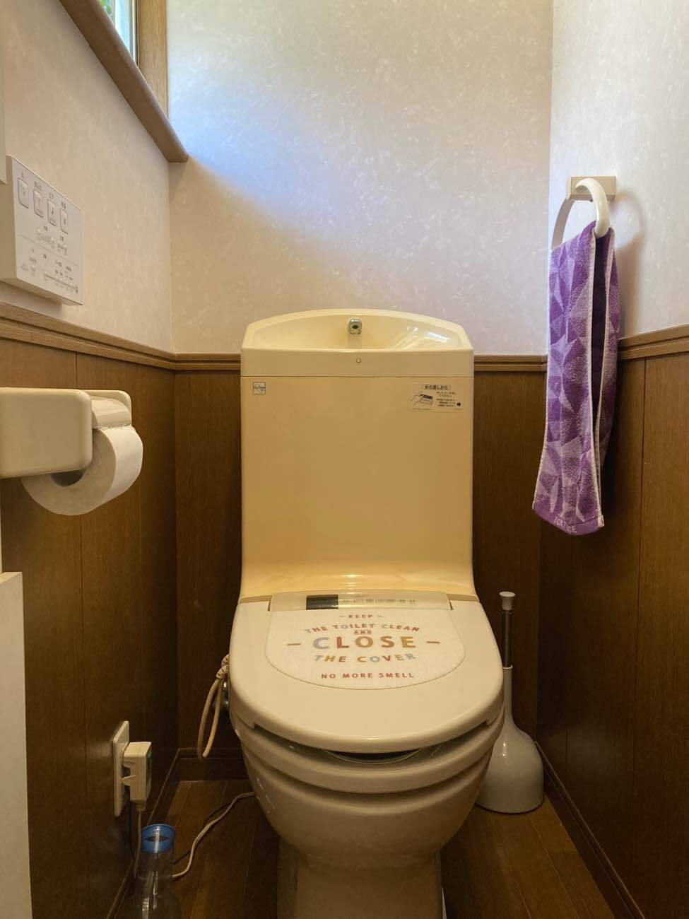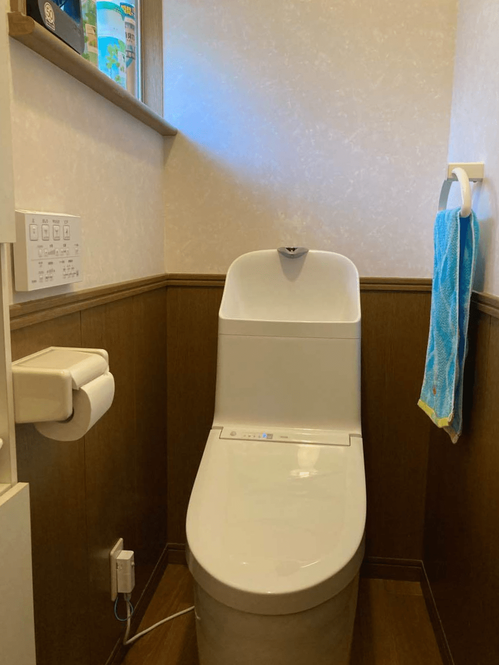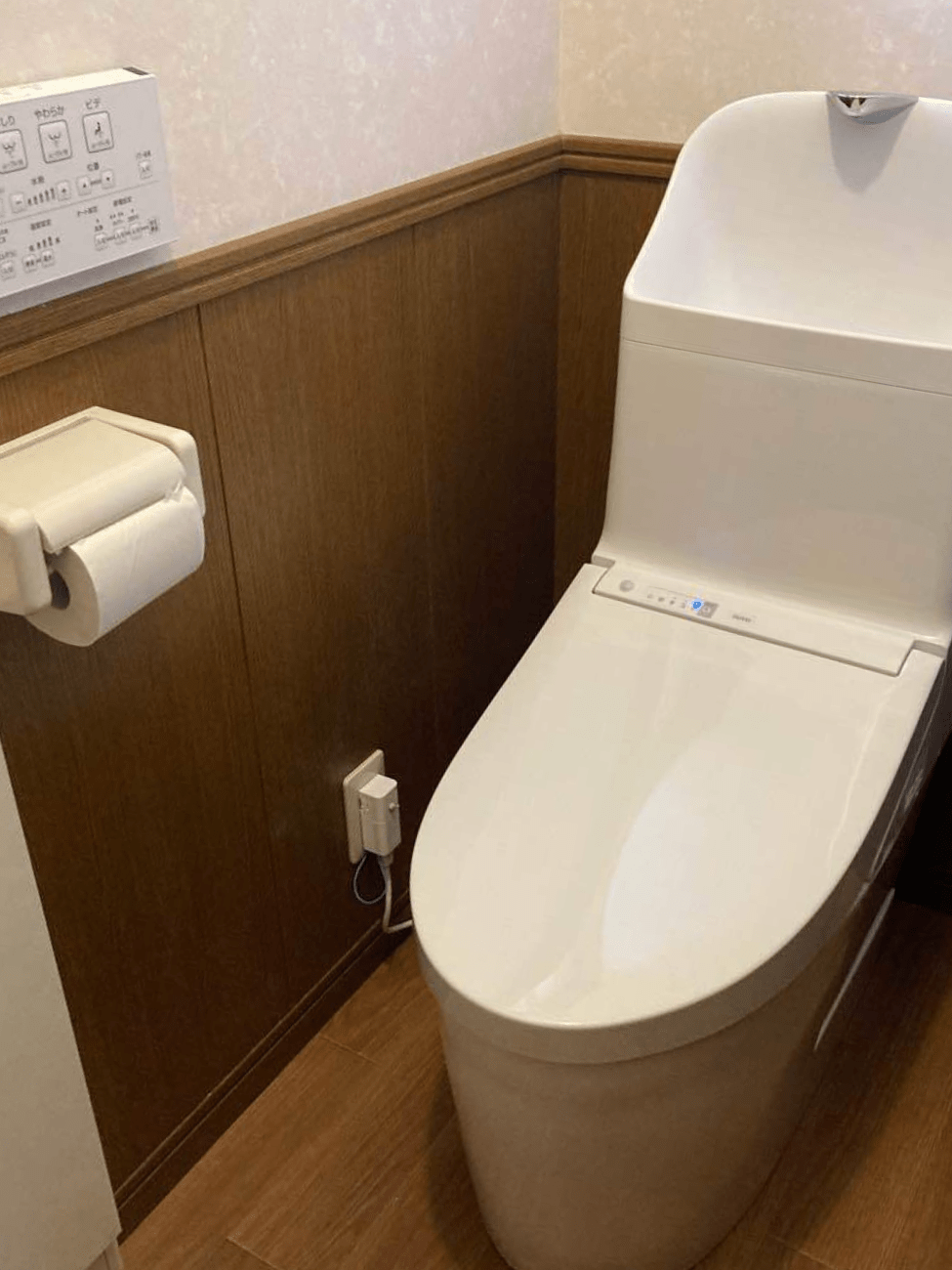 トイレの床がフローリングであり、お掃除がしにくくトイレと一緒に変えたいとのご相談。トイレと床の隙間やその付近の床に水滴などが染み込むことによって黒ずんでおり、その点を気にされていたため、床はフローリングではなくお掃除のしやすいクッションフロアでご提案。色味等は、長年付き添っておられたフローリングに似ている木目調をセレクトしました!