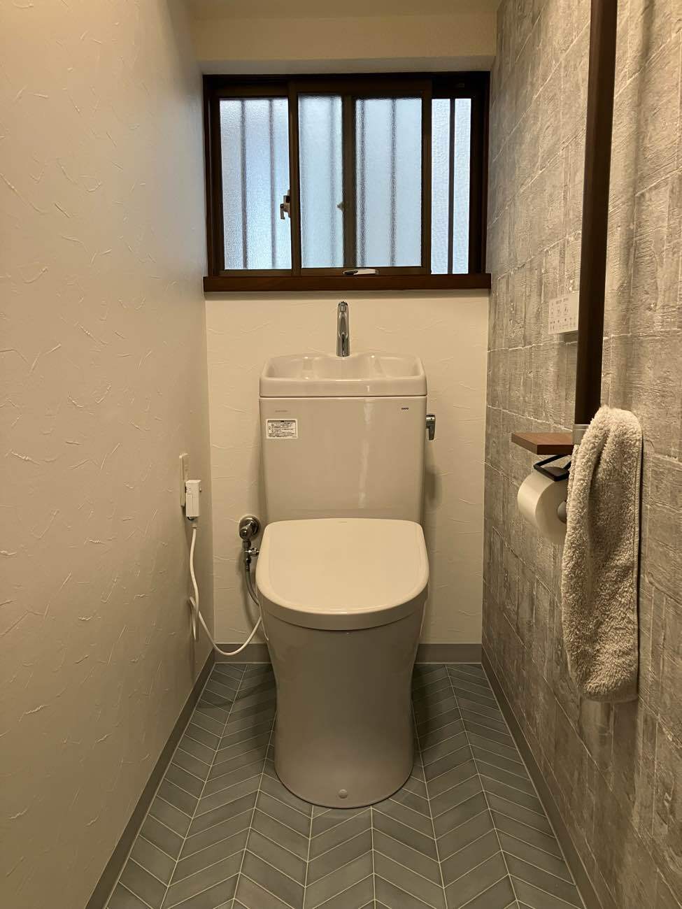 年数が経っており、トイレのリフォームを考えられていたため、ご相談いただきました。最初の打ち合わせでは、理想はタンクレスのトイレに手洗いを別でつけるトイレであることでしたが、部屋の横幅的には狭くなるかもしれないと気にされていました。そこで弊社の強みでもあるVRでご提案させていただきました。実際にVRでトイレの空間の感覚を体感していただくと狭く感じることが分かりました。なので、現状と同じ手洗いがついたタンク式のトイレを選ばれることに!また、内装に関しては今のクロスが気に入っていないとのことだったので、好きな柄や雰囲気をお伺いして、クロスとクッションフロアのサンプルをご用意し好きなデザインを選んでいただきました。リフォーム後は自分で選んだ空間が実現し、これを選んでよかったと言っていただけ、ご家族のこだわりのトイレに仕上がりました!