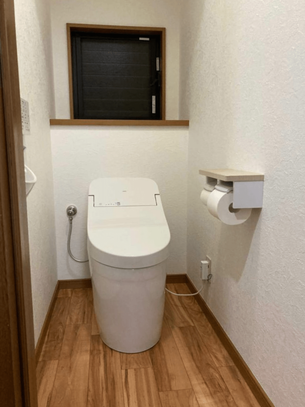 スッキリとお掃除のしやすいトイレになりました。手洗器付キャビネットの色とペーパーホルダーの棚の色を合わせ、床のクッションフロアとのバランスもとても素敵なトイレになりました。ウォシュレット操作や洗浄も壁付けのリモコンでおこなうことができるので、操作も楽にできます。クロスやクッションフロアもお好みのデザインをお選びいただき、こだわりの詰まったトイレになりました。