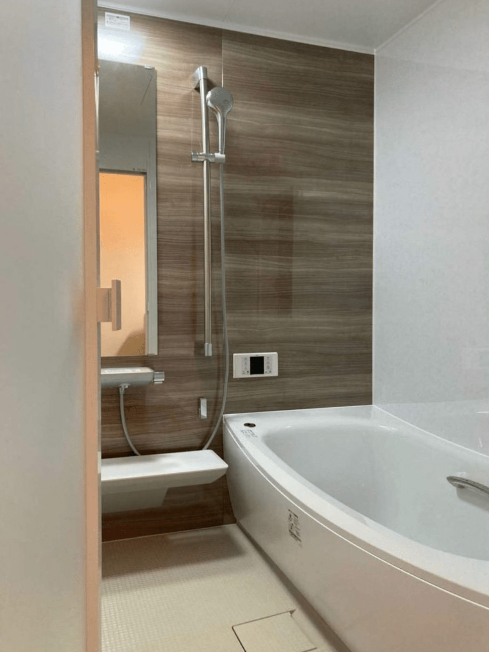 掃除がしやすく使いやすいお風呂になりました。シャワーの高さも手すり兼用のスライドバーで自由に調整することができます。壁柄は一面木目調のものをお選びいただきましたので、落ち着いた印象のお風呂になりました。洗面台のキャビネットも木目調にされましたので、統一感のある空間になっています。ゆっくりとくつろげるお風呂になりました。