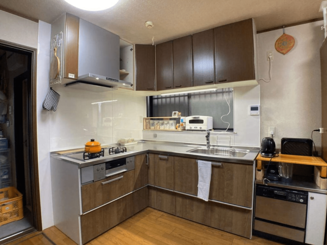 キッチンの開き扉を閉めると合わなくなってしまうとのことで、引出しのキャビネットにしてより使いやすく多くの収納をしたいというご希望でした。シンクが小さく少し不便に感じているとのことで、大きめのシンクにしたいとのご要望がありました。キャビネットの色のご希望はないとのことでしたが、吊戸棚は現在お使いのものを使用したいとのことでしたので、既存の吊戸棚と合わせても違和感のない、濃い色の木目調のカラーをご提案させていただきました。