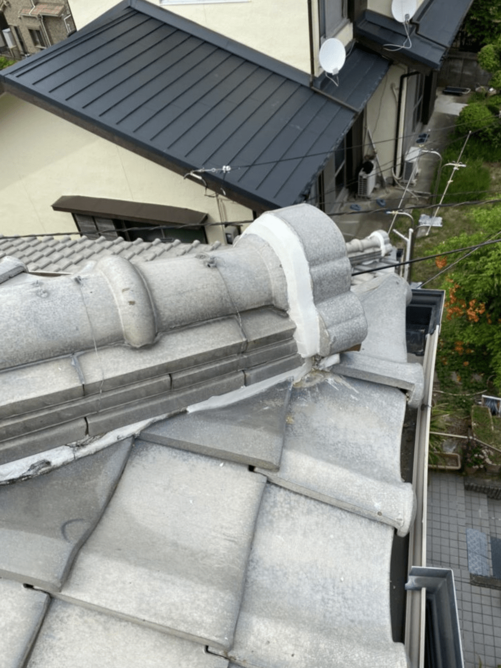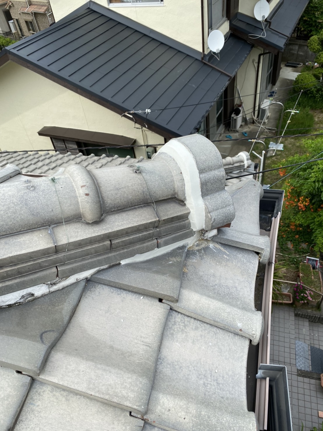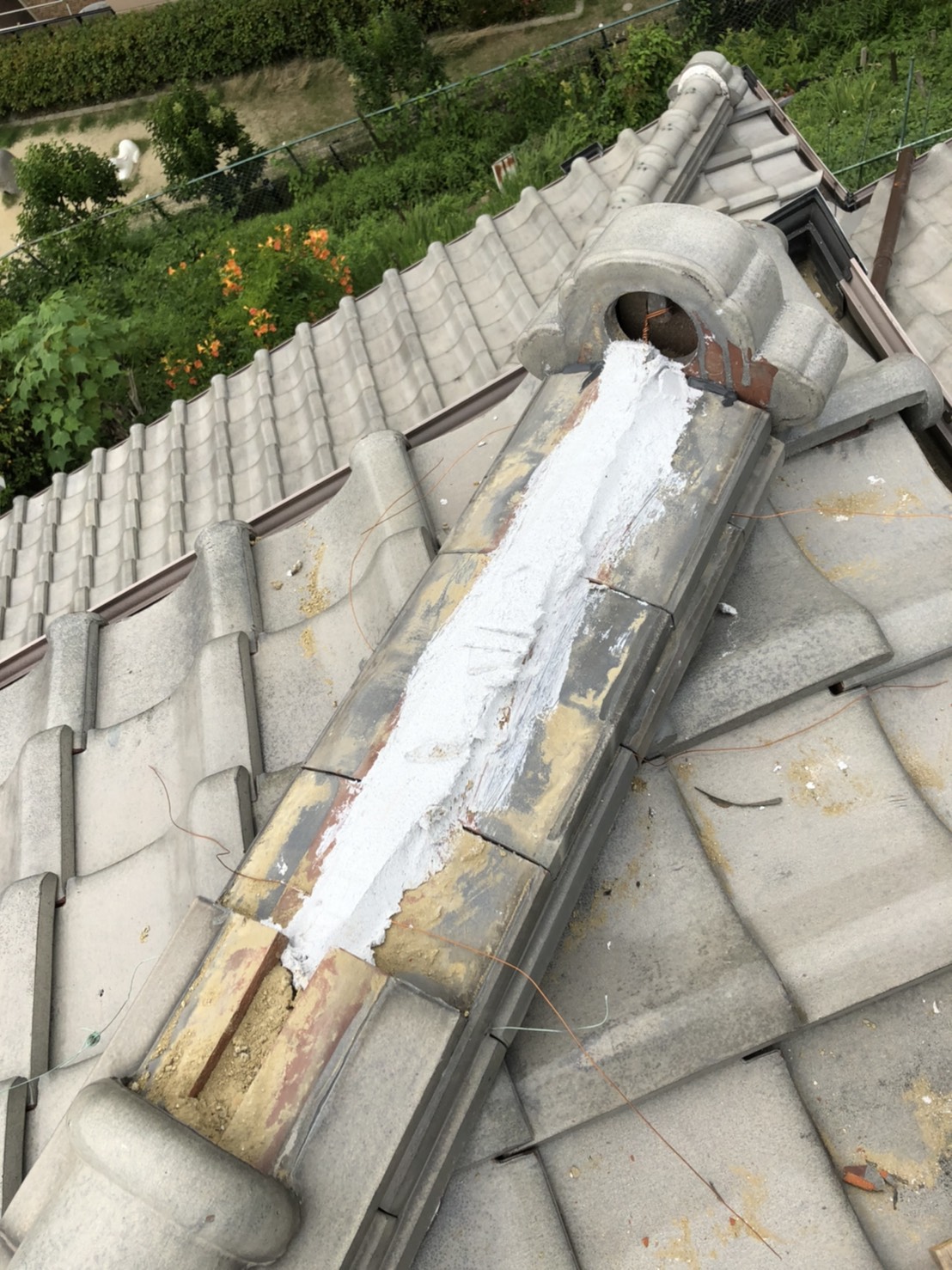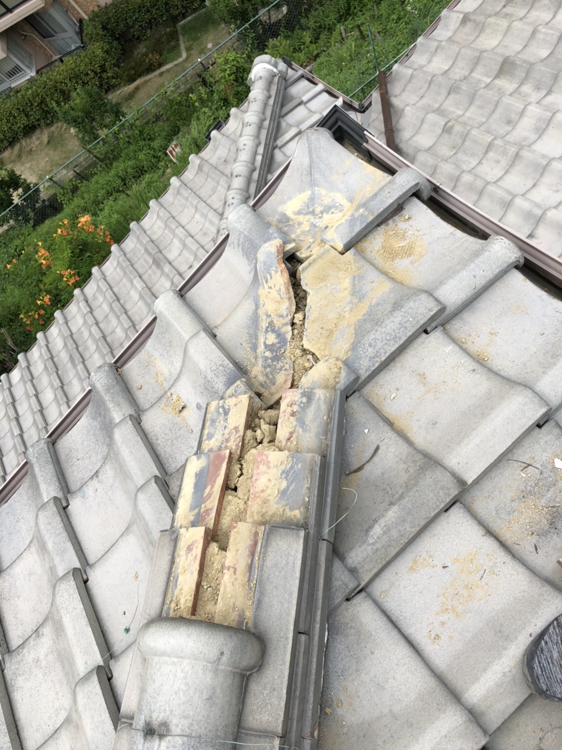 屋根診断後、鬼瓦の復旧、漆喰の補修、樋の傾斜調整、全体的な清掃を保険請求含めてご提案させて頂きました。