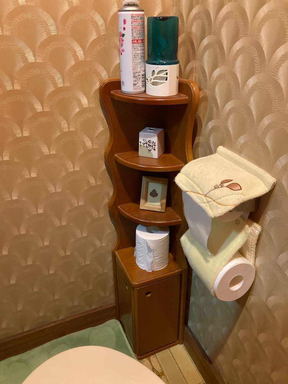 空間を確保するため今ご使用のものを全て1ヶ所にまとめられるようにコーナーキャビネットをご提案しました。取付に関しては扉を開けた時や便座に座った時に視界に入らないよう座って左後方へ設置したことで圧迫感もなくなりました。便器の取付に関しては給水栓を便器内に隠蔽することで掃除がしやすくスッキリとします。またクロスやクッションフロアも拘られアクセサリーの色味と合わさり明るく温かみのある雰囲気の空間になりました。
