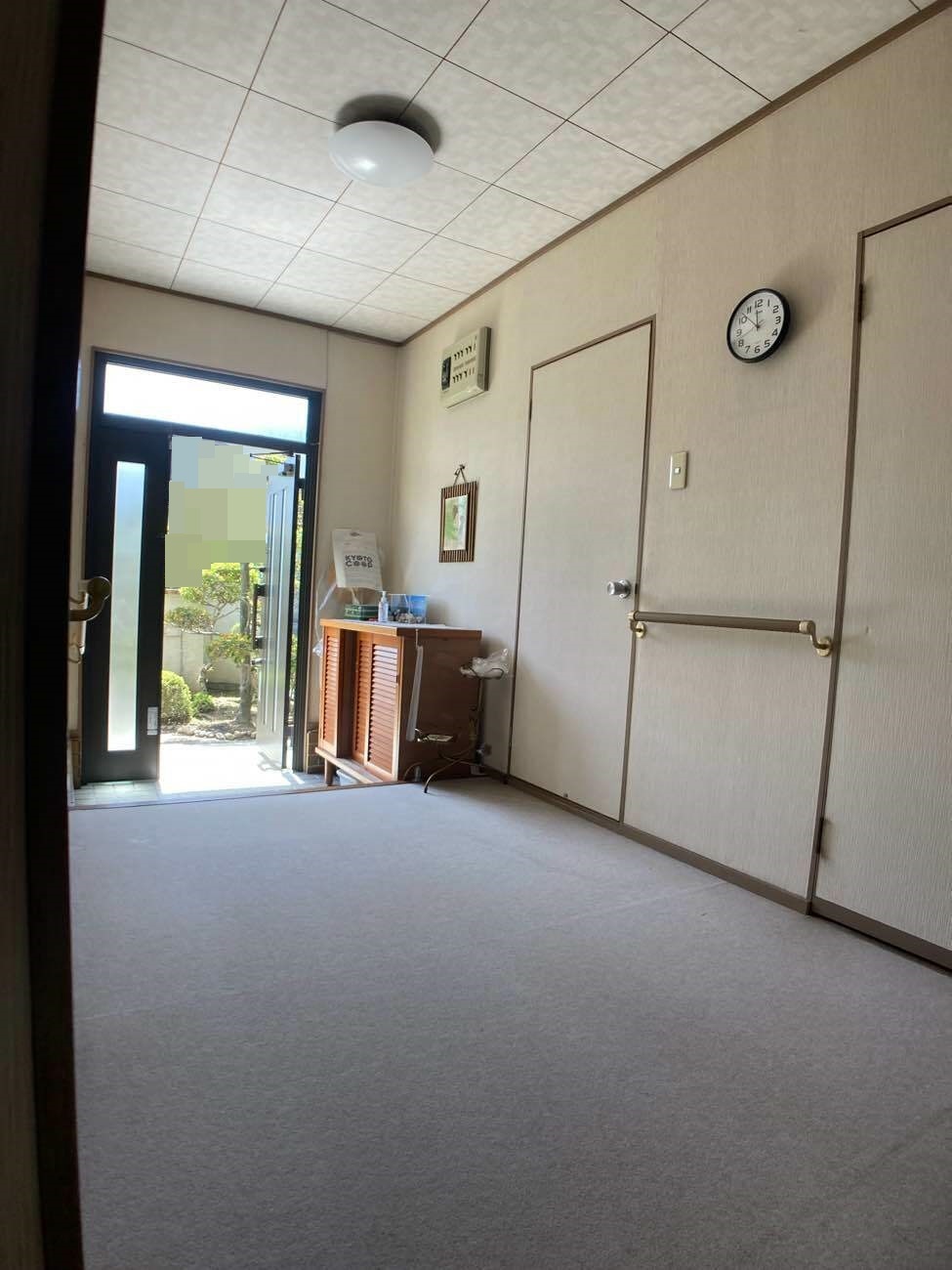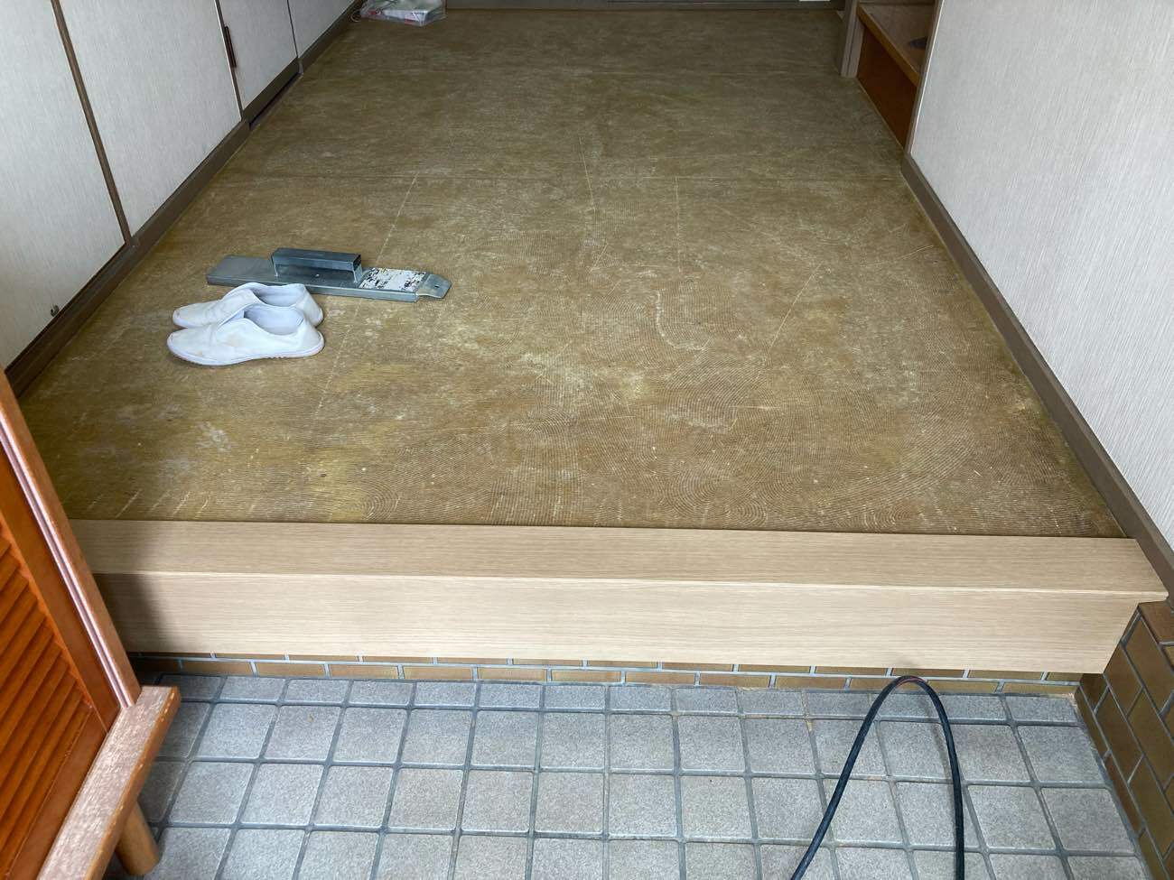 玄関前の床が複数ヵ所、経年による床板の劣化で沈みがあり床が抜けてしまわないかご不安に思われていました。また、欄間があり光を多く取り込むことができる玄関空間は晴れの日は明るく日差しが入り暖かいことや、フェルト製の床は触れてもひんやりせず、ちょっとした作業をするのにお気に入りの空間とのことでした。床の補強+タイルカーペットにすることも提案しましたが、強度や床の清掃性を考え思い切ってフローリングにすることをお決めになりました。