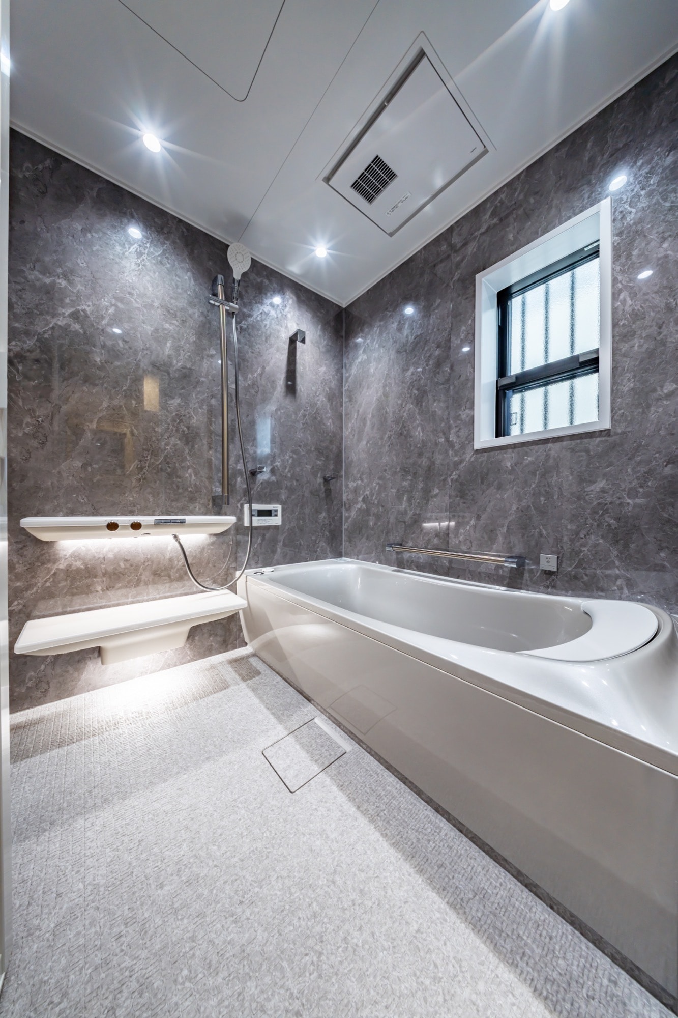 浴槽は広々としたタイプを選定し、落ち着いた色合いでリラックスできる空間に仕上げています。