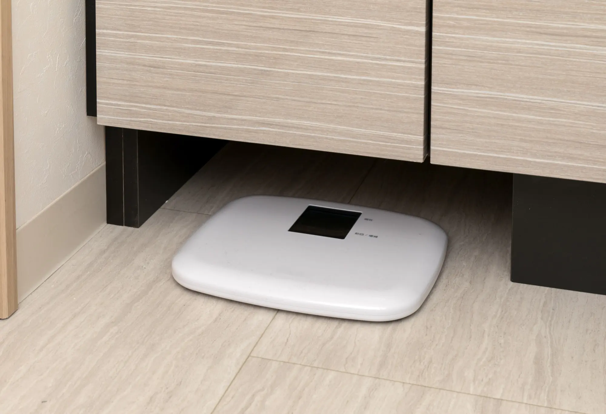 引き出しと開き扉を併せ持っていたり、足元に体重計が収納できるようになっていたり、