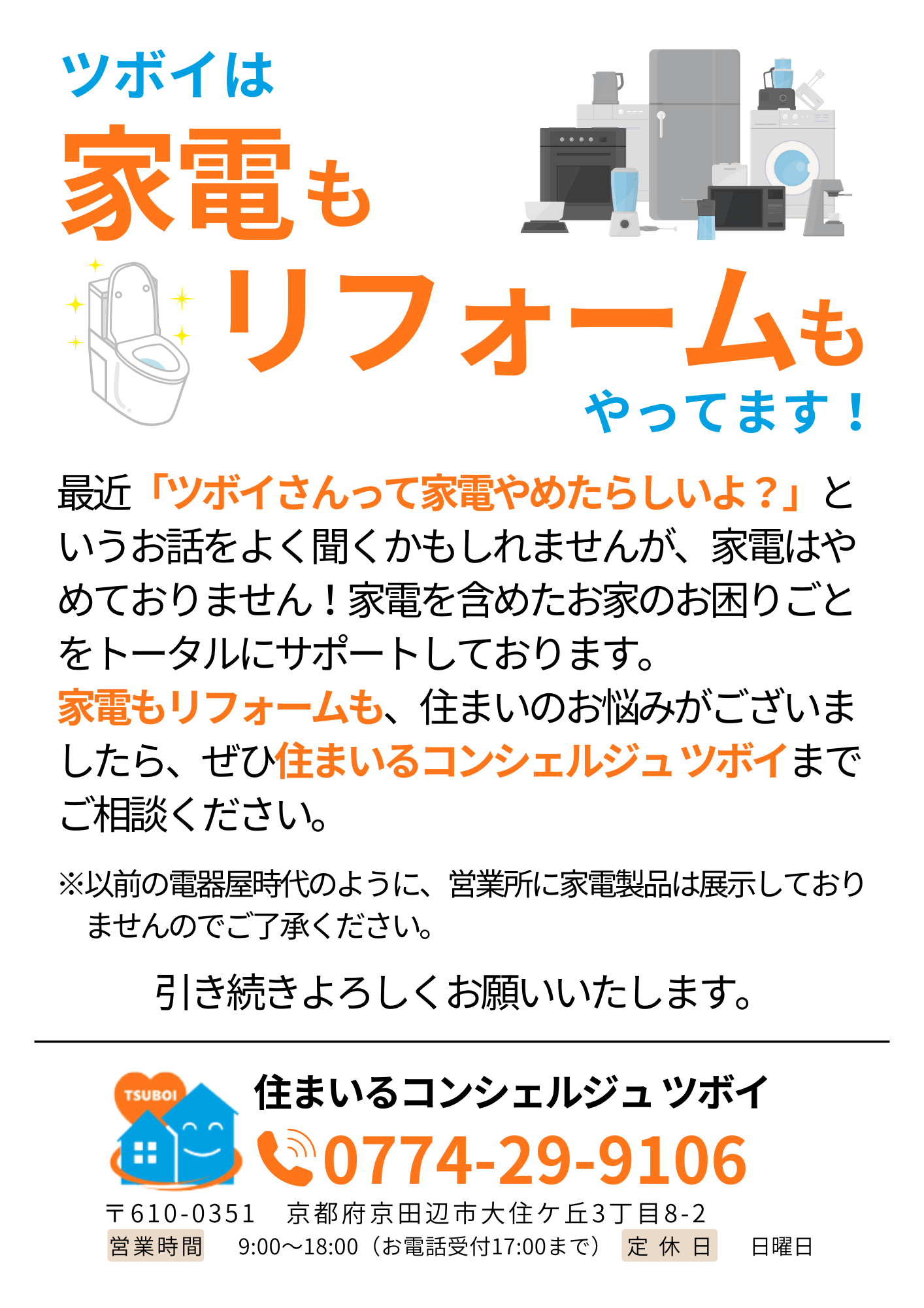 確かに過去は家電製品しか取り扱っていませんでした。その後2012年からは、兼ねてからご要望の多かったリフォーム事業を開始し、近年は住まい全般のお困りごとを解消するサービスの一部としてリフォーム・家電ともに現在もおこなっておりますことをこの場をお借りしてお伝えさせていただきました。