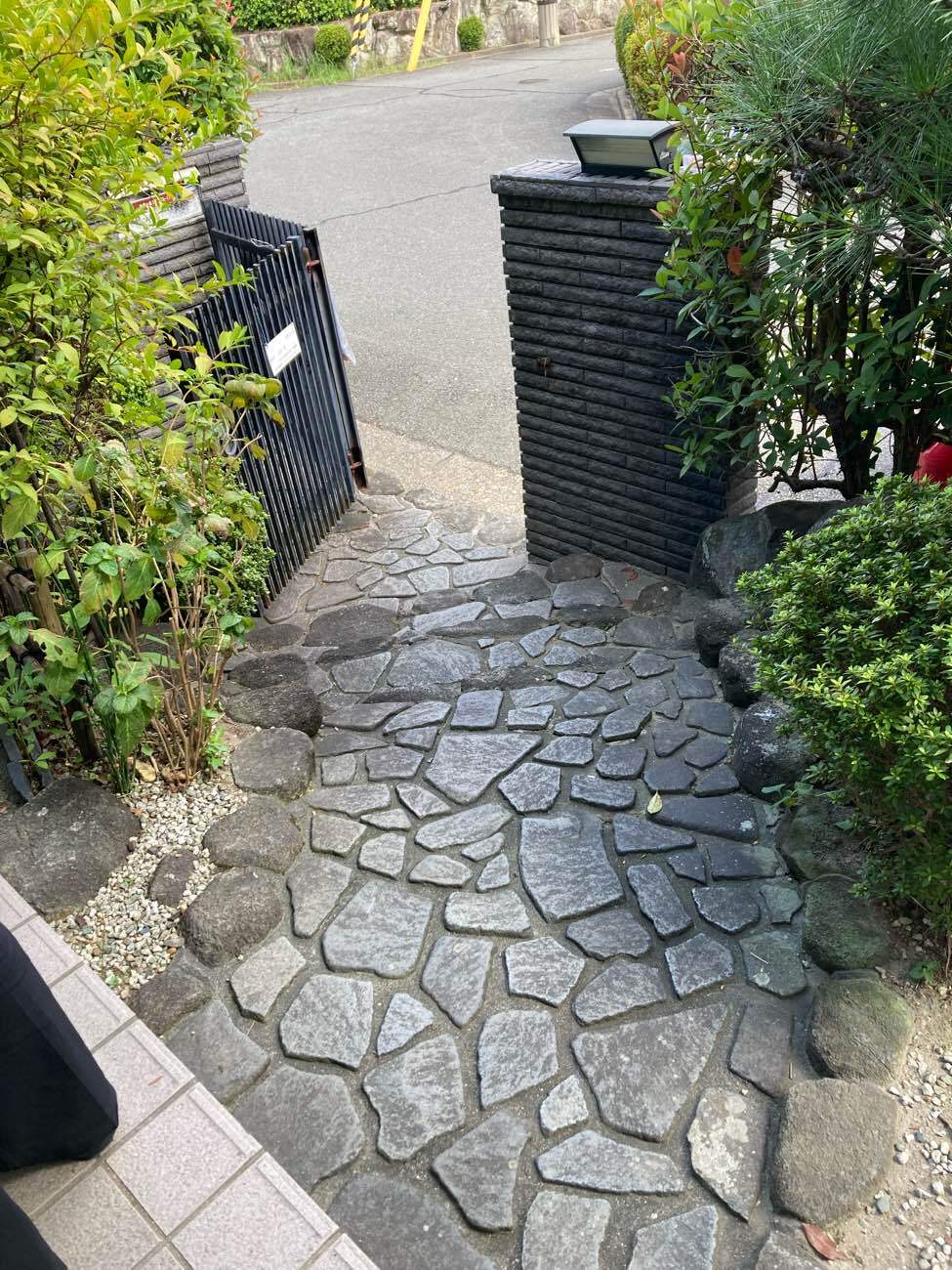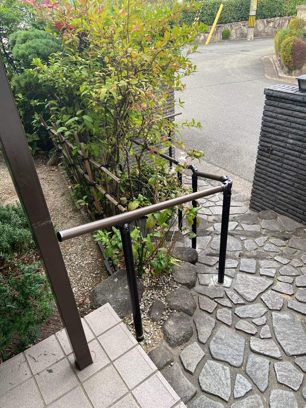 奥様が玄関外の階段を降りようとしたときに、転倒されたことがきっかけで手摺の設置を考えているとご相談を受けました。
