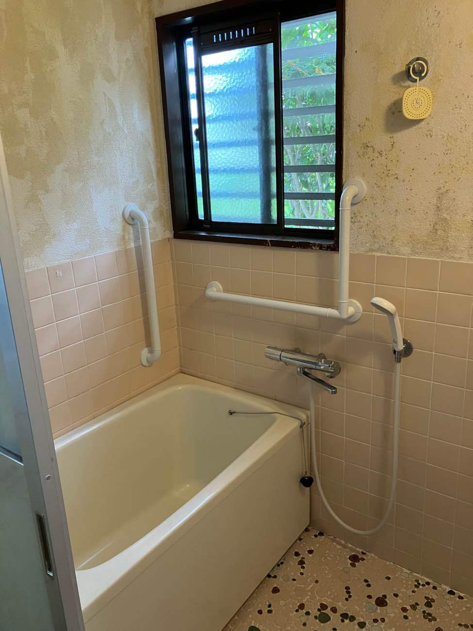 玄関の手摺設置と同時に、浴室の出入り、浴槽の出入りにも不安があるとのことで、浴室にも手摺の設置の工事を行いました。京田辺市の補助金も活用し、お客様からも「すごく快適!不安もないし、こんなに快適に過ごせるならもっと早くすればよかったと思うぐらいです。」と大変喜んでいただけました!