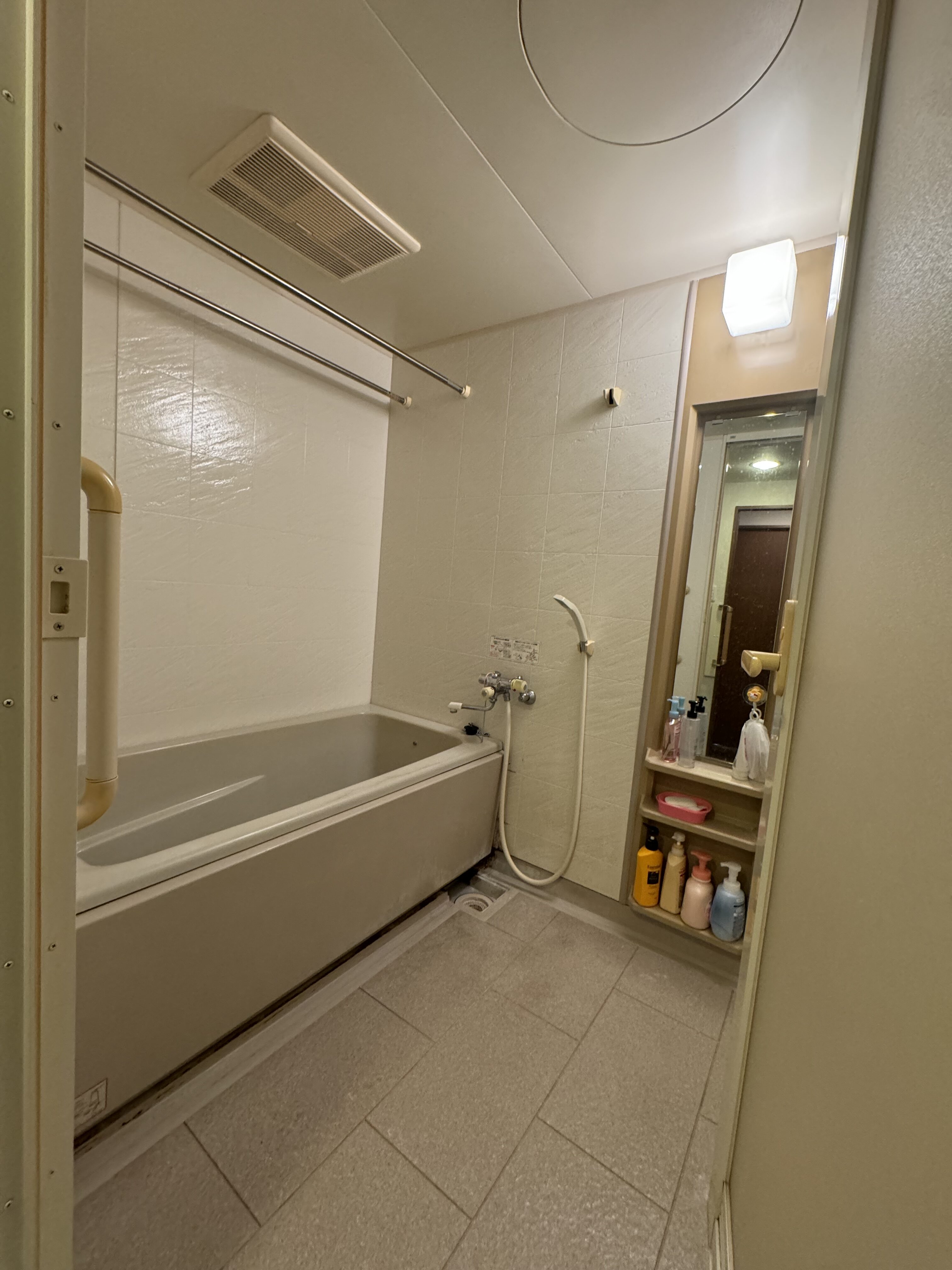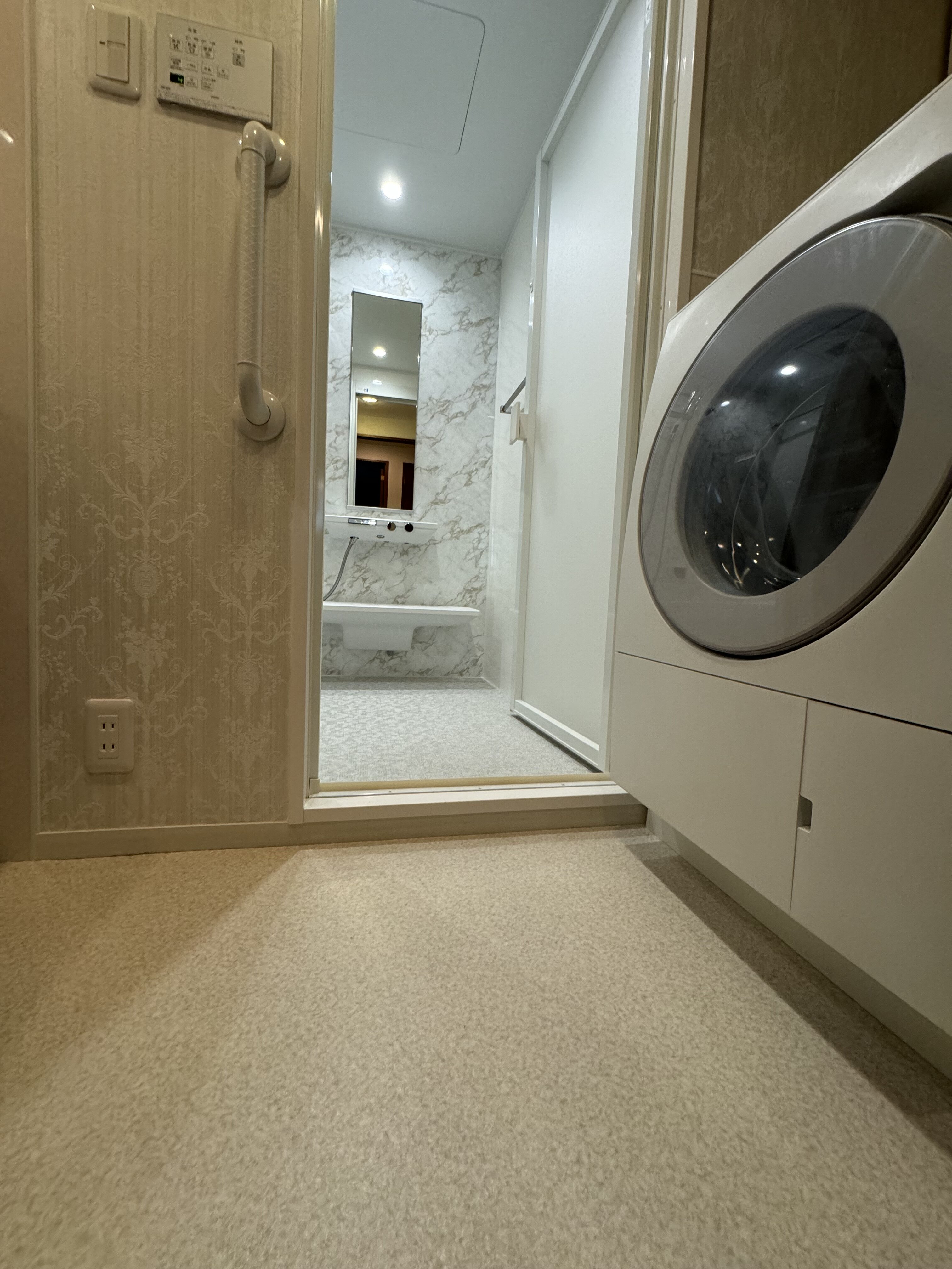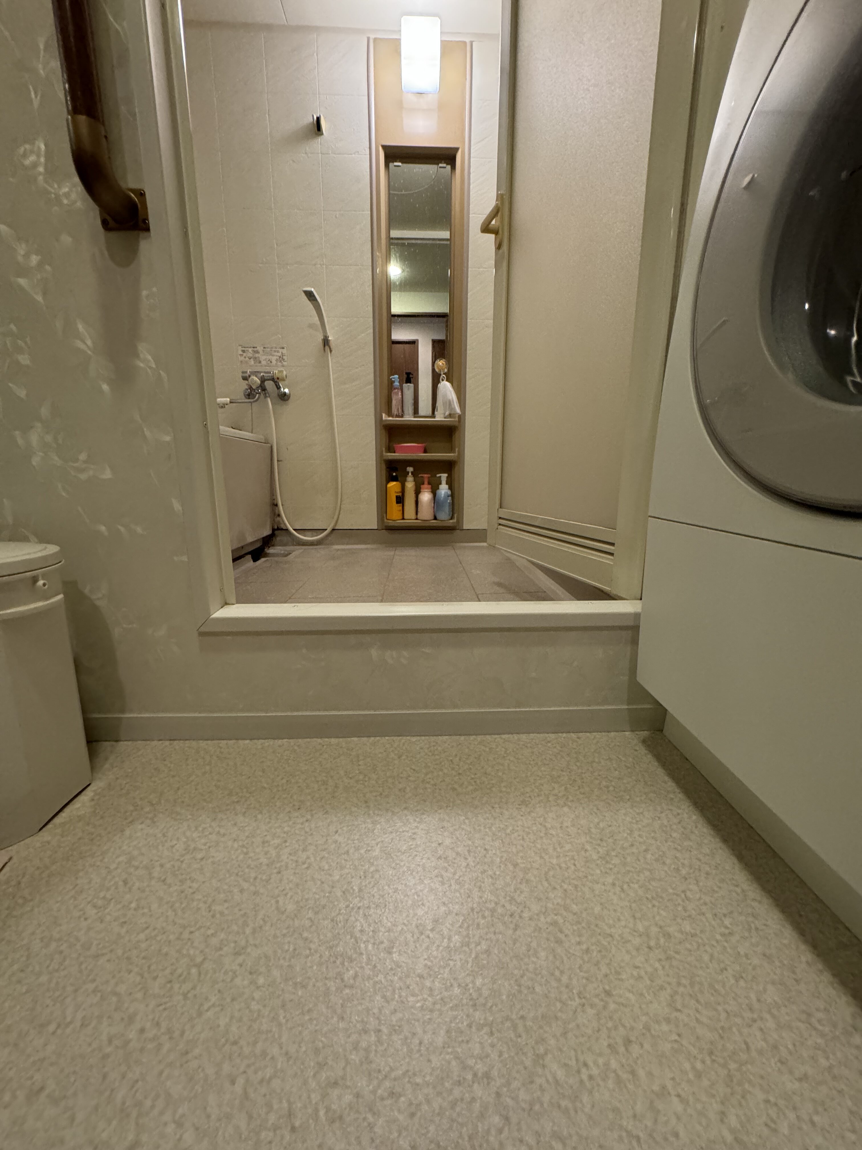 お客様は、「お仕事で疲れた身体を癒したい」とのご希望をお持ちでした。また、ご両親の介護経験から、段差解消や手すりの配置を見直し、安全性を高めたいというご要望もありました。さらに、壁の色を自分好みに変えたい、掃除を楽にしたいという具体的なご要望もいただきました。