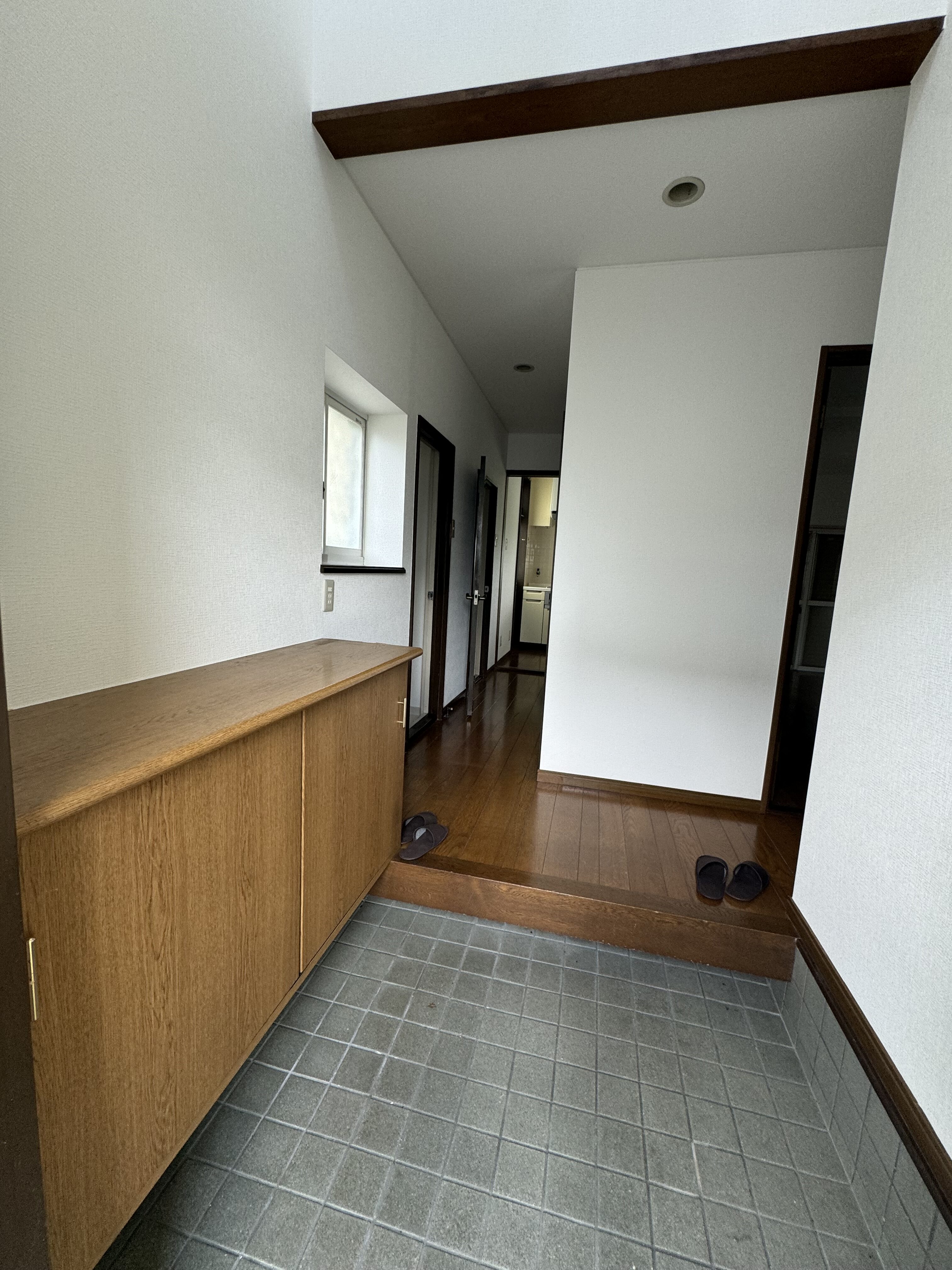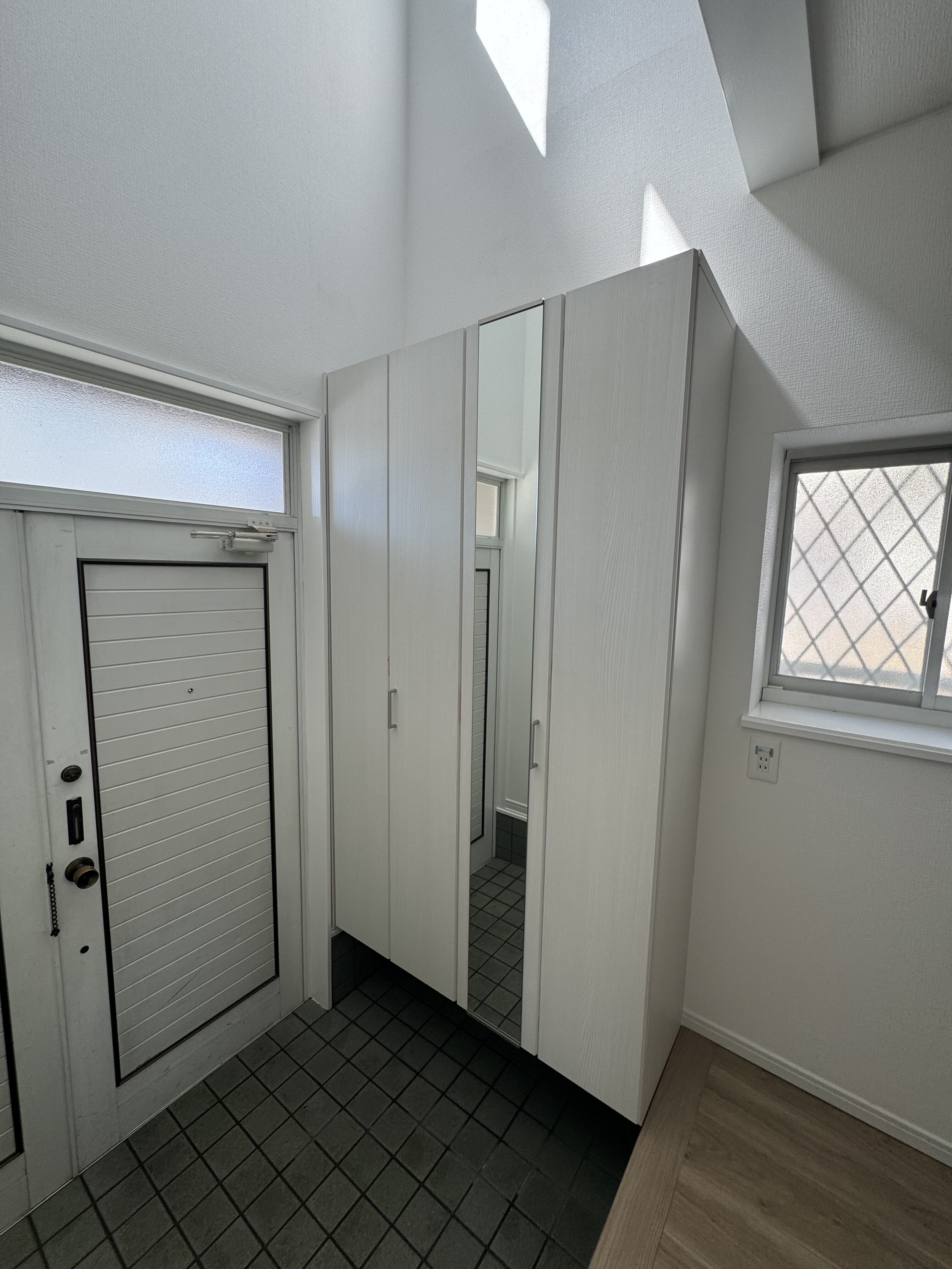 収納力を確保するために、ブーツも収納可能な大容量のクロークボックスを設置。さらに、室内を明るくするため、建具を白色に塗装し、コンセントやスイッチをPanasonicアドバンスシリーズに変更して、おしゃれで機能的な空間にしました。