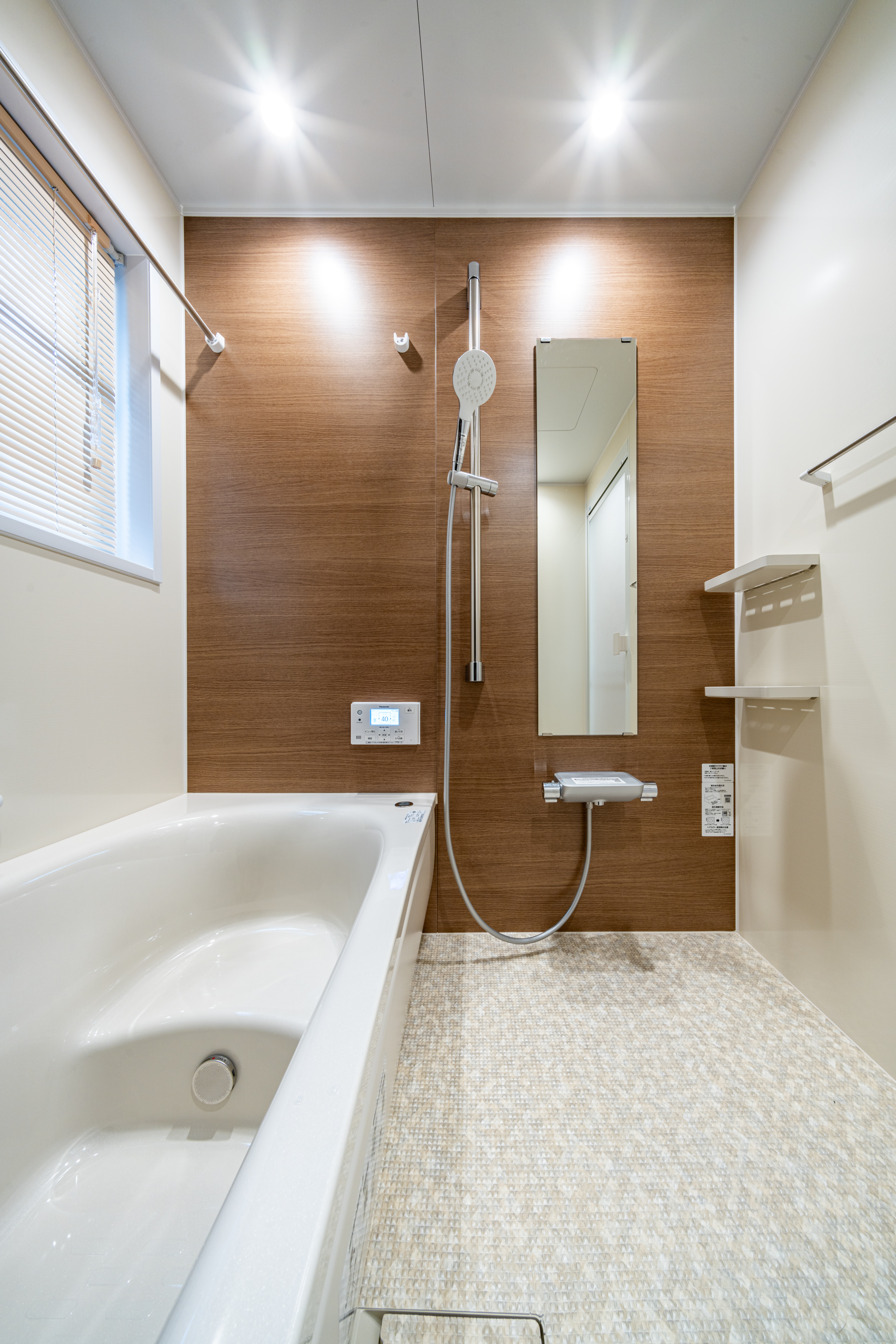 また、奥様の光るセンスで内装にも力を入れました。ベージュっぽい落ち着いた雰囲気がお好きとのことをお聴きし、どのような色味やデザインが合うか何度もご一緒に考えました。水廻りと内装も共に一気にリフォームすることで、浴室のパネルの色や脱衣場、トイレ空間もかなり統一感のあるものになりました♪浴槽の色、浴室のブラインドもベージュに合わせたのも奥様のこだわりポイント!