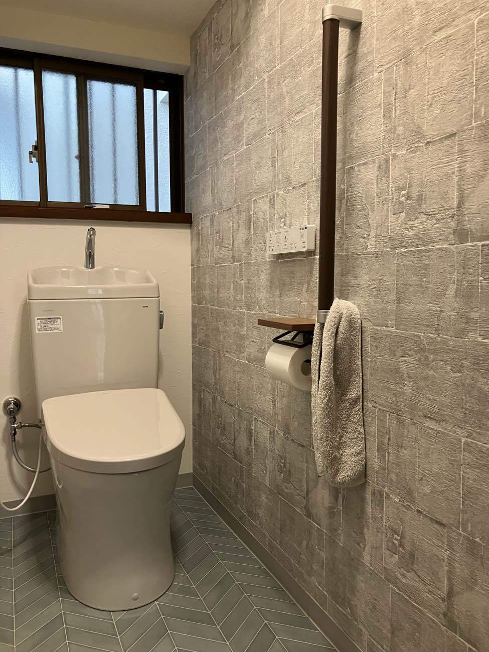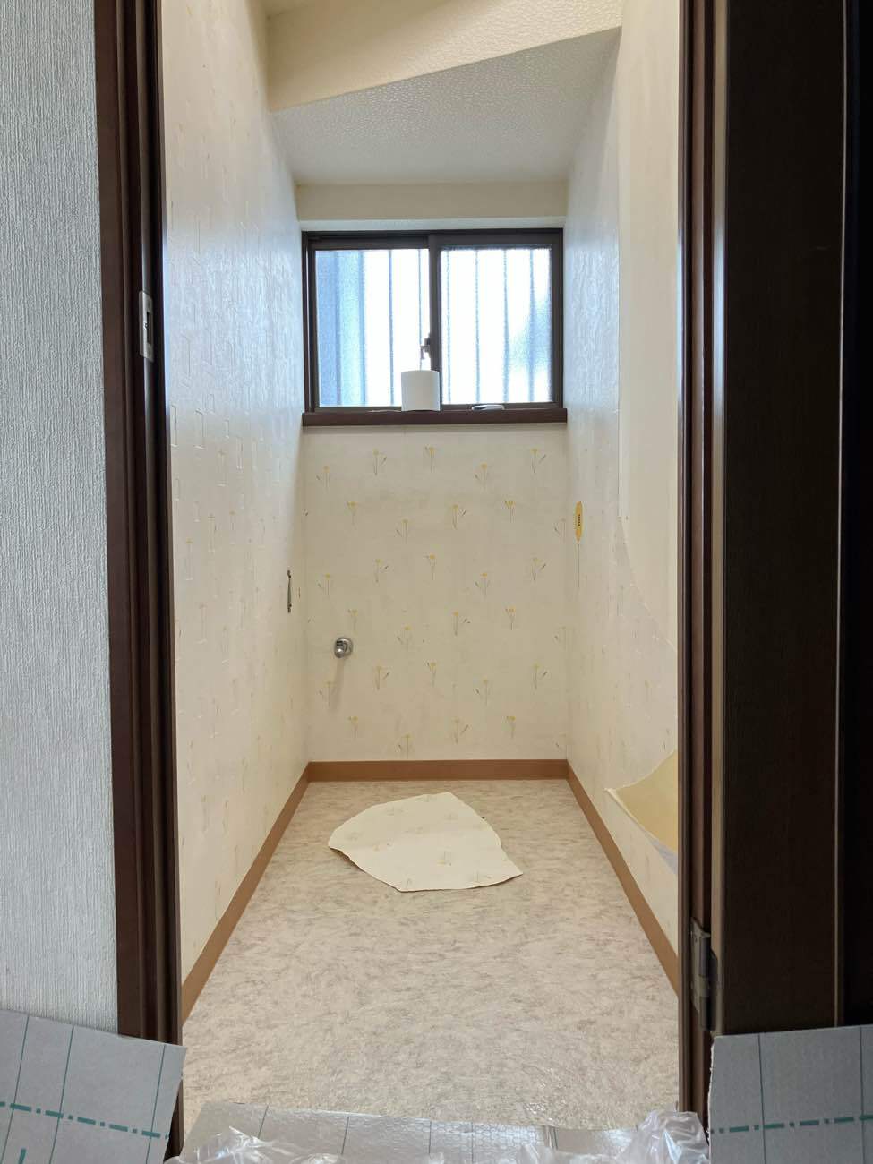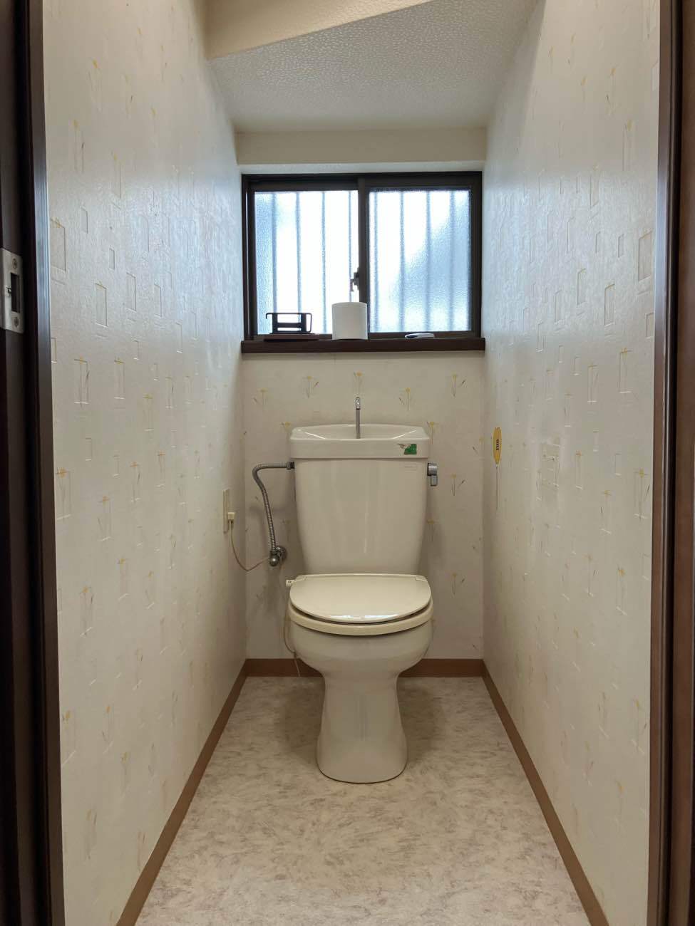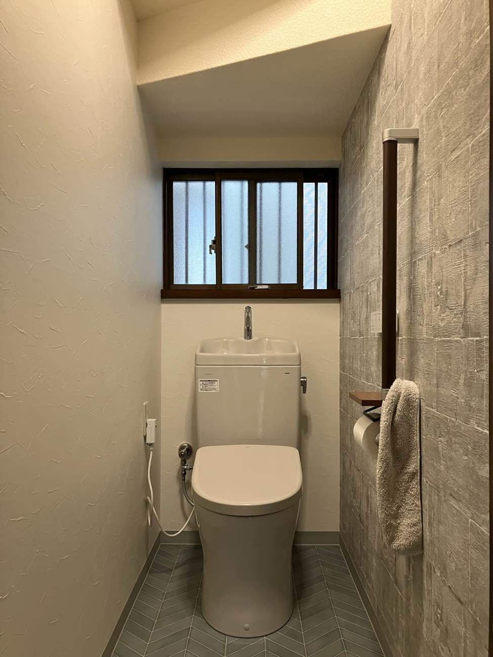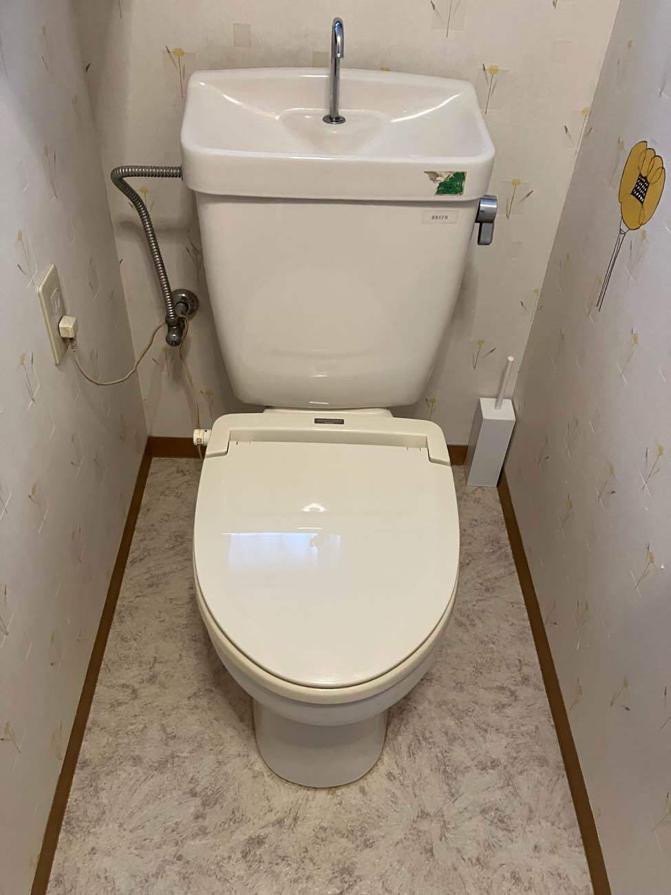 年数が経っており、トイレのリフォームを考えられていたため、ご相談いただきました。最初の打ち合わせでは、理想はタンクレスのトイレに手洗いを別でつけるトイレであることでしたが、部屋の横幅的には狭くなるかもしれないと気にされていました。そこで弊社の強みでもあるVRでご提案させていただきました。実際にVRでトイレの空間の感覚を体感していただくと狭く感じることが分かりました。なので、現状と同じ手洗いがついたタンク式のトイレを選ばれることに!また、内装に関しては今のクロスが気に入っていないとのことだったので、好きな柄や雰囲気をお伺いして、クロスとクッションフロアのサンプルをご用意し好きなデザインを選んでいただきました。リフォーム後は自分で選んだ空間が実現し、これを選んでよかったと言っていただけ、ご家族のこだわりのトイレに仕上がりました!