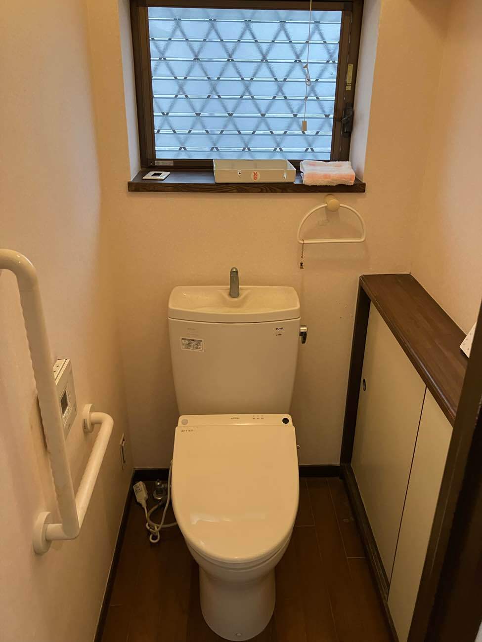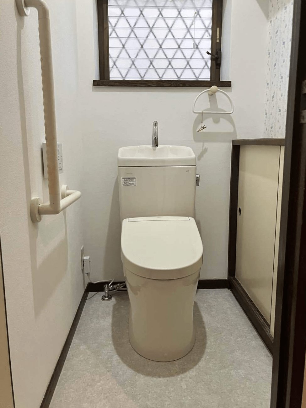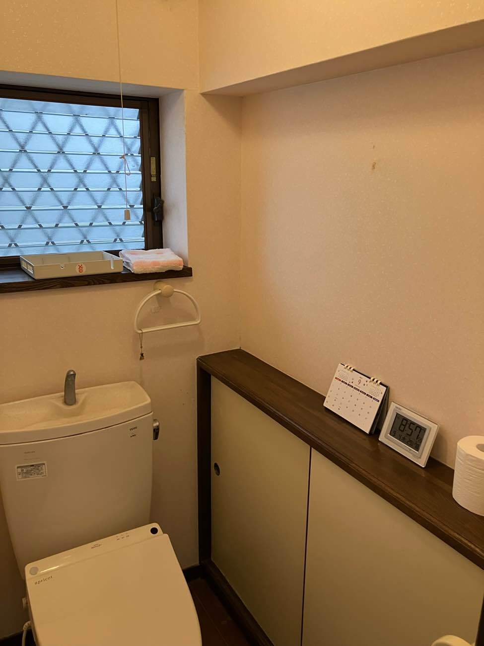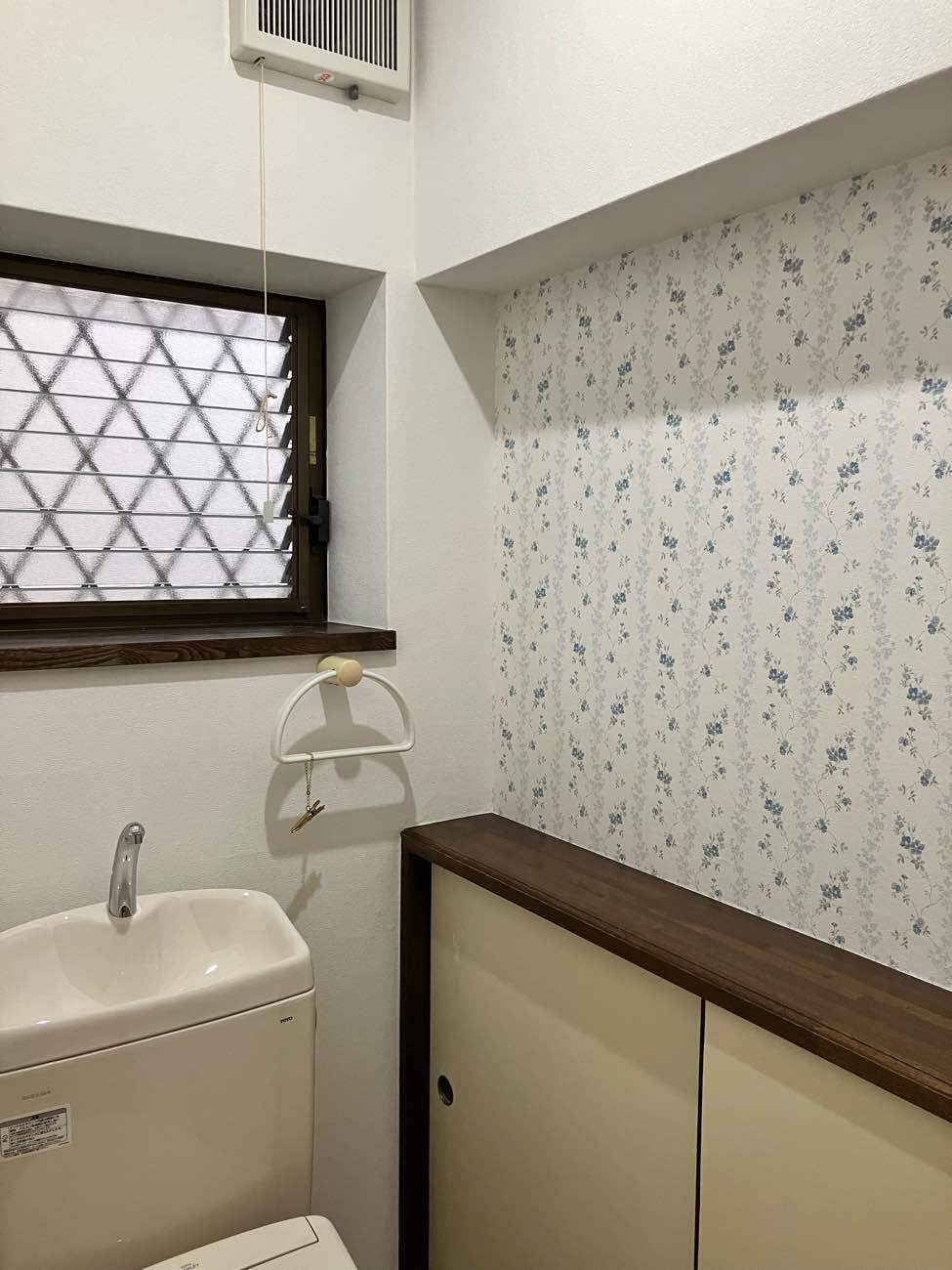 きっかけは、ウォシュレットの故障でした。15年ほど使用されていたこともあり、「せっかくならトイレ本体もクロスも新しくして、空間をスッキリさせたい」とご相談いただきました。今回のリフォームでは、トイレだけでなく、フローリングの上からクッションフロアの上張りも行いました。水回りにより適した素材を使用することで、お手入れもしやすく、より快適に使える空間になりました。さらに、壁の凹凸を活かして青いお花柄のアクセントクロスを採用。シンプルな白基調に映えるクロスなので、毎日使うトイレ空間の雰囲気も明るく華やかに仕上がりました。