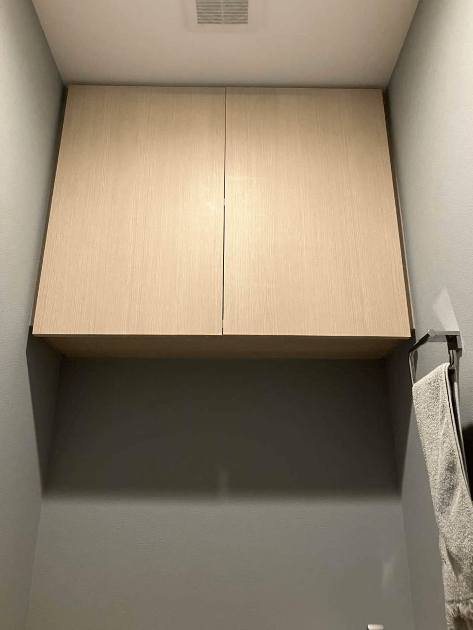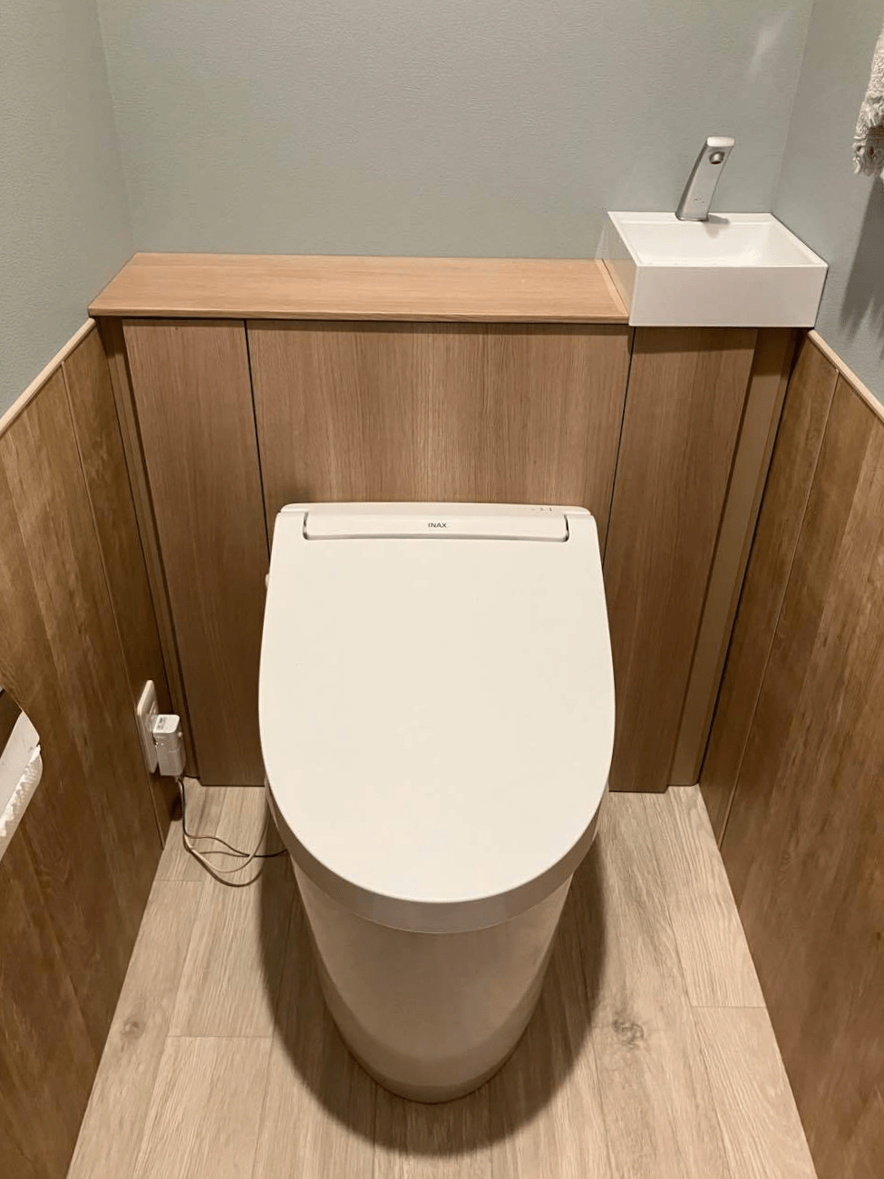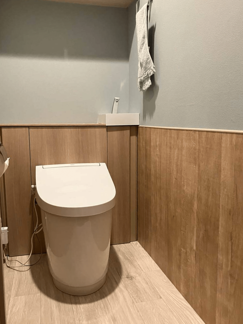 トイレのリフォームを考え中で、内装に関してはすでに理想のイメージがあったお客様。今回選択した商品のキャビネットとパネルは全く同じ柄や色がないため、ご提案時には、弊社営業所にあるVRを使ってイメージを体感していただいたり、サンプルで確認などをして、木目の柄やブルーの色合い等のお打ち合わせを重ねました。その結果、ナチュラルで清潔感のある、木目が素敵なトイレ空間が完成し、施工後には、お客様から「自慢のトイレです」と嬉しい言葉をいただきました。リフォームで、お客様の暮らしに寄り添った理想の空間が実現しました。