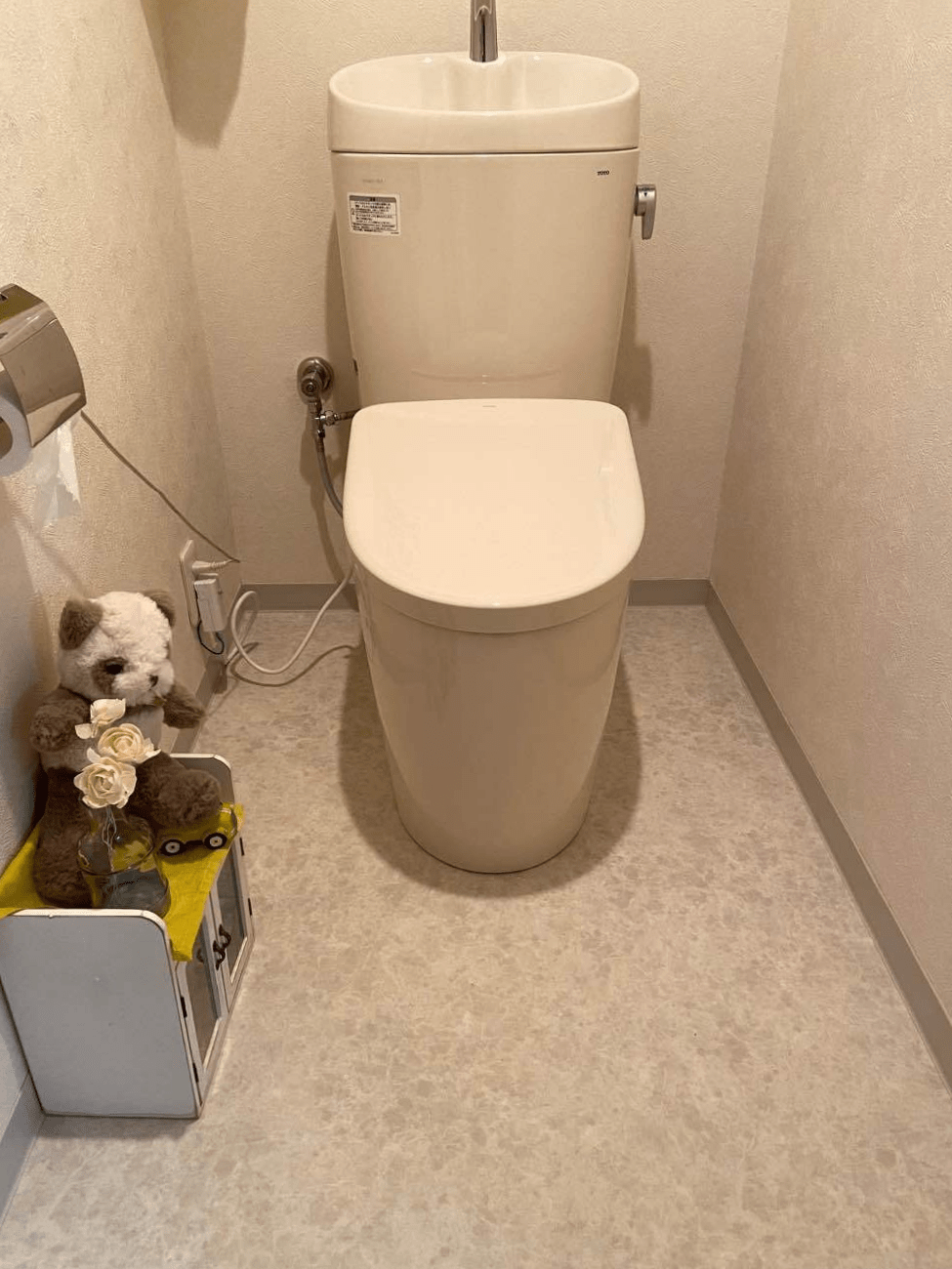 トイレをリフォームするなら内装も!と床のクッションフロアも変更することに!トイレと床を替えることで一気にリフォームした感じが出て「床も貼り替えてよかった。トイレの色と合っているし、この色にして大正解!」と喜んでいただけました。