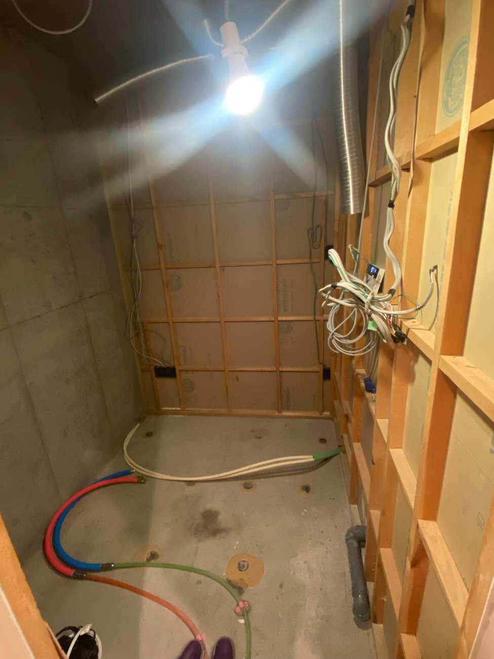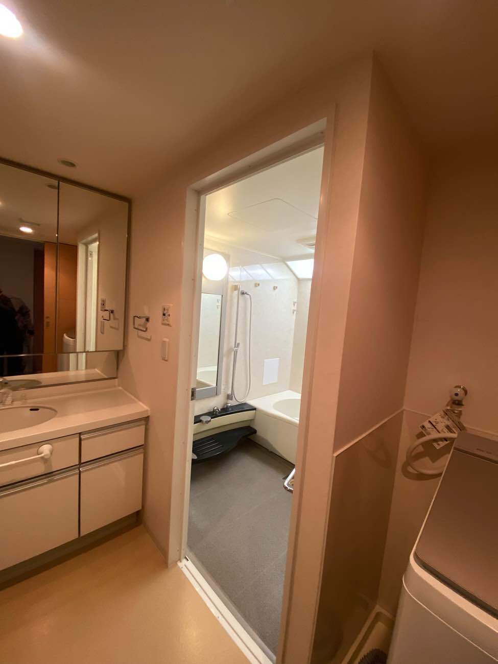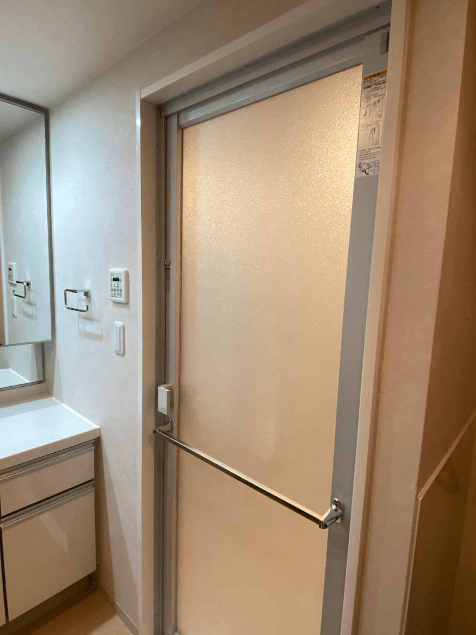 カタログだけではわからない質感や使い勝手等をショールームでは体験することができます。気に入られたカウンターが取り外しできることも体験していただき、「今の浴室のカウンターは床と近い距離に設置されていて、カウンター裏の掃除が本当にしくにいので取り外せるカウンターすごくいいです!」と仰っていました。壁パネルの色や柄は展示されていた【ヘリンボーンミント】を気に入られ、同じ組み合わせでセレクト。また、浴室の扉が設置されている壁は、扉を撤去することで元々のクロスが痛みます。そのため、浴室扉が設置されている面のみクロスを貼り替えました。