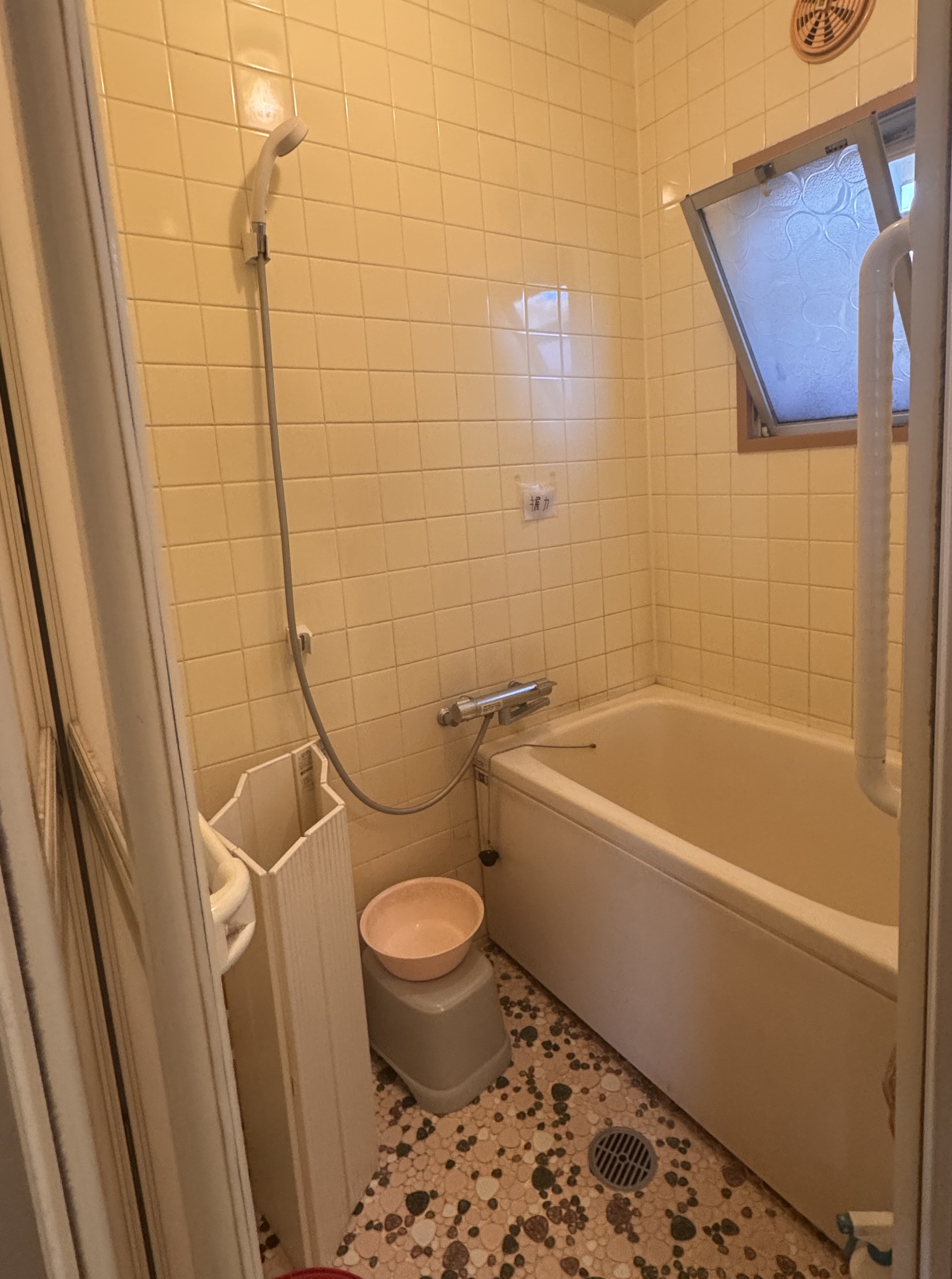 築43年の昔ながらのタイル張り浴室。経年劣化により床タイルが膨れ上がり、見た目だけでなく安全面にも不安がある状態でした。