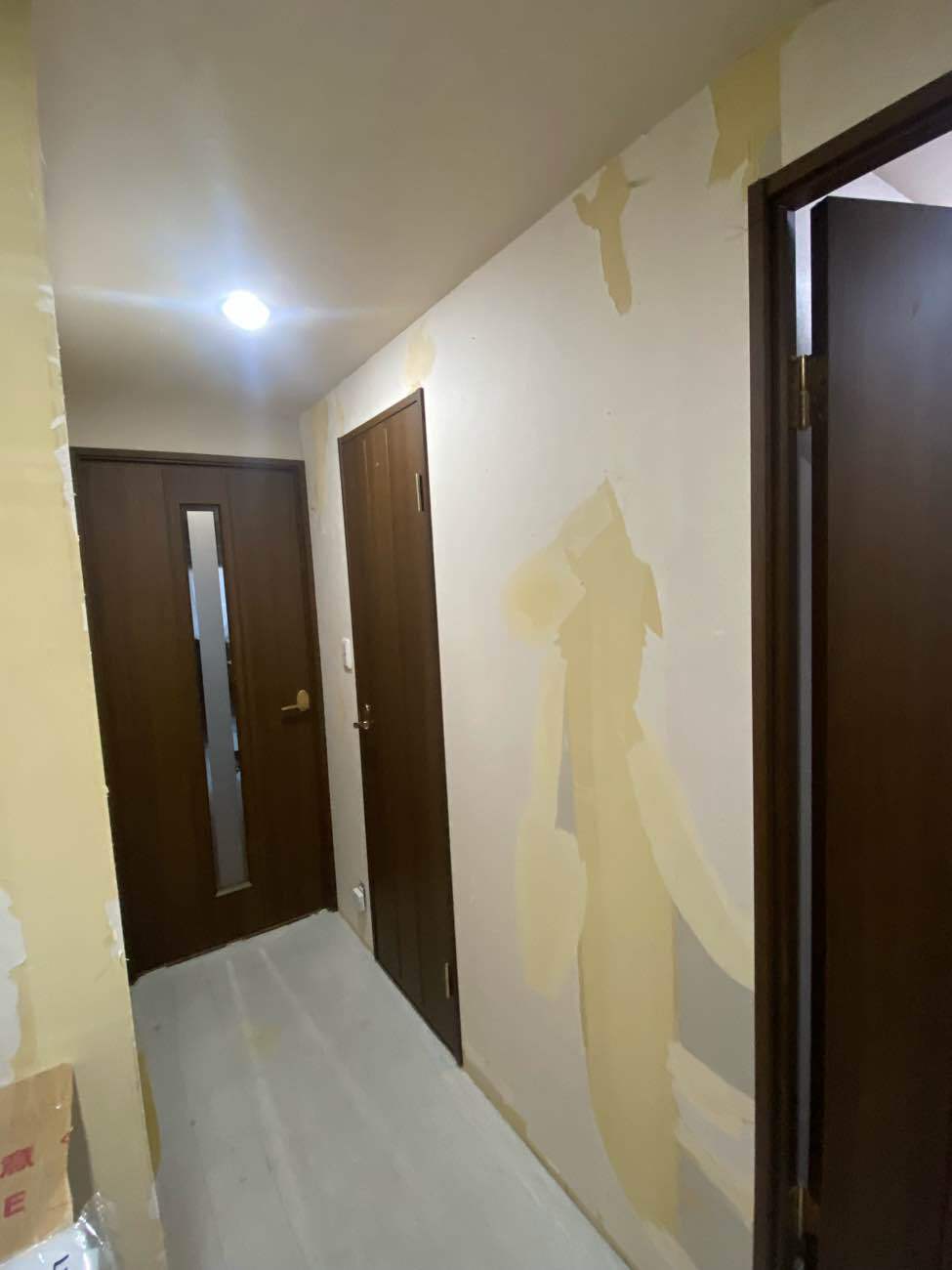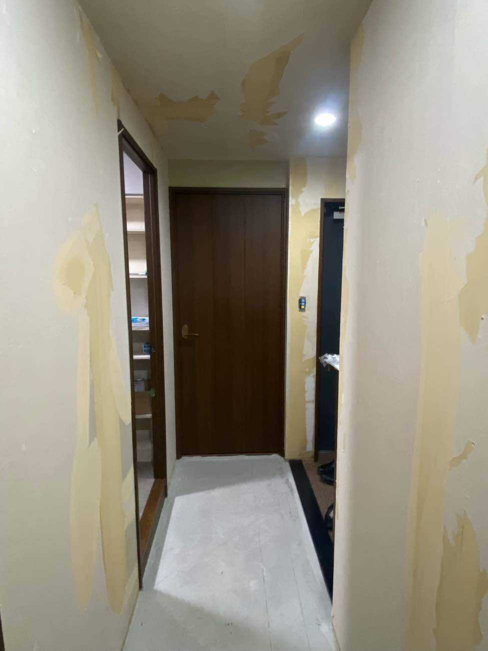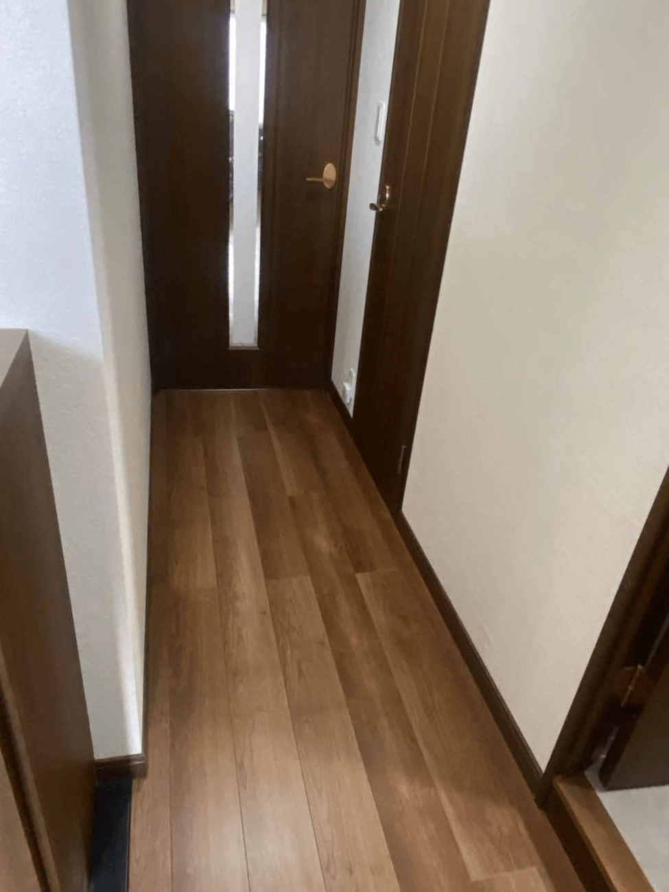 玄関まわりは、FIX窓の付近が特に結露がひどく、窓枠にも結露が発生している状態でした。FIX窓ですので、開け閉めは普段されておらず、採光のための窓でしたが、採光よりも結露をなくしてカビを防ぎたいという思いの方が強くお持ちだったため、思いきって窓をなくすことに!断熱材を壁の中に仕込み、壁を作ることで結露が発生しにくい玄関回りとなりました。また、玄関のタイルも古くなってきて、廊下の床も今回貼り替えをするため、併せて玄関タイルも貼り替えをしました。