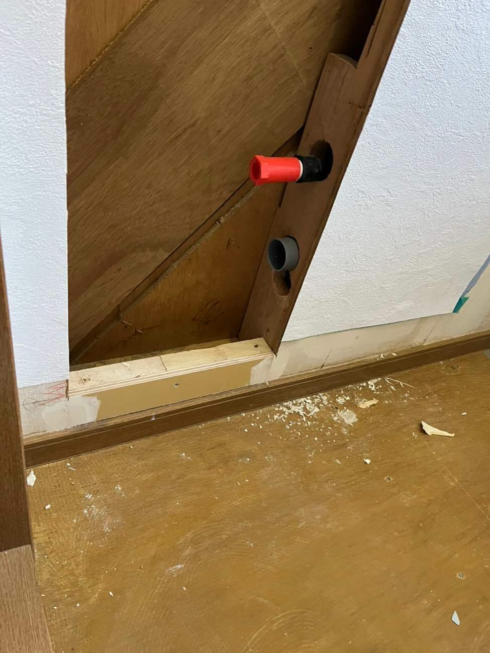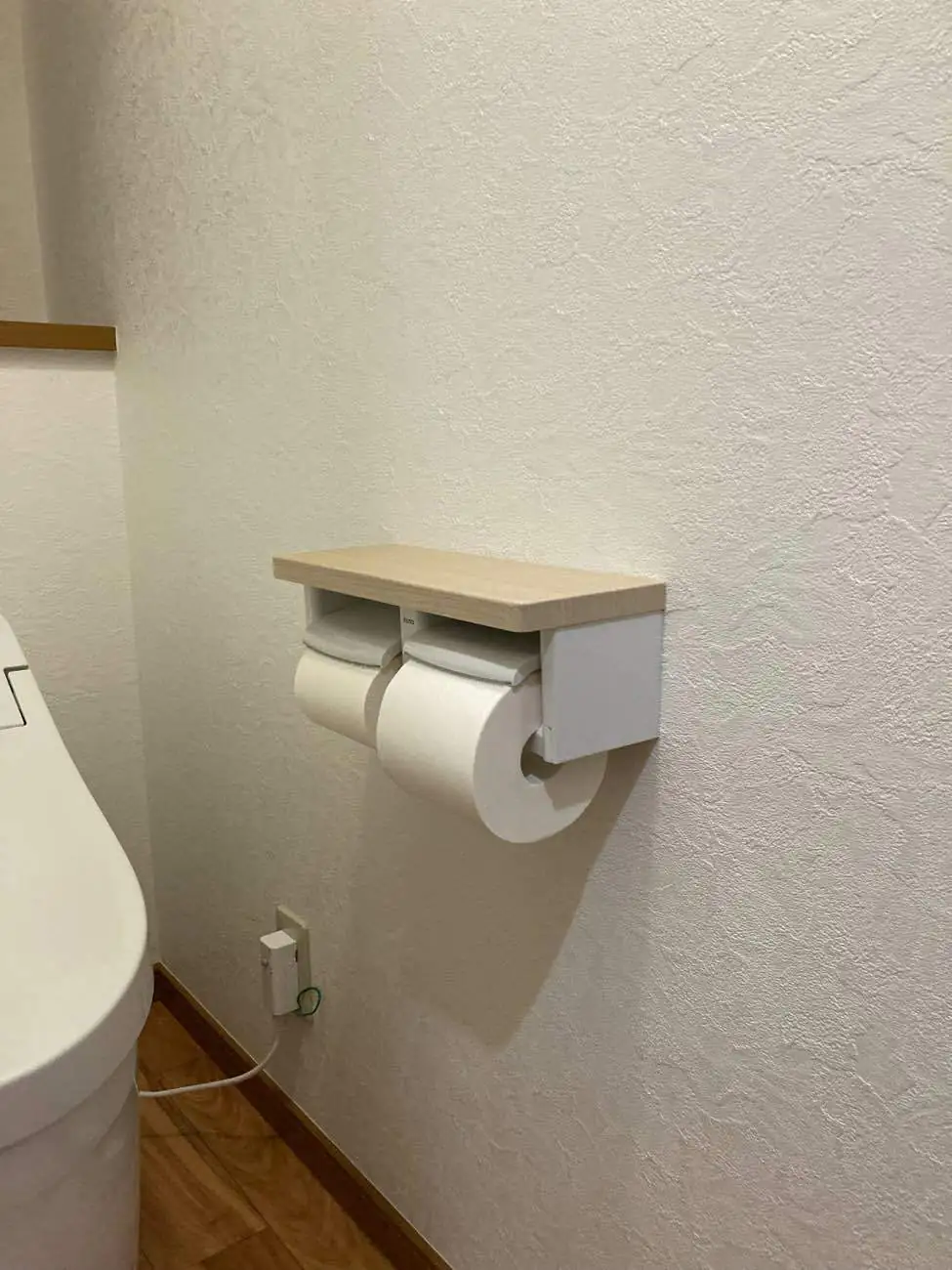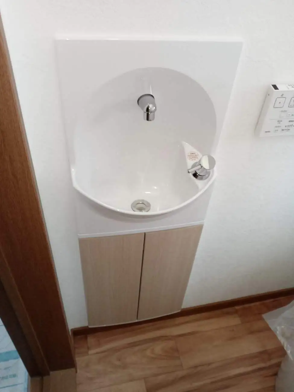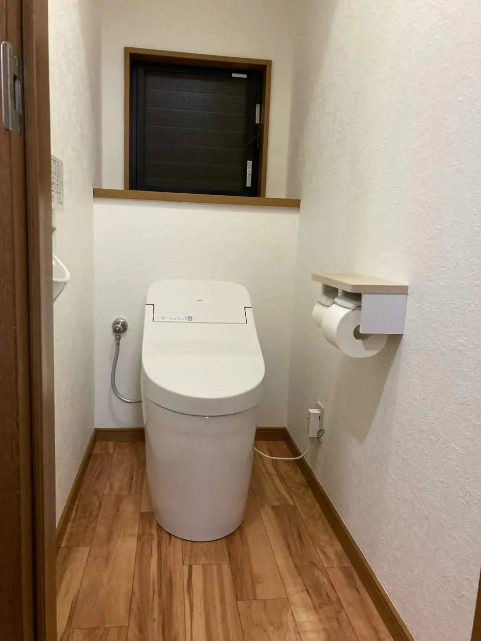 スッキリとお掃除のしやすいトイレになりました。手洗器付キャビネットの色とペーパーホルダーの棚の色を合わせ、床のクッションフロアとのバランスもとても素敵なトイレになりました。ウォシュレット操作や洗浄も壁付けのリモコンでおこなうことができるので、操作も楽にできます。クロスやクッションフロアもお好みのデザインをお選びいただき、こだわりの詰まったトイレになりました。