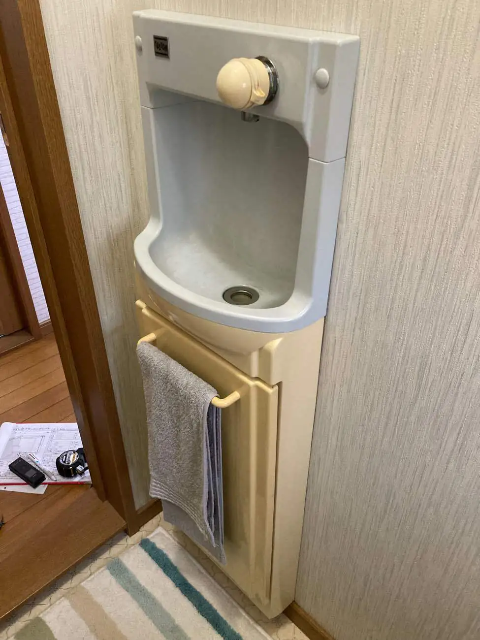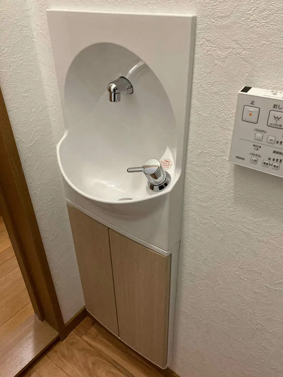 現在お使いのトイレの排水芯にも対応でき、スッキリとした印象のTOTO GG1リモデルタイプをご提案させていただきました。TOTOのGGシリーズは、タンク式一体型便器ですが見た目がスッキリとしているトイレです。トイレと別付けの手洗器については、現在お使いの手洗器やお部屋の大きさを考えて、TOTOの手洗器付キャビネットをご提案させていただきました。キャビネット部分の色は3色から選択できますので、トイレの空間のイメージに合わせてお好きな色をお選びいただきました。