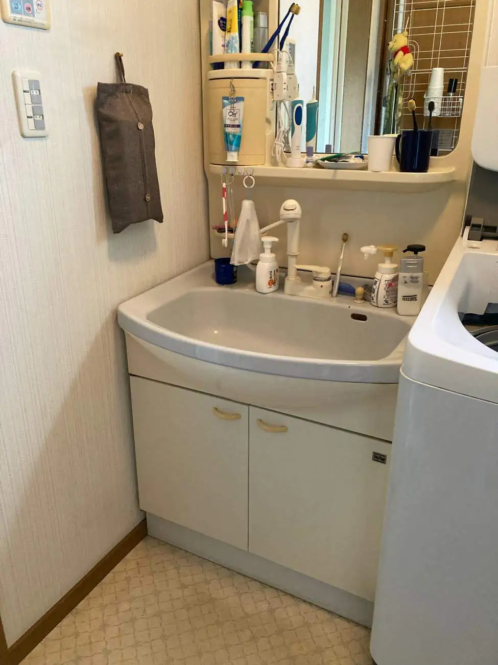 20年使用しており水漏れしている。三面鏡の洗面台にして収納を増やしたい。キャビネットは引出しタイプのものか片引き出しタイプのものにして使いやすい洗面台にしたい。壁、天井のクロス張替と床のクッションフロアの貼替もしたい。