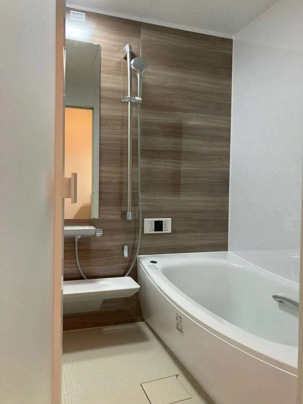 掃除がしやすく使いやすいお風呂になりました。シャワーの高さも手すり兼用のスライドバーで自由に調整することができます。壁柄は一面木目調のものをお選びいただきましたので、落ち着いた印象のお風呂になりました。洗面台のキャビネットも木目調にされましたので、統一感のある空間になっています。ゆっくりとくつろげるお風呂になりました。