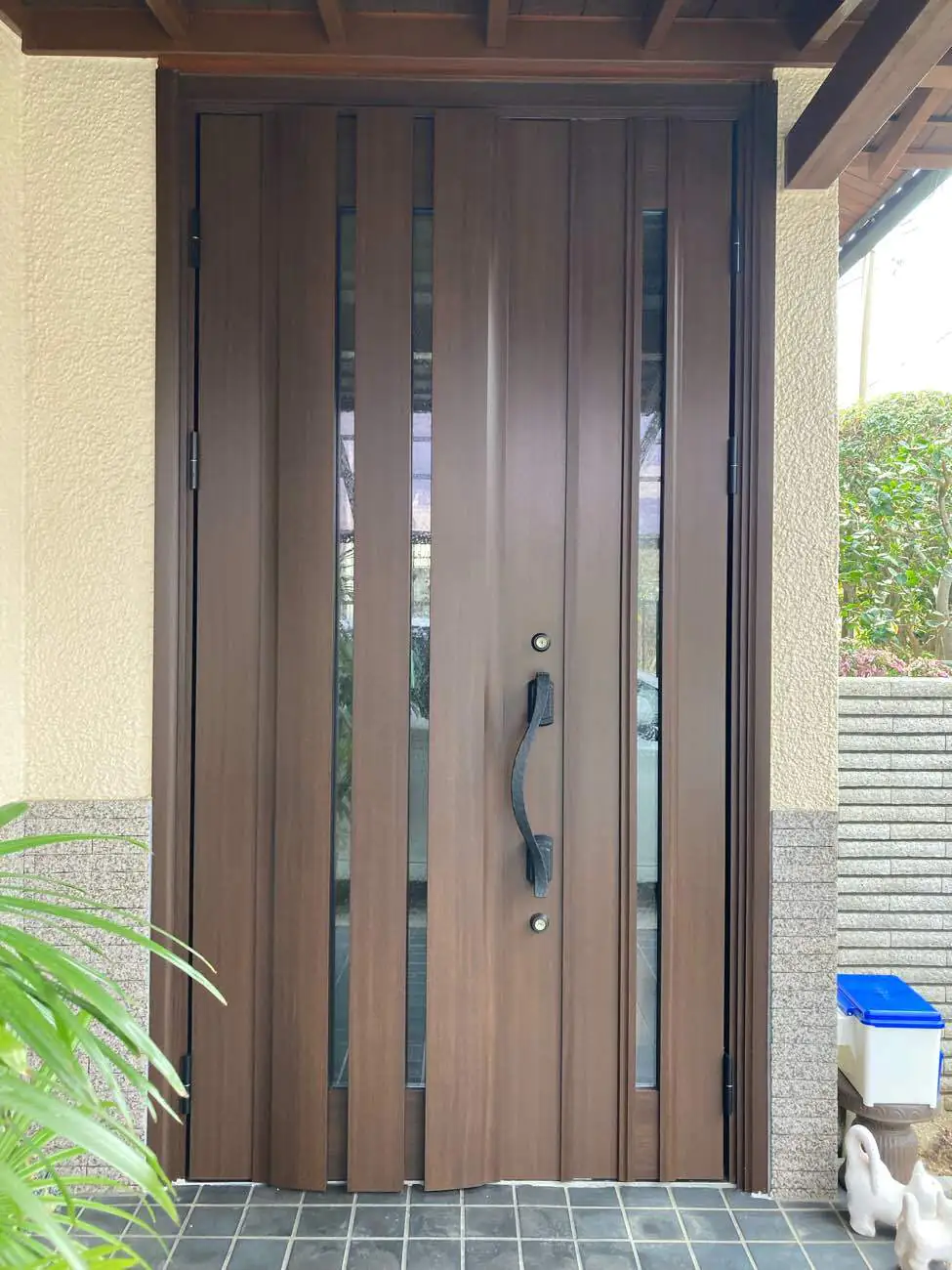 色、デザイン、ハンドルがとても良く合い、お家の雰囲気にも合った高級感のある玄関ドアになりました。「何度も悩んでイメージ通りの玄関ドアになって嬉しい!高級感のある印象になって、ご近所さんが良い玄関ドアになって良かったねって言ってくれたのよ!」とお客様も大満足の玄関ドアになりました。