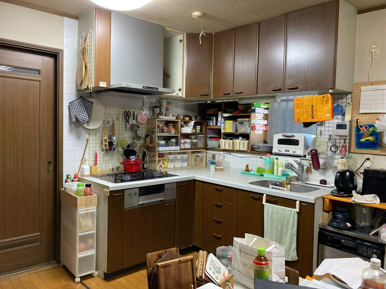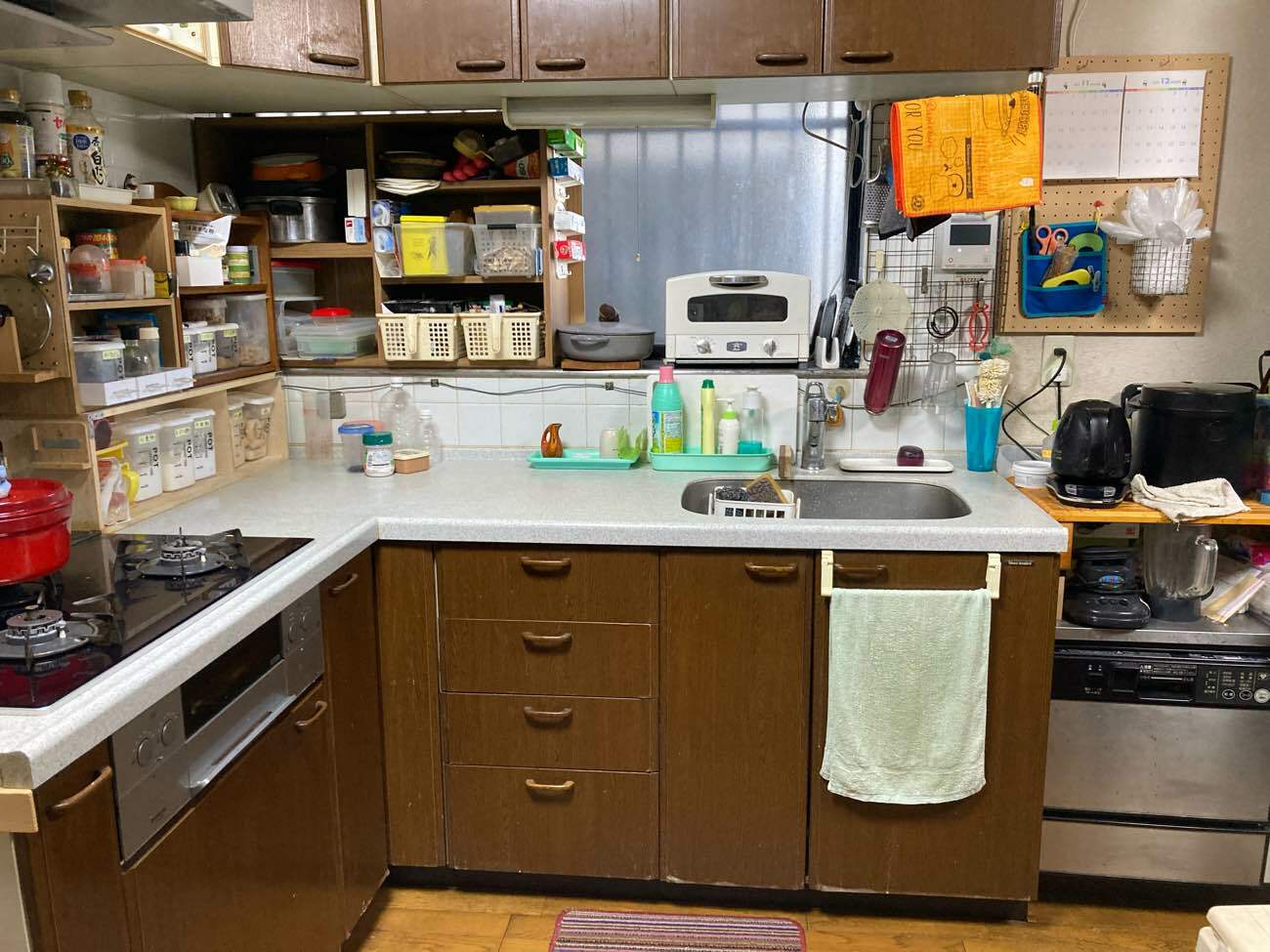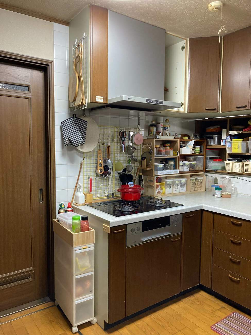 キッチンの開き扉を閉めると合わなくなってしまうとのことで、引出しのキャビネットにしてより使いやすく多くの収納をしたいというご希望でした。シンクが小さく少し不便に感じているとのことで、大きめのシンクにしたいとのご要望がありました。キャビネットの色のご希望はないとのことでしたが、吊戸棚は現在お使いのものを使用したいとのことでしたので、既存の吊戸棚と合わせても違和感のない、濃い色の木目調のカラーをご提案させていただきました。