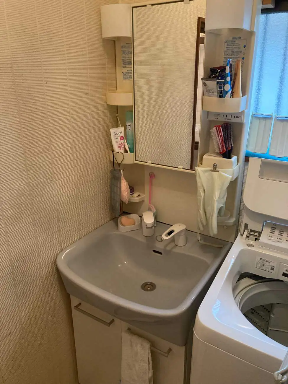 現在お使いの洗面台はボウルが手前に飛び出しており、洗面所空間を圧迫していたことや、同居人数が減ったことで必要以上に収納があるのでシンプルなものをご希望でしたのでTOTOのVシリーズを提案させていただきました。奥行きが490㎜と薄型で、収納も左右2段ずつと施主さまにとって丁度良い収納量。限られた洗面空間を広げることができた。また洗面所の床の黒ずみ汚れが気になっておられたので、汚れが目立ちにくいサンゲツのモザイク調の床を提案。