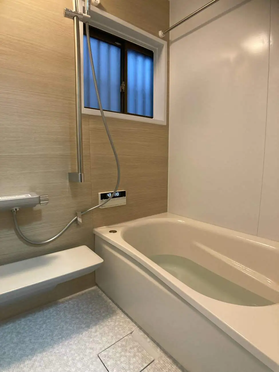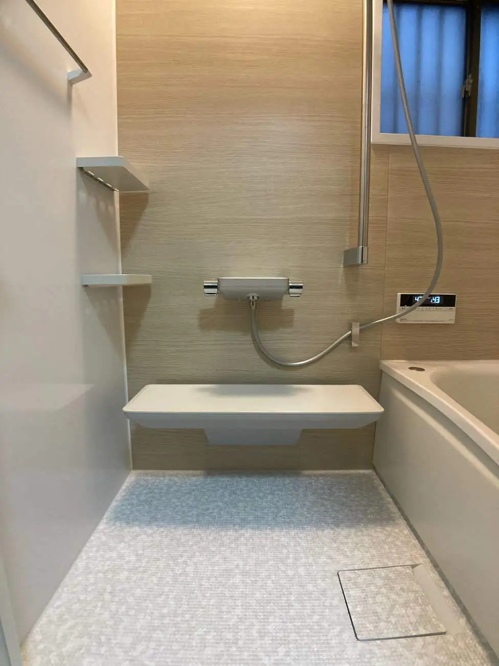 TOTOサザナをご提案させていただきました。浴室内の寒さ対策や冬場や花粉の時期、梅雨の洗濯にも便利な浴室乾燥暖房換気扇の設置、また掃除のしやすさを考え、鏡の設置をしないことも提案。サザナのスライドシャワーは手摺として使うこともできる為、入浴時のサポートにも使用可能。TOTOの魔法瓶浴槽は4時間経過後も2約2.5℃しか低下しないため追い炊き回数も大幅に減少。正面パネルはお客さまこだわりの明るい木目調を選択。浴室が温かみのある空間になりました。