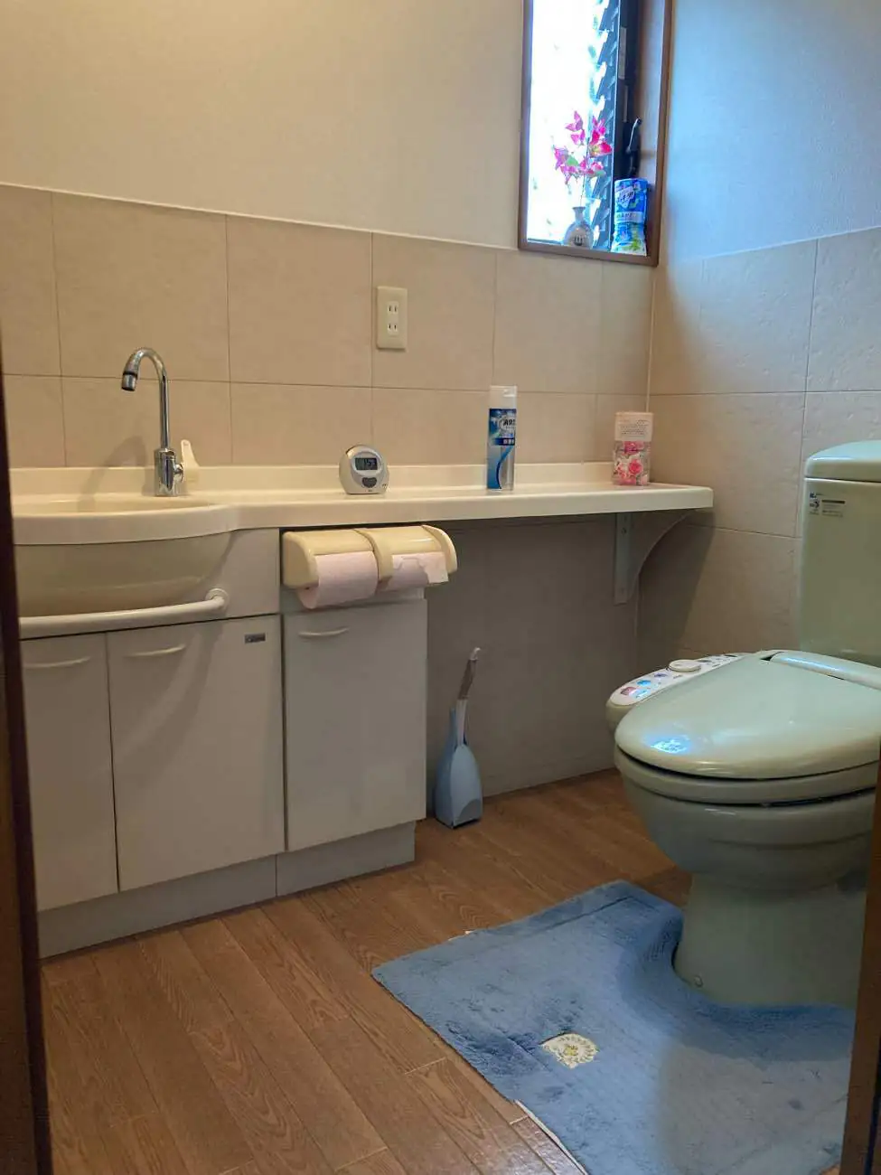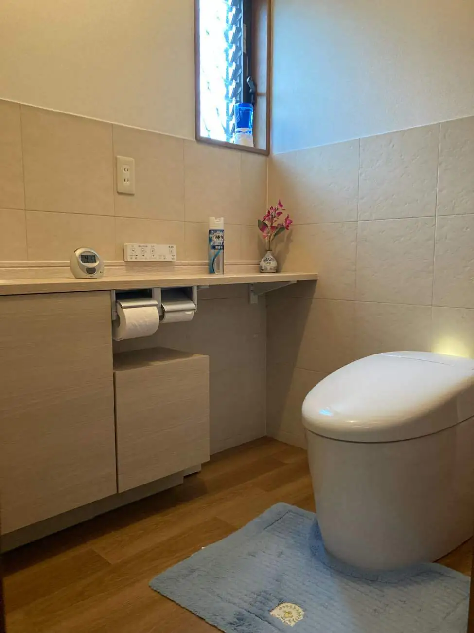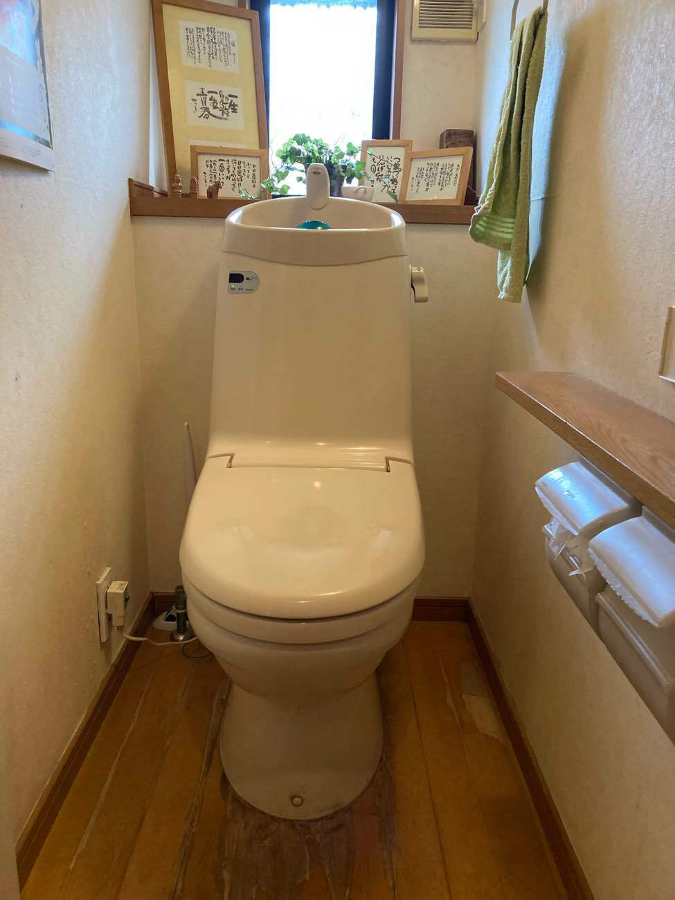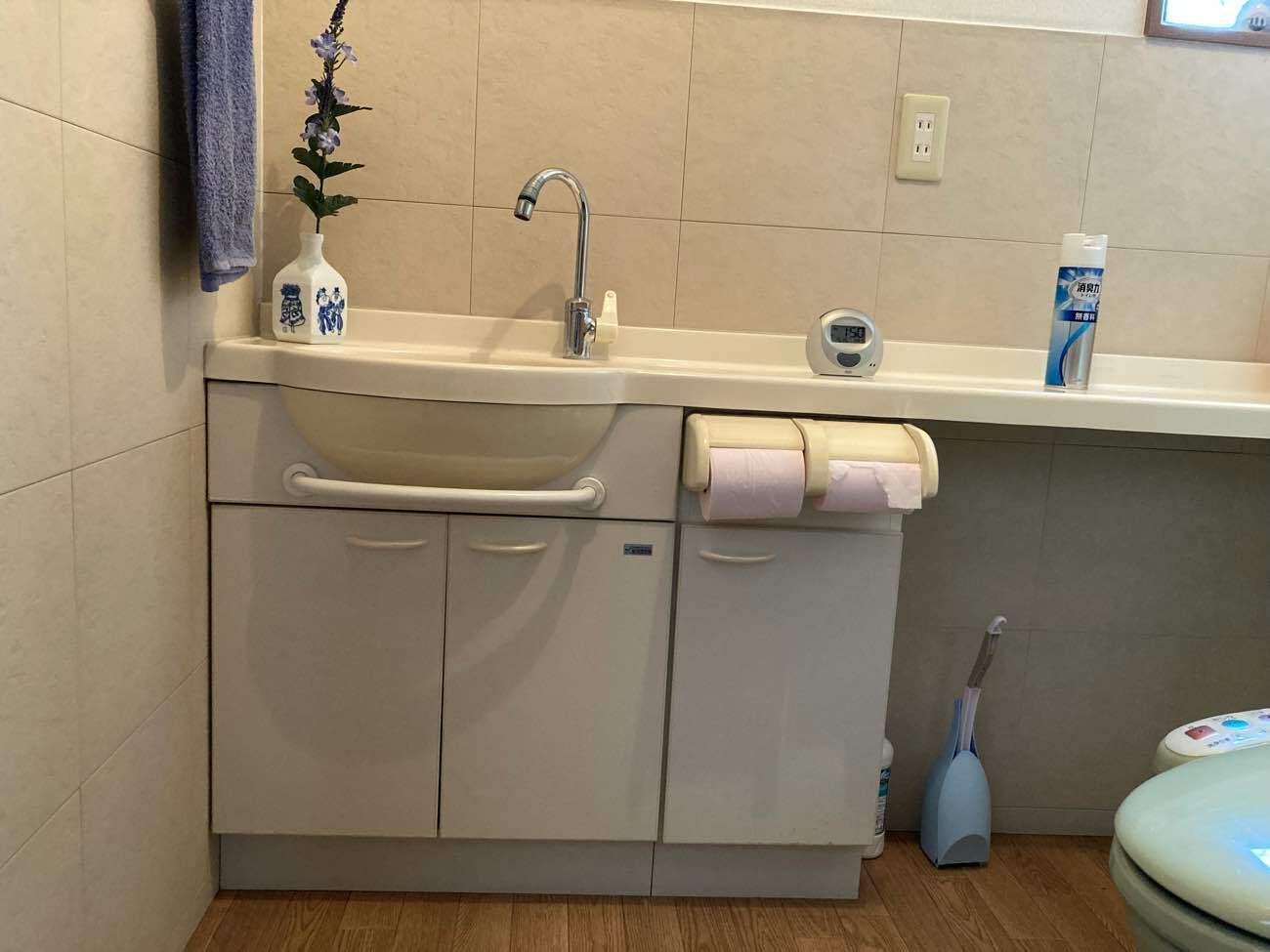 TOTOネオレストのトイレになり、スッキリとしたトイレになりました。オート開閉やオート便器洗浄の快適機能が備わっていますし、便器後方のやわらかライトも印象的です。カウンター手洗器もライトウッドの木目調のものに替え、壁の色と良く合っています。床のクッションフロアも張り替えました。「使うのがもったいないくらいのきれいなトイレになって嬉しい!」と大変満足していただくことができました。
