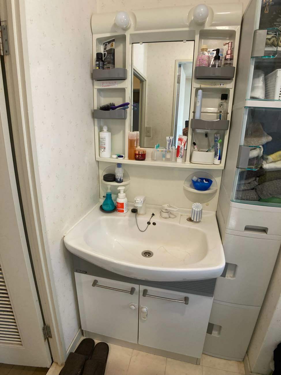 クリナップのファンシオをご提案。化粧水の瓶を落としてしまうことが多く、ボウルの割れを心配されていたので衝撃に強く割れにくい人造大理石のボウルに!収納が不足しているとのことでしたが、3面鏡ではなく今と同じようにすぐに物が取り出せる1面鏡をご希望。クリナップのファンシオは左右に3段の収納があり、1面鏡ながら鏡の内部にも収納をすることができる為、使用感はそのままで収納を増やすことができました。浴室と同系統の扉カラーと奥様こだわりのブルーのデザインタイル柄で、海外風の上質な洗面空間となり、お気に入り頂きました。