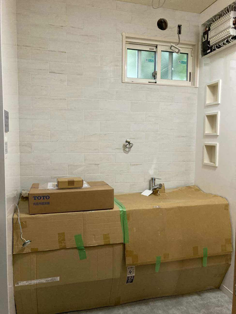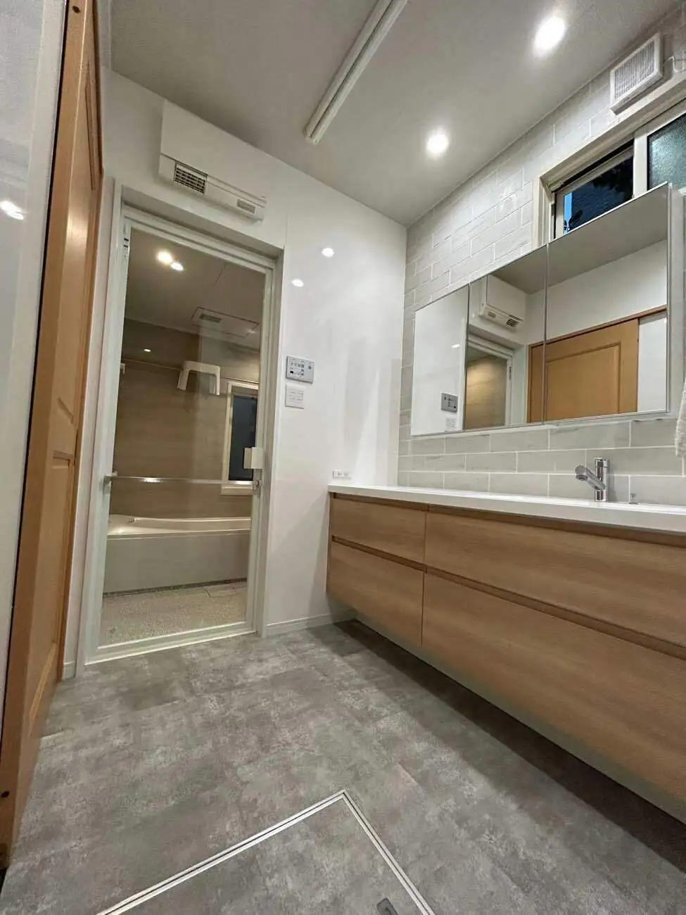 洗面台正面の壁はタイル仕上げでドラマに出てきそうなぐらいおしゃれでかっこよく、周りの壁もパネルで仕上げたことでより一層高級感がアップ!