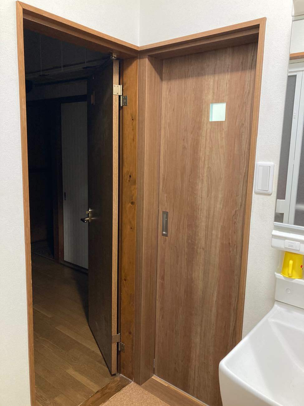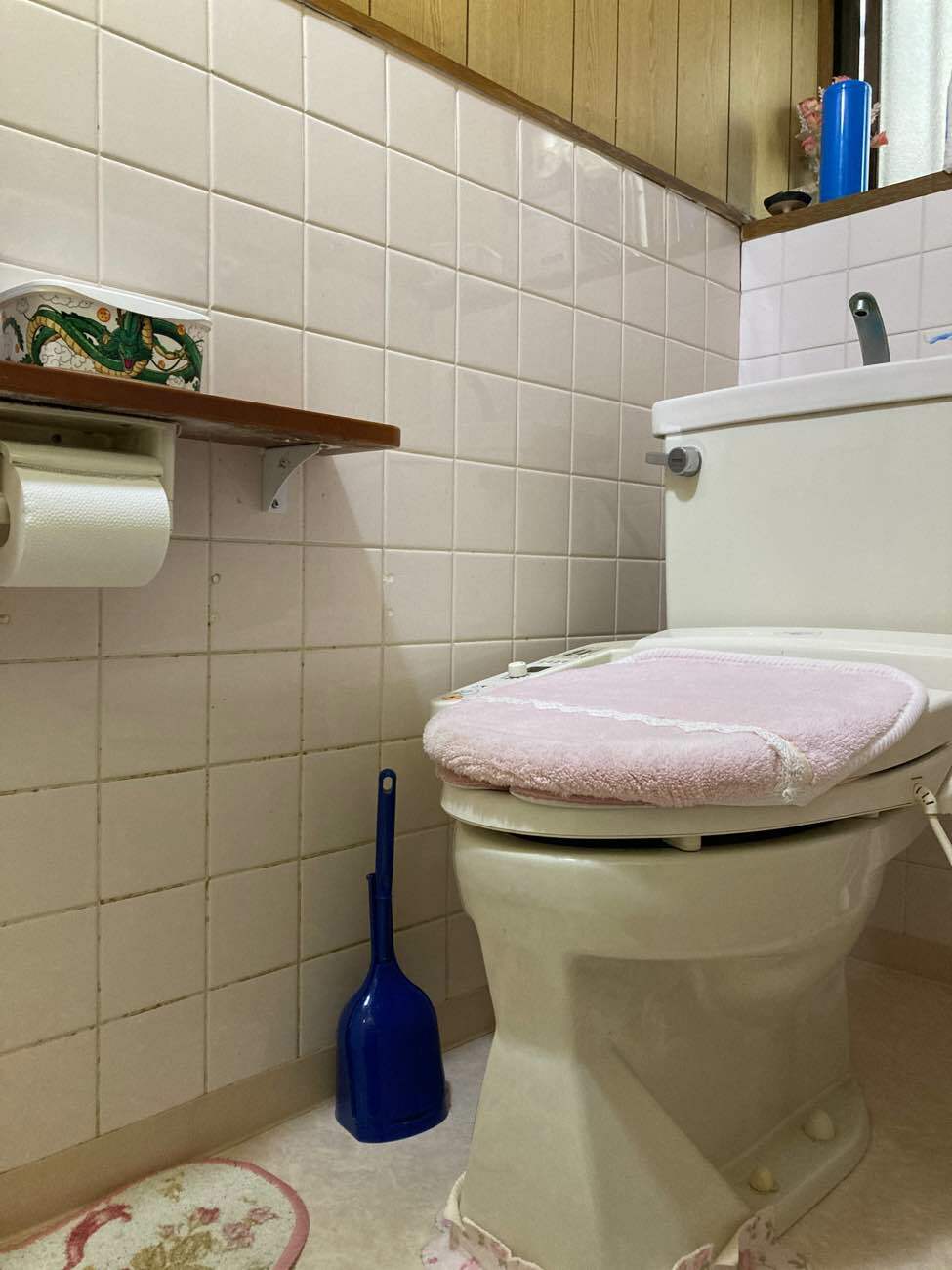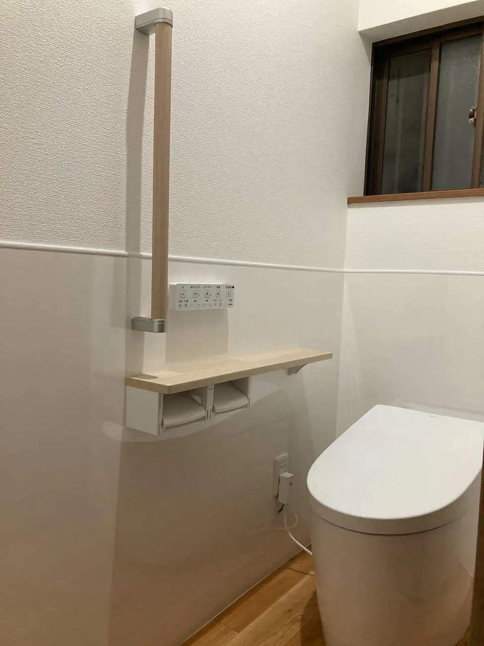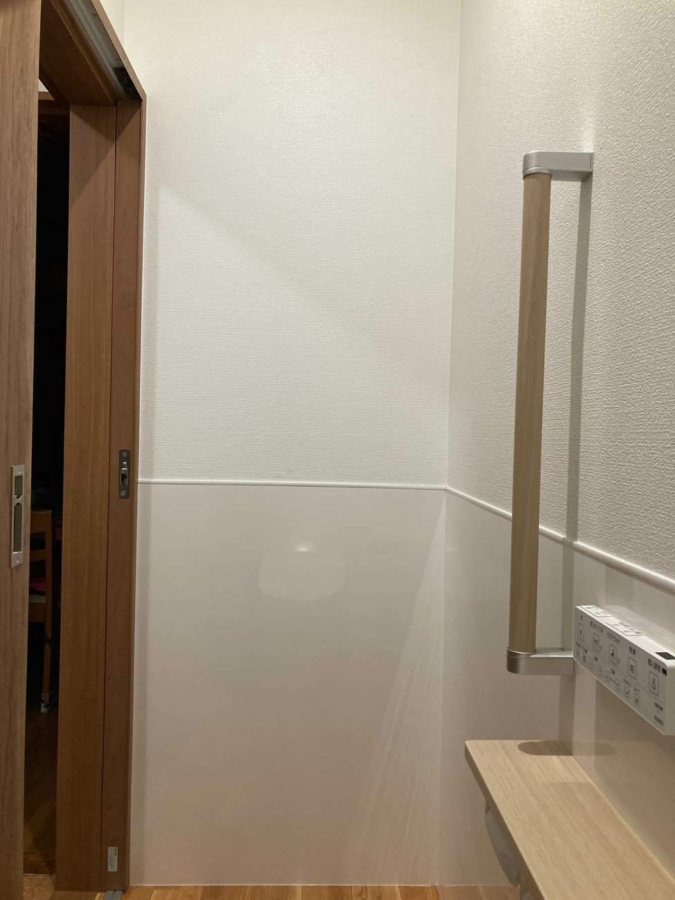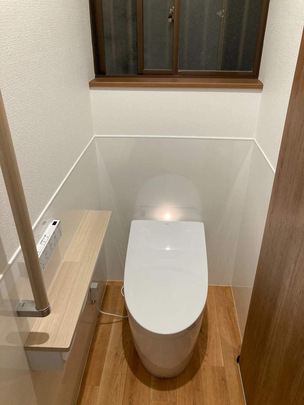 トイレの使用年数が経ってきたことと掃除のしやすいものが良いとご依頼をいただきました。話を聞かせていただき、シンプルで掃除しやすくしたい。というコトでしたので見た目がローフォルムでスッキリコンパクトに見えるネオレストを選び、奥の棚台を撤去し、壁の腰高までをパネルで仕上げ、その上はクロス仕上げでご提案させていたが来ました。ネオレストは便器下部に給水栓を入れれるため壁や床に出てしまう突起物がなくなり見た目もスッキリし掃除もしやすくなります。また腰高までパネルにすることで壁紙に比べ拭きとりに体制があり日々のお手入れも楽になります。また、脱衣所と隣接しているので脱衣所へ入るとトイレの扉が脱衣所の入口側へと開くため不便さと接触の可能性があると感じたため、トイレの扉も開き戸から引戸への変更も提案させていただきました。扉を変えたことで動線も変わりスッキリとしました。