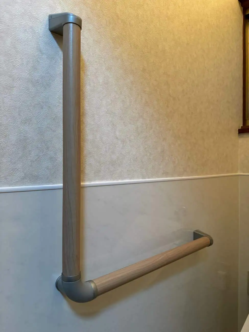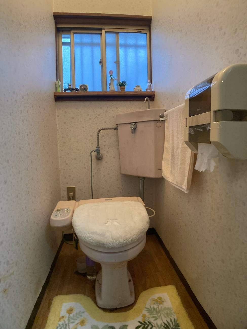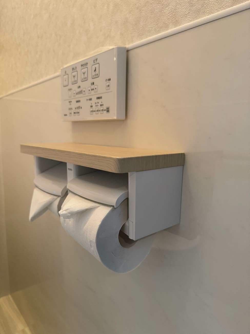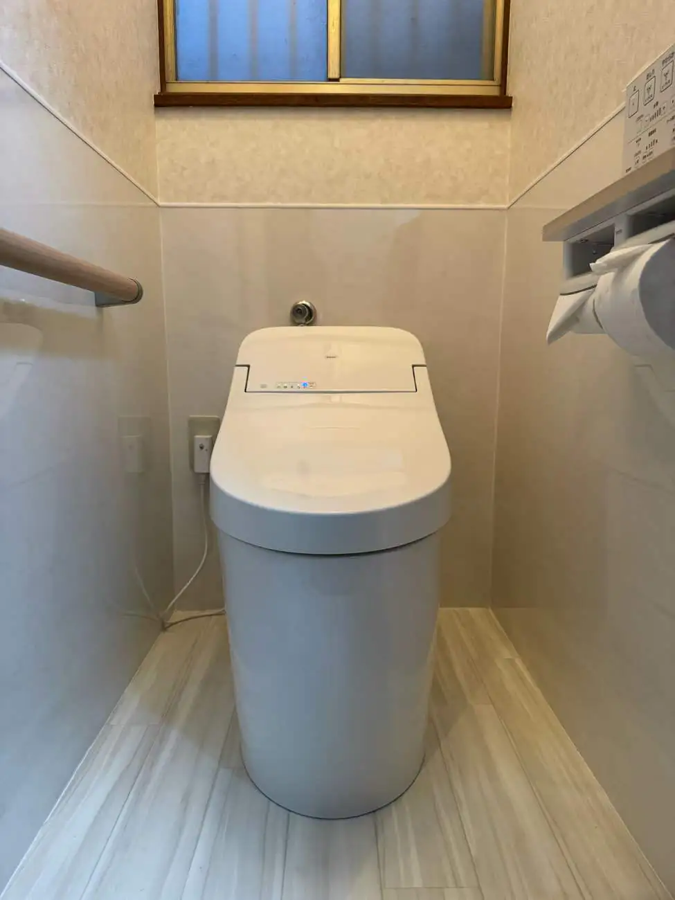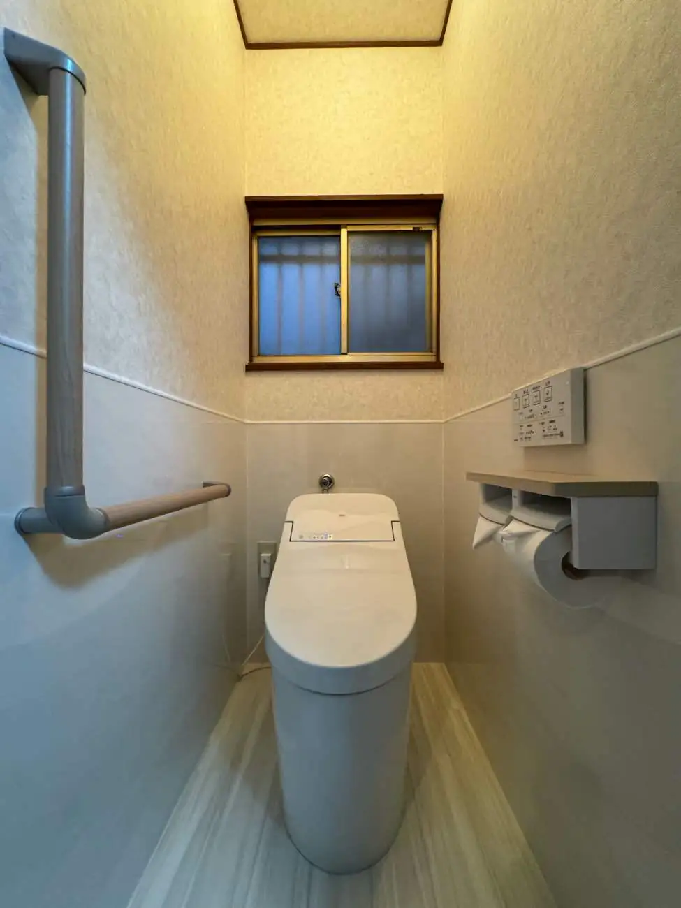 40年丁寧にお使いになられたトイレは経年劣化で漏れたダンパーオイルが便器にこびりつき取れなくなっていました。また奥様はお掃除をする際、便器の淵や便座横にある大きなウォシュレットの操作部があることで横や奥の掃除がしにくいと長年悩まれておりました。ご主人さまは、ウォシュレットのお湯が出ないことや、足腰の衰えにより立ち上がる動作が大変になってきたとお感じだとお話いただきました。初めはトイレ内に手洗いの設置が必要とのことでしたが、お話をお聴きするとご夫婦共に手洗いは使用されていないことが判明。トイレ空間もすっきりし、お掃除もしやすくなる為、手洗いなしの一体型便器GGを選定。壁は腰高までパネルにすることを提案し清掃のしやすさや清潔な状態を保ちやすくしました。立ち座りをしやすくするためにTOTOの立座ラク棚付きペーパーホルダーとL型の手摺の設置も提案させていただきました。完成したトイレを見て奥様はトイレ空間が明るくなったことや、お掃除がしやすそうだと喜ばれ、ご主人さまは便座にお座りになり手摺を使って立ち座りを試され、「これは楽でいい!」お喜びになられました。