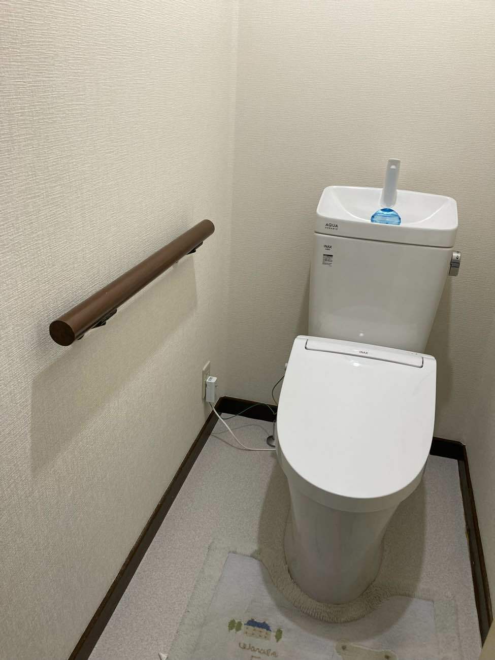 使い勝手はそのままに、節水でキレイが長続きするトイレになりました。床のクッションフロアと壁のクロスは白系を選ばれ、トイレットペーパーホルダーも新しくされたので、全体的に白色で統一感のある印象になりました。トイレ本体だけではなく床や壁も新しくなったので、便器設置跡やはがれ、汚れも解消することができました。