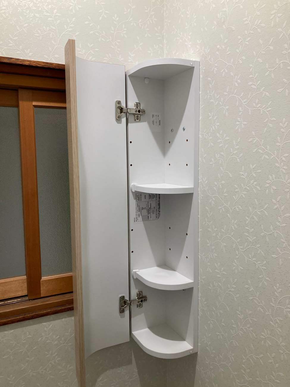 空間を確保するため今ご使用のものを全て1ヶ所にまとめられるようにコーナーキャビネットをご提案しました。取付に関しては扉を開けた時や便座に座った時に視界に入らないよう座って左後方へ設置したことで圧迫感もなくなりました。便器の取付に関しては給水栓を便器内に隠蔽することで掃除がしやすくスッキリとします。またクロスやクッションフロアも拘られアクセサリーの色味と合わさり明るく温かみのある雰囲気の空間になりました。