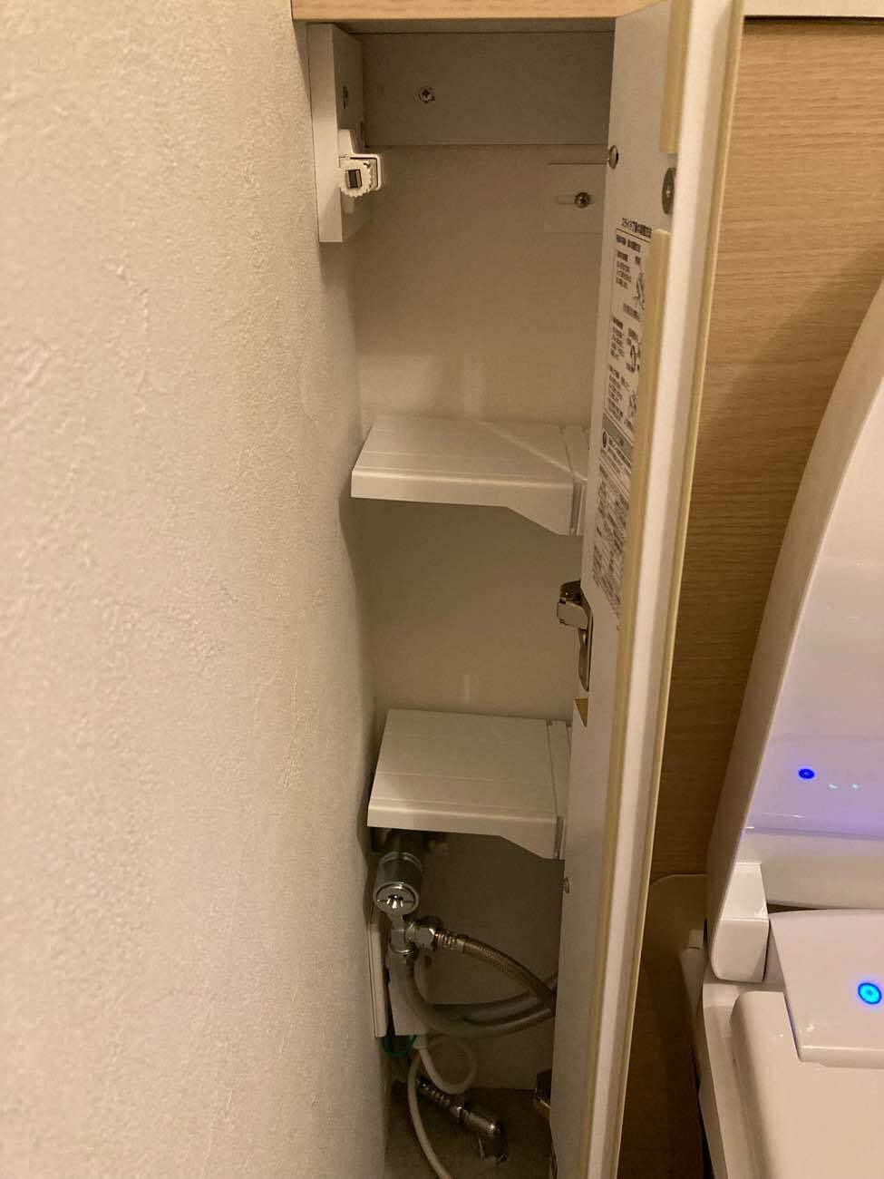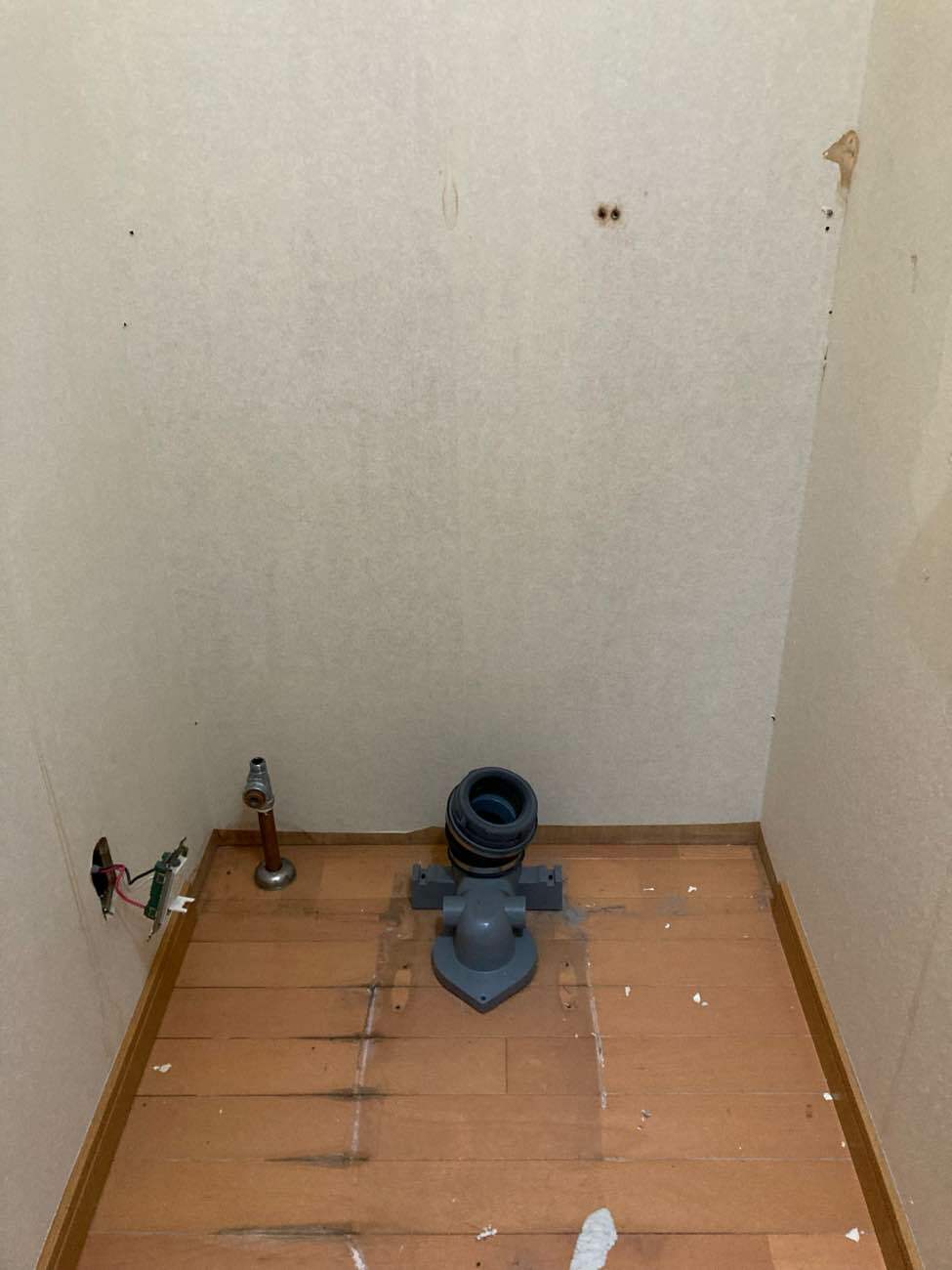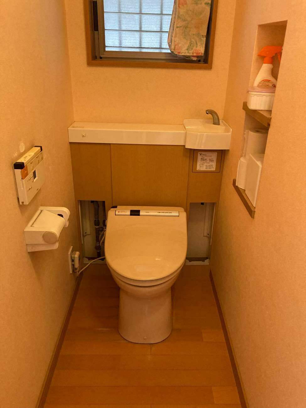 便座からの水漏れで床が湿っていることがわかり、今と同じような後ろに棚がついていて、さらに収納が出来るタイプをご提案。収納できるだけでなく、きれい除菌水が便器・ノズル・便座裏までフルコースで搭載されているお掃除が楽になる仕様に。床も水濡れで少しめくれている個所があったため、上からクッションフロアを貼り、壁紙も一緒に貼替