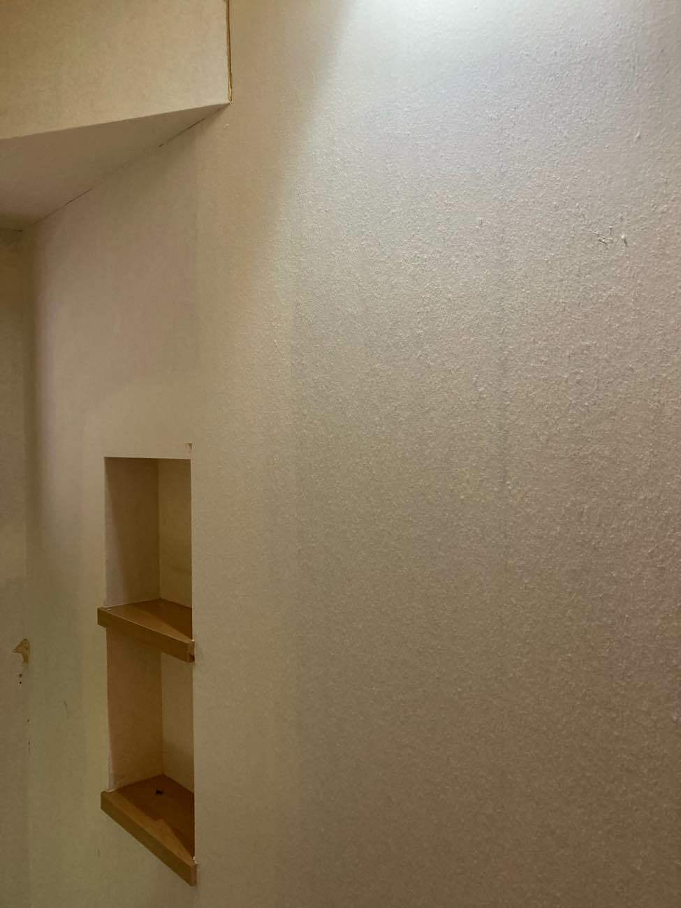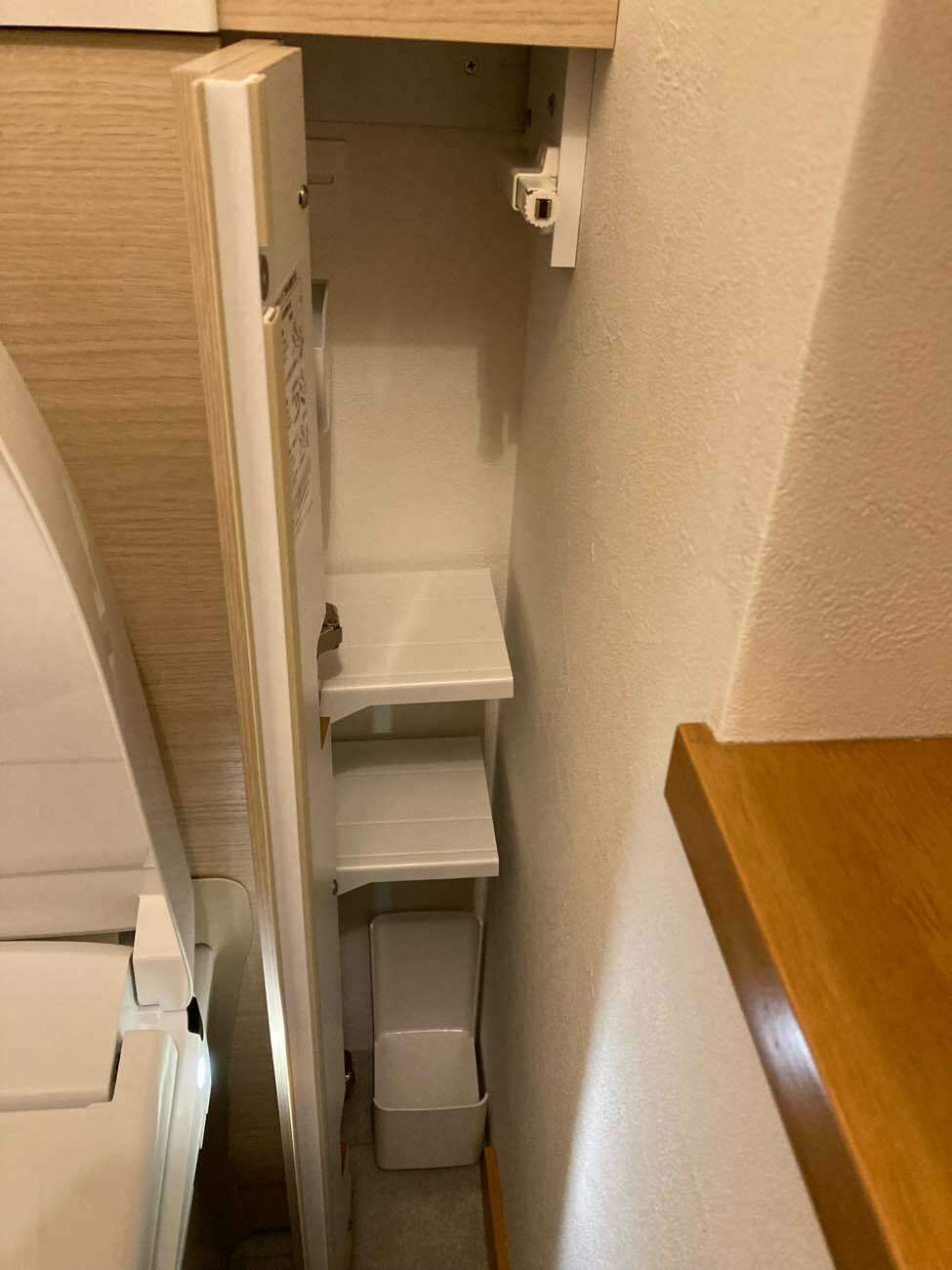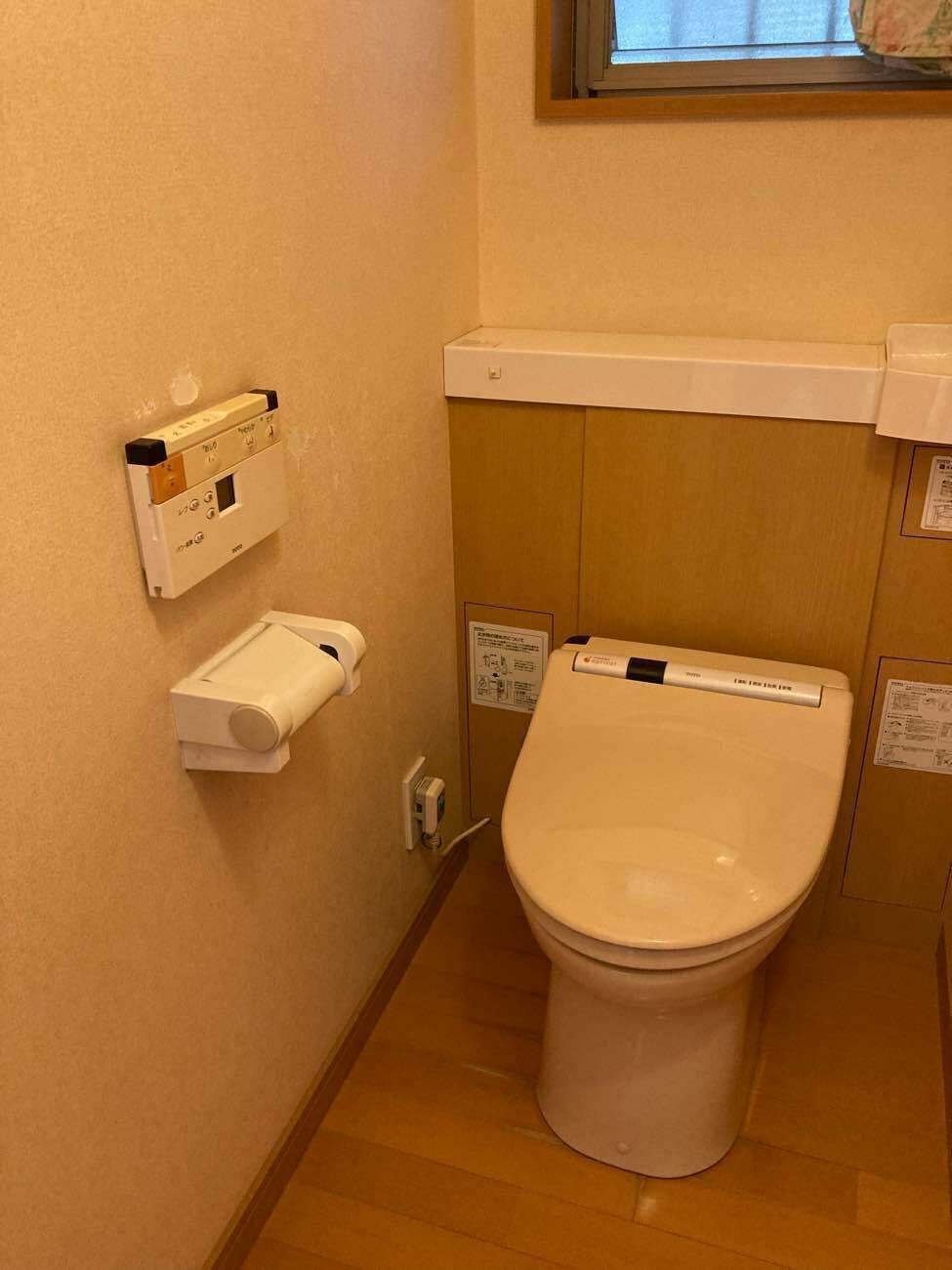 便座からの水漏れで床が湿っていることがわかり、今と同じような後ろに棚がついていて、さらに収納が出来るタイプをご提案。収納できるだけでなく、きれい除菌水が便器・ノズル・便座裏までフルコースで搭載されているお掃除が楽になる仕様に。床も水濡れで少しめくれている個所があったため、上からクッションフロアを貼り、壁紙も一緒に貼替