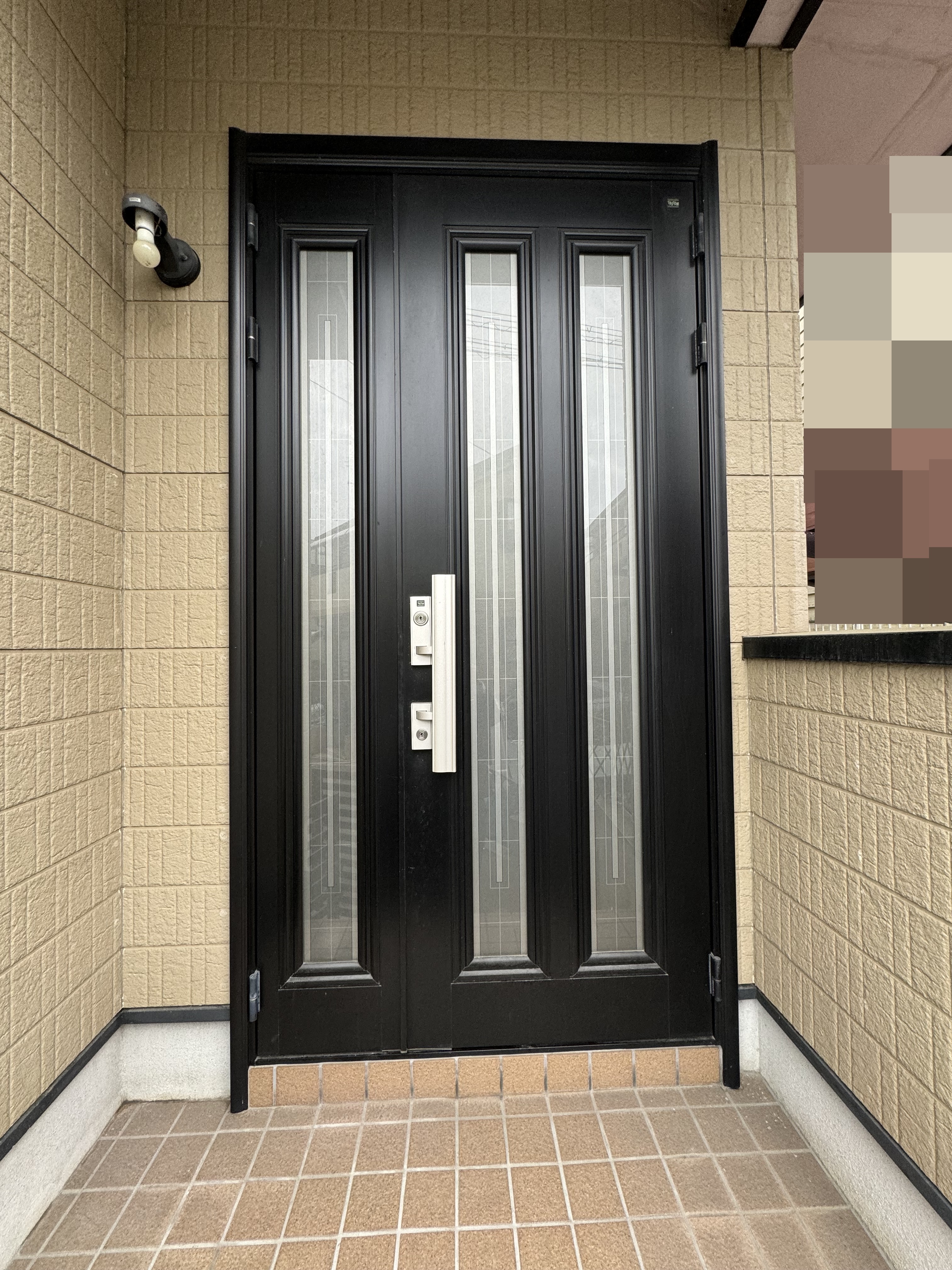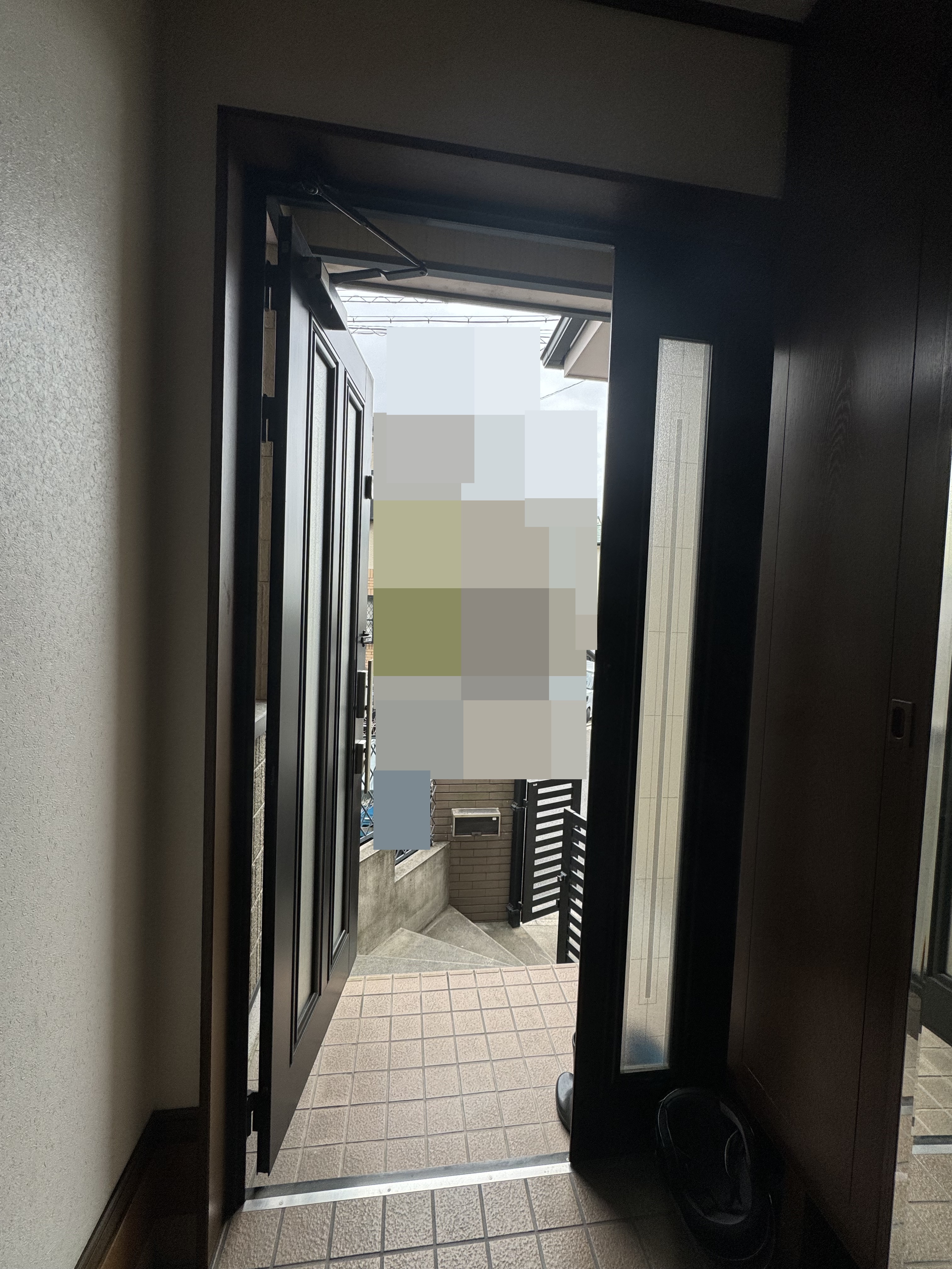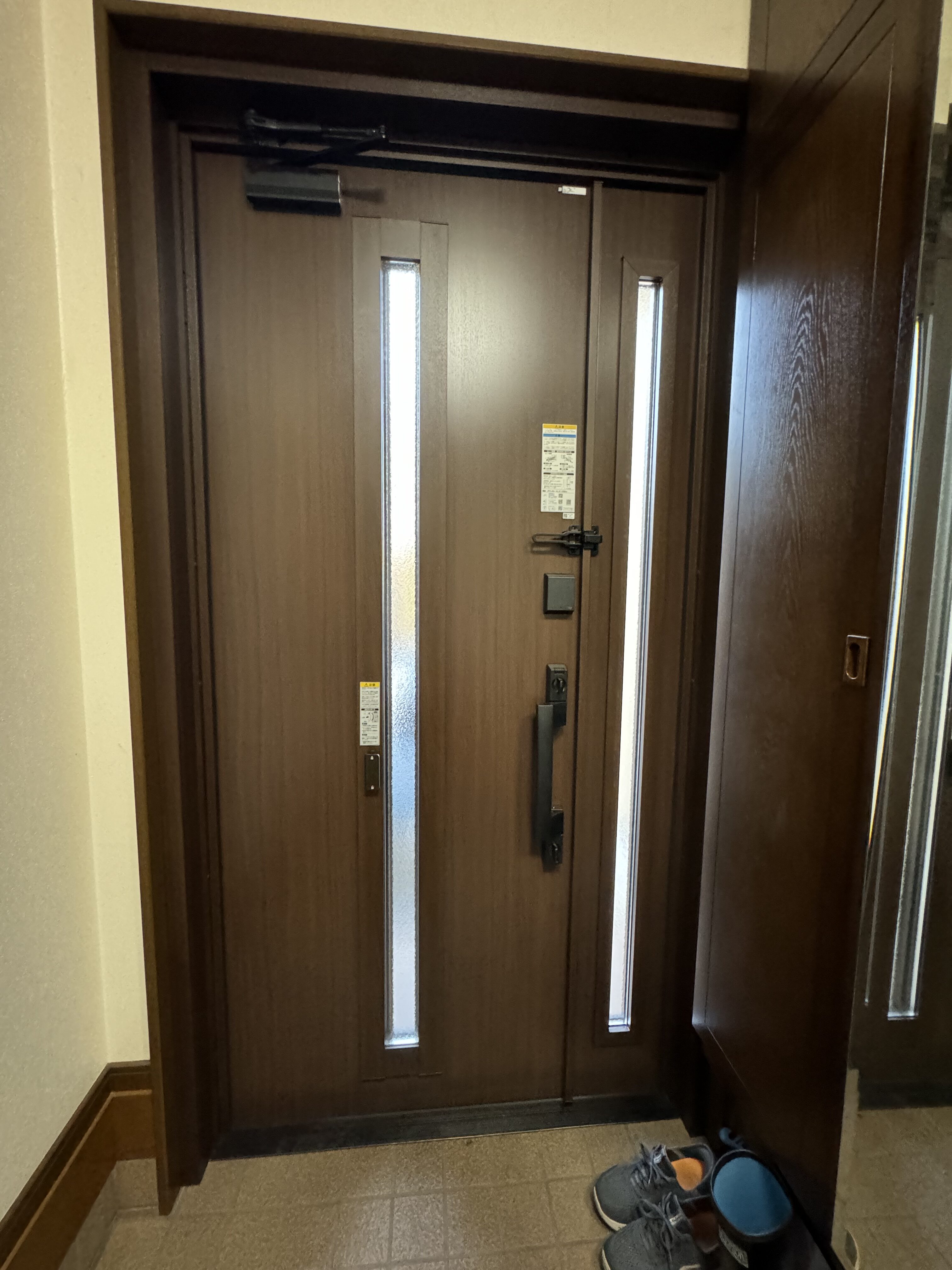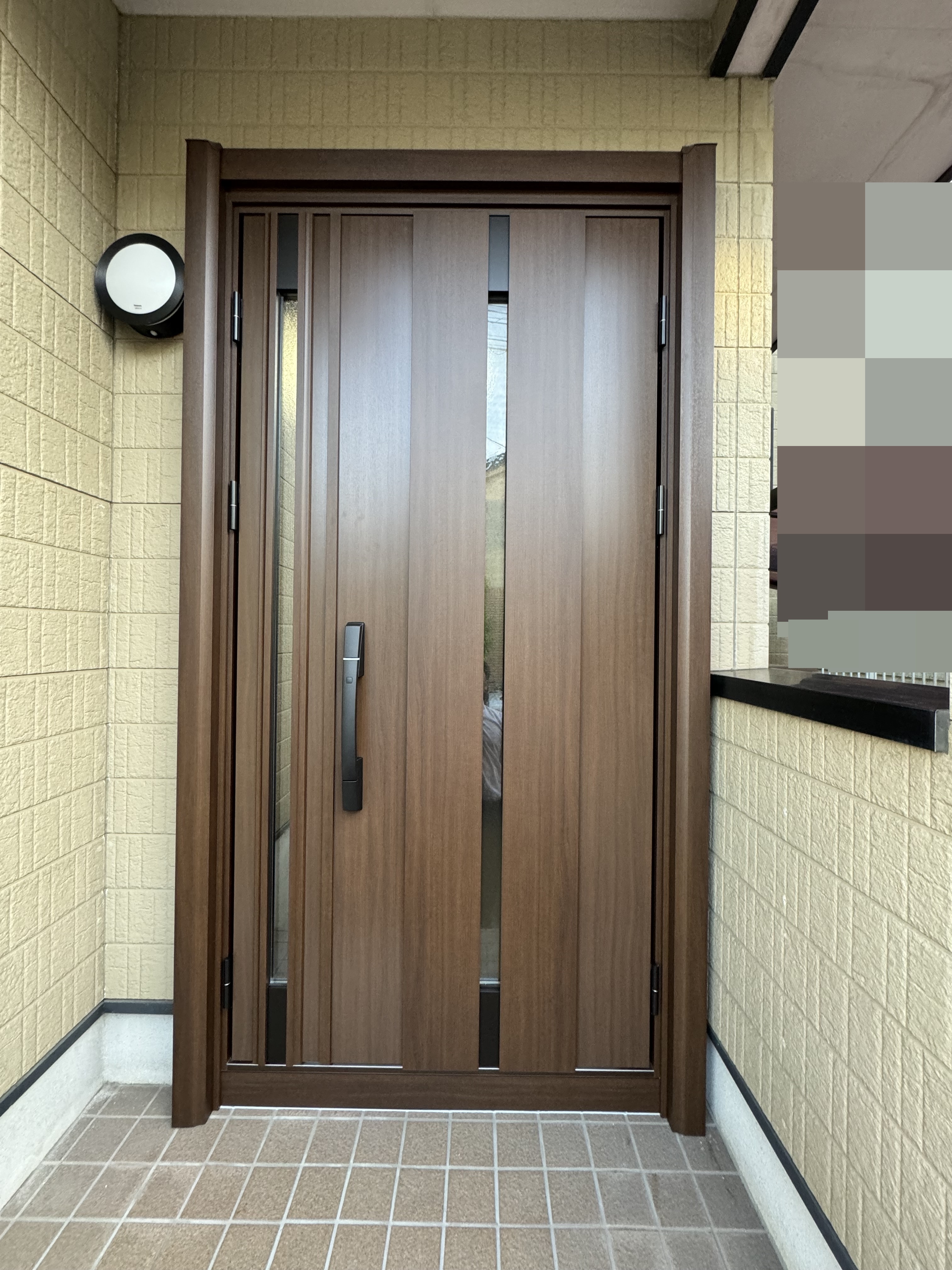 留守中に玄関ドアのカギをこじ開けられた跡が見つかり、防犯対策をしたいとご相談いただきました。安全性が高く、耐久性のある玄関ドアをご提案し、設置いたしました。新しい玄関ドアは安全でセキュリティも万全です。濃いブラウンの木目調デザインもオシャレで、外壁にも調和しているため、大変満足していただきました。