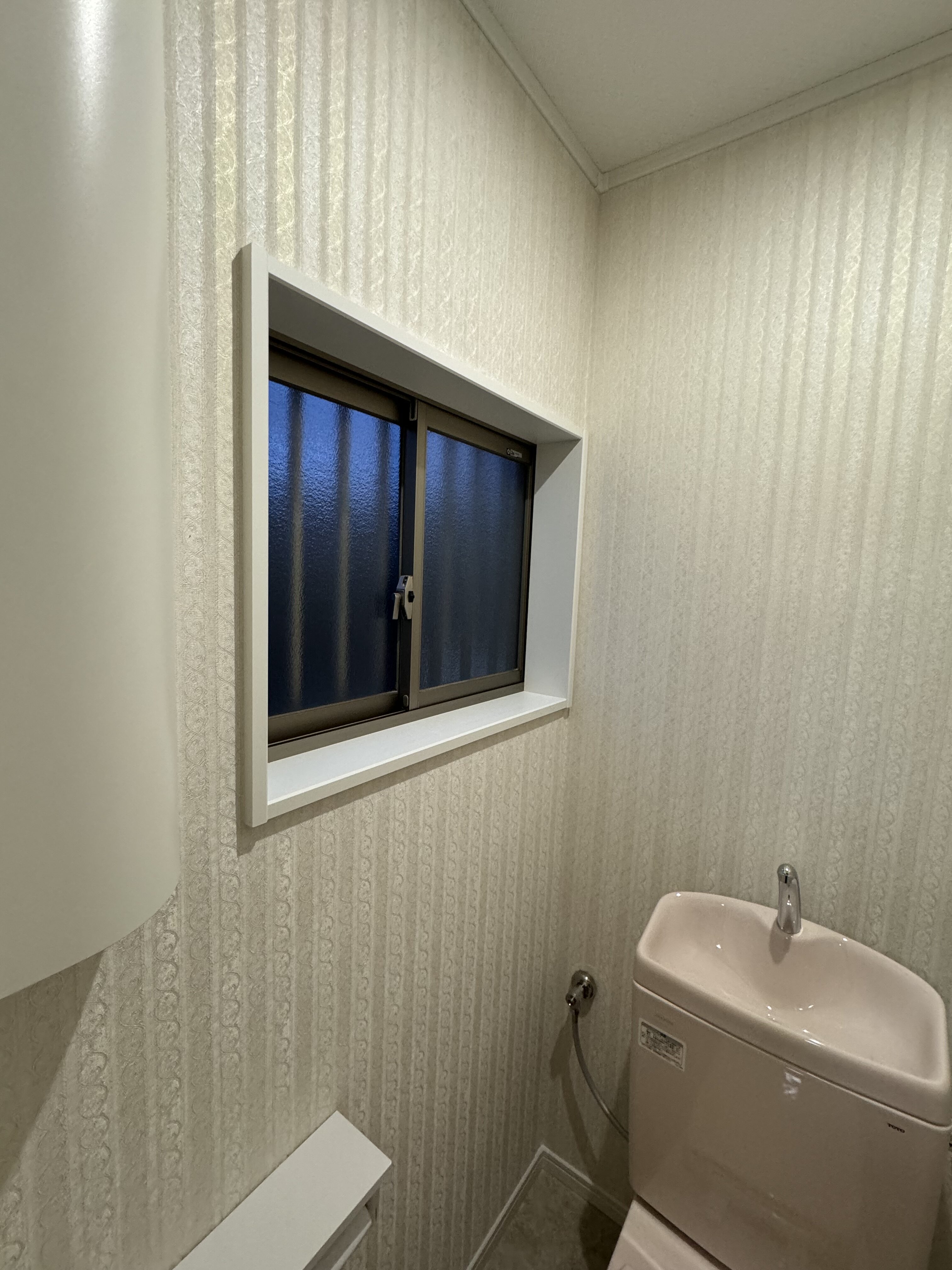 現状のトイレは冬場に非常に寒く、また換気扇が無いため窓を開けっぱなしにする必要がありました。さらに、全体的に可愛らしいデザインにしたいというご希望がありました。そこで、内窓の設置と換気扇の取り付けを提案しました。これにより窓を閉めたままで換気が可能となり、寒さ対策が実現します。また、自動照明と収納スペースの設置を提案し、白とピンクを基調としたデザインでトイレ全体を可愛らしく仕上げました。