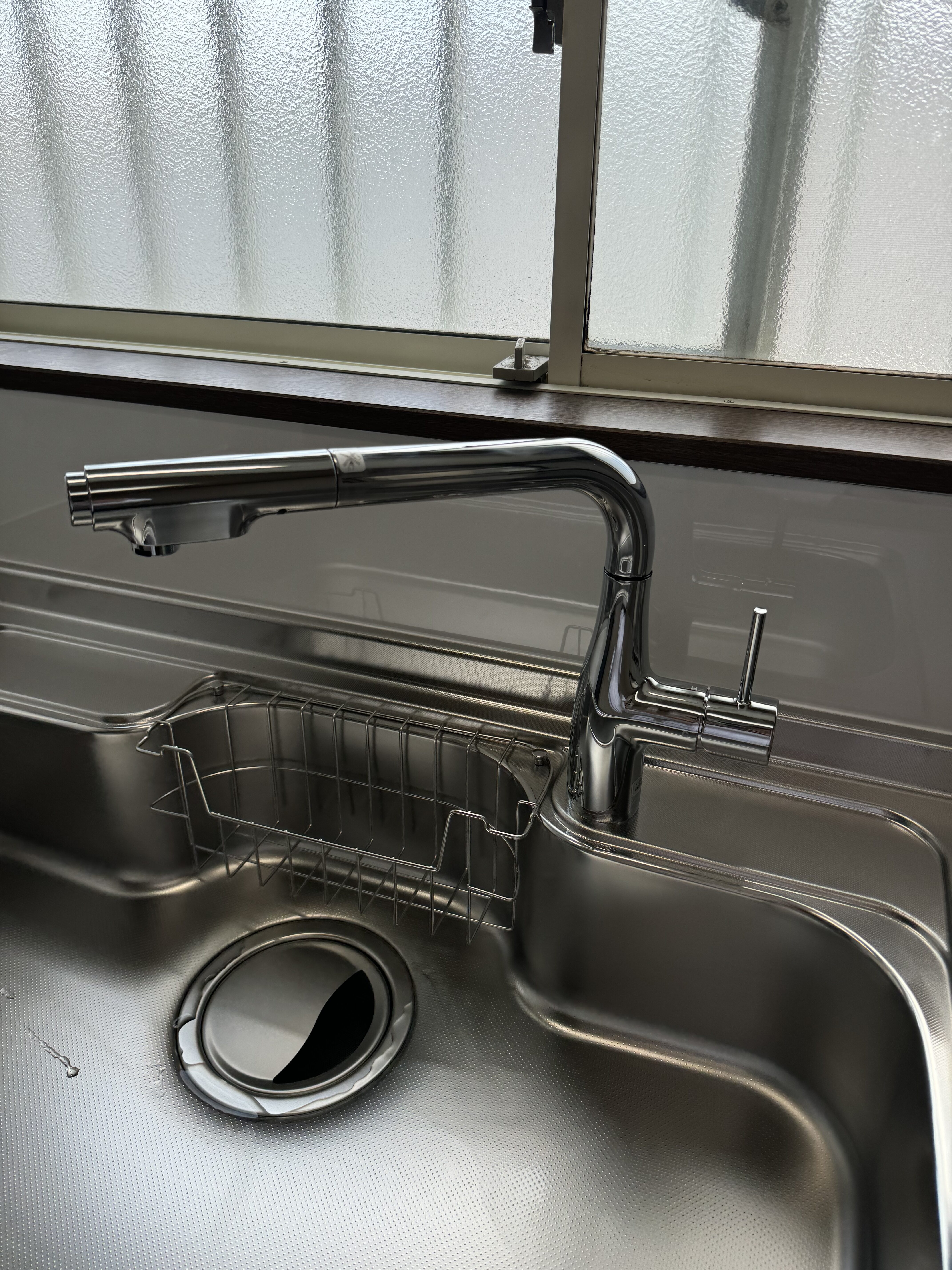 お客様のお話をお聴きし、クリナップのラクエラを提案。白の木目調の美しいデザインで、天板の高さを90cmに調整。キッチンは引き出し収納にし、向かいには吊戸棚を追加したことで収納スペースを確保しました。さらに、掃除しやすいレンジフードと、新しい食洗機を設置しました。キッチンが明るくなり、収納も増えて使いやすくなったため、大変喜んでいただきました。