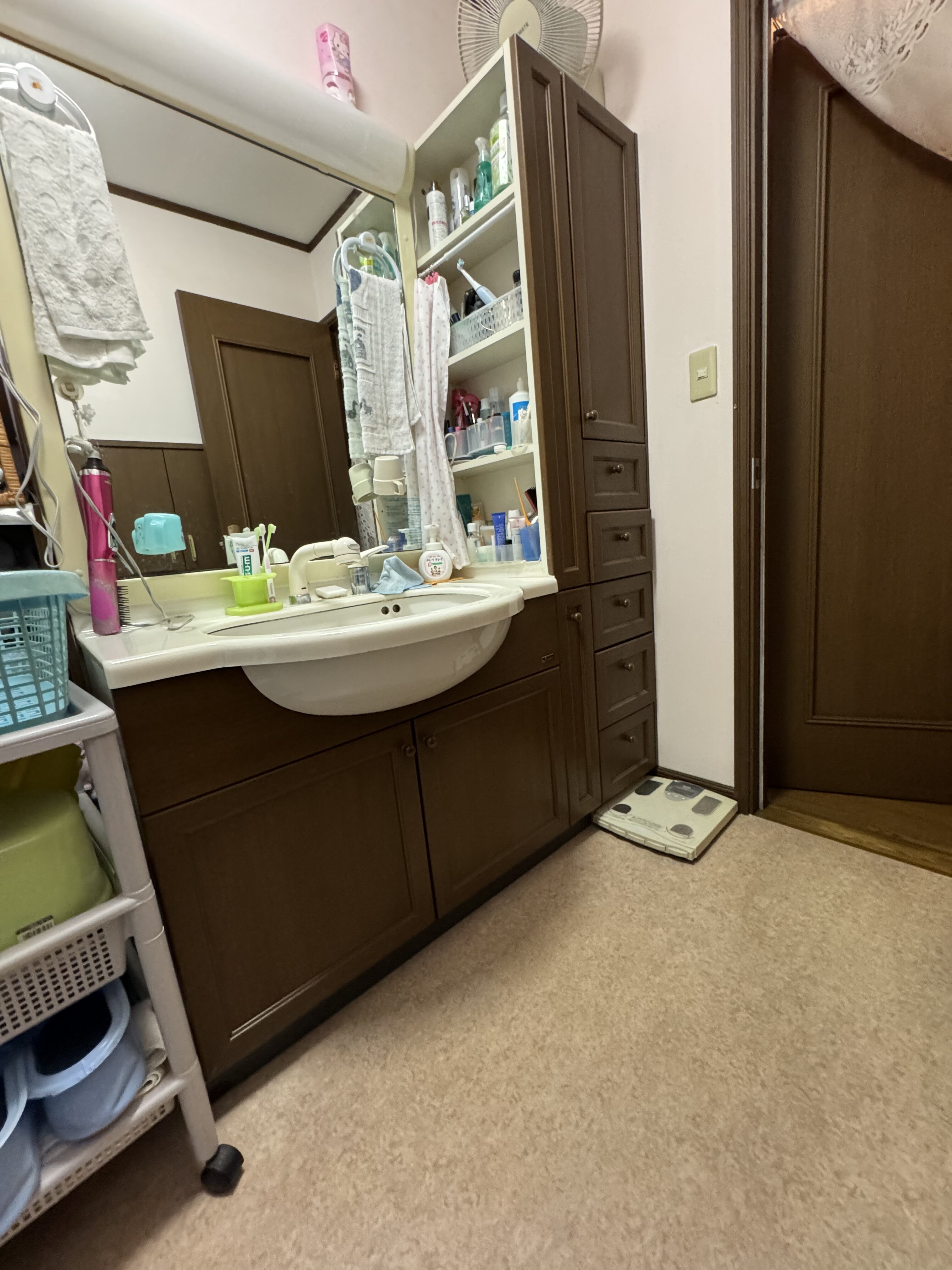 既存の洗面台横の棚と色を合わせた洗面台をお選びいただきました。水栓は上から出るタイプですので、水はねや水栓の付け根に水がたまりにくいです。引き出し収納と三面鏡収納でスッキリとした見た目を保ちながら、収納力は大幅にアップしました。鏡の下のちょい置きスペースが便利なのもポイントです!リラックスでき、快適にお過ごしいただける洗面空間になり大変喜んでいただきました。