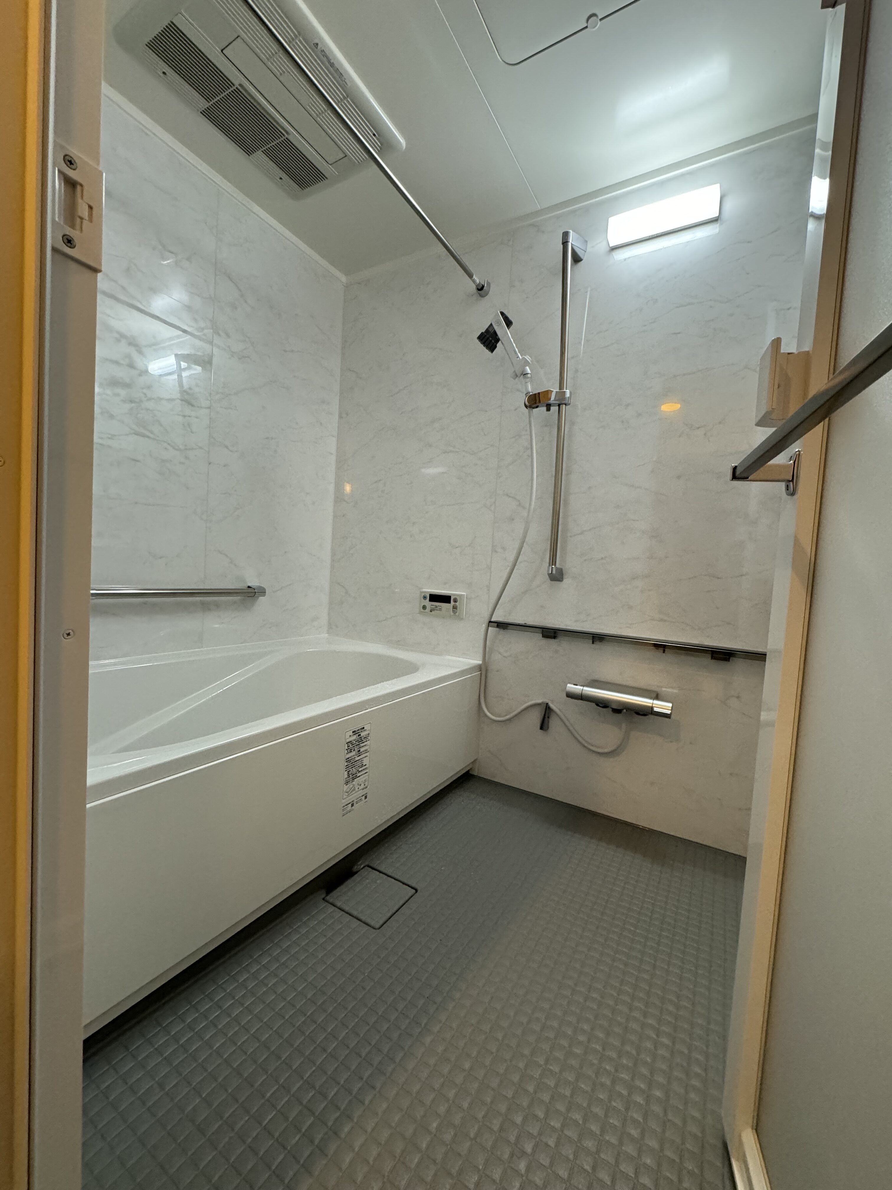 お掃除がしやすい人造大理石浴槽をご提案し、ミラブルゼロシャワーヘッドを導入しました。カワックも新しくしたため、快適に使用できるようになりました。また、カスタマイズ可能なマグネットアイテムを購入、ライフスタイルに合わせて簡単に取り付け・取り外し、丸ごと洗うこともできます。浴室入口の壁面はアイカのパネルで石目調に仕上げ、入口の段差も解消しました。安全、そしてゴージャスな空間で、快適なバスタイムを楽しむことができるようになりました!