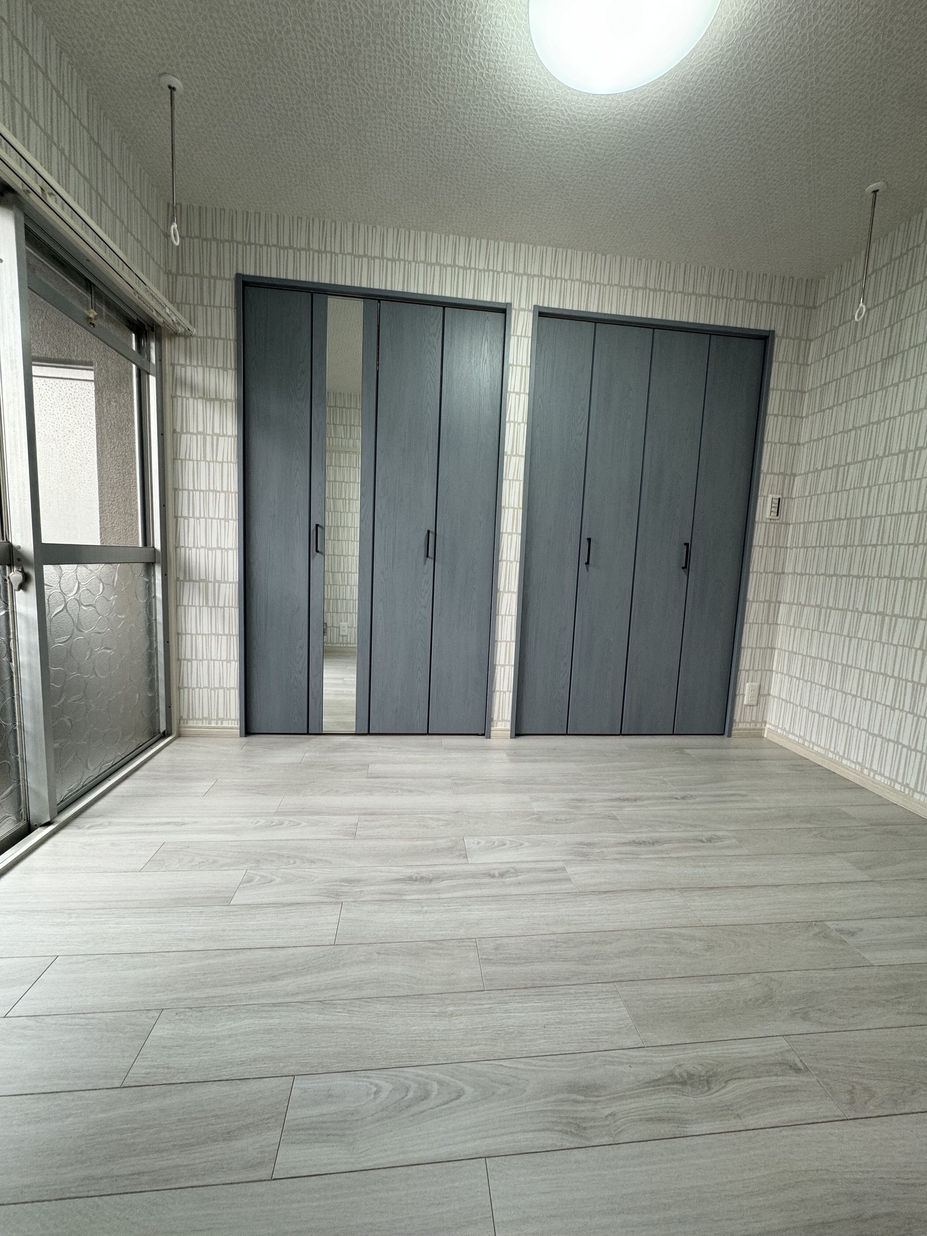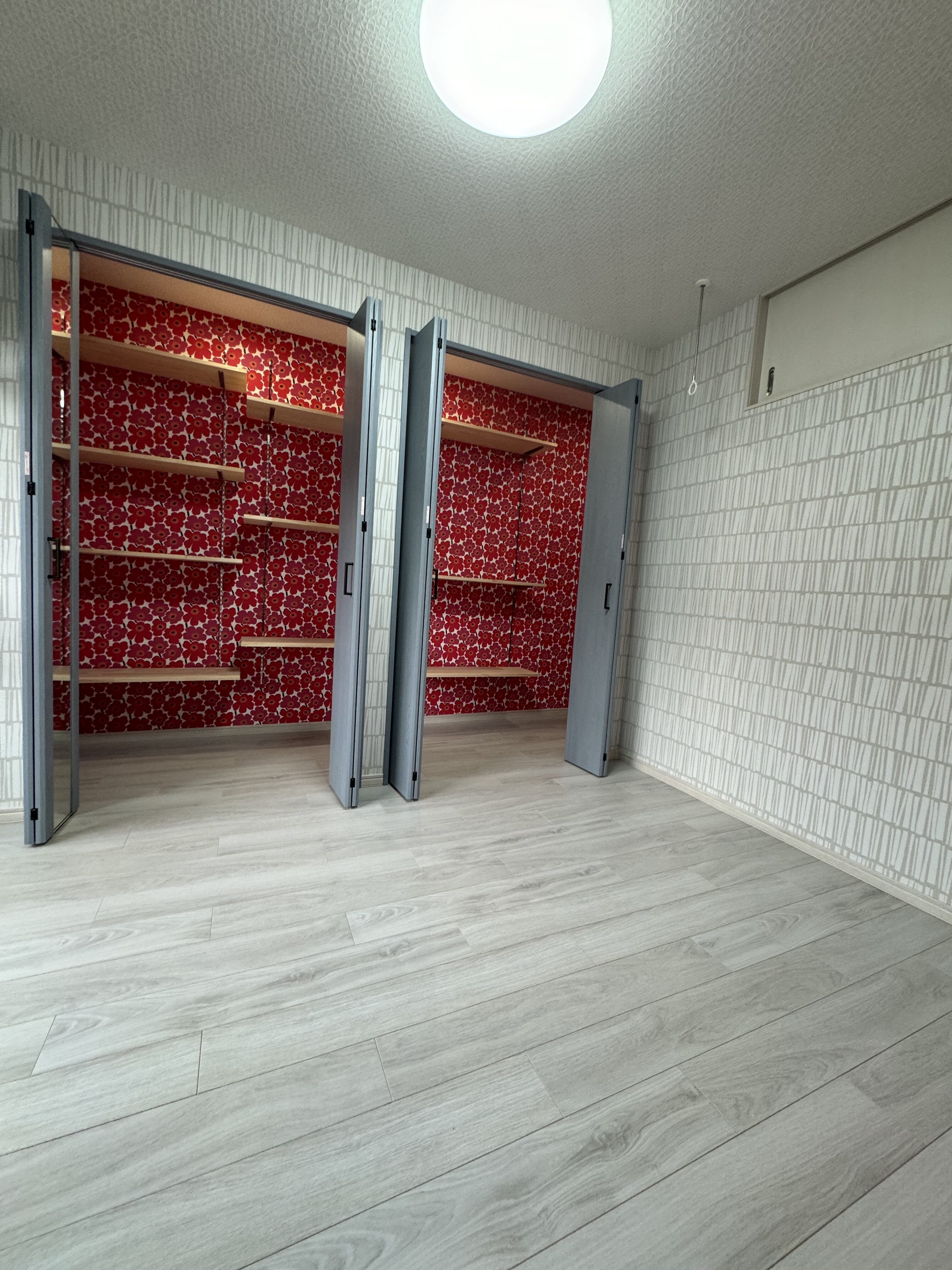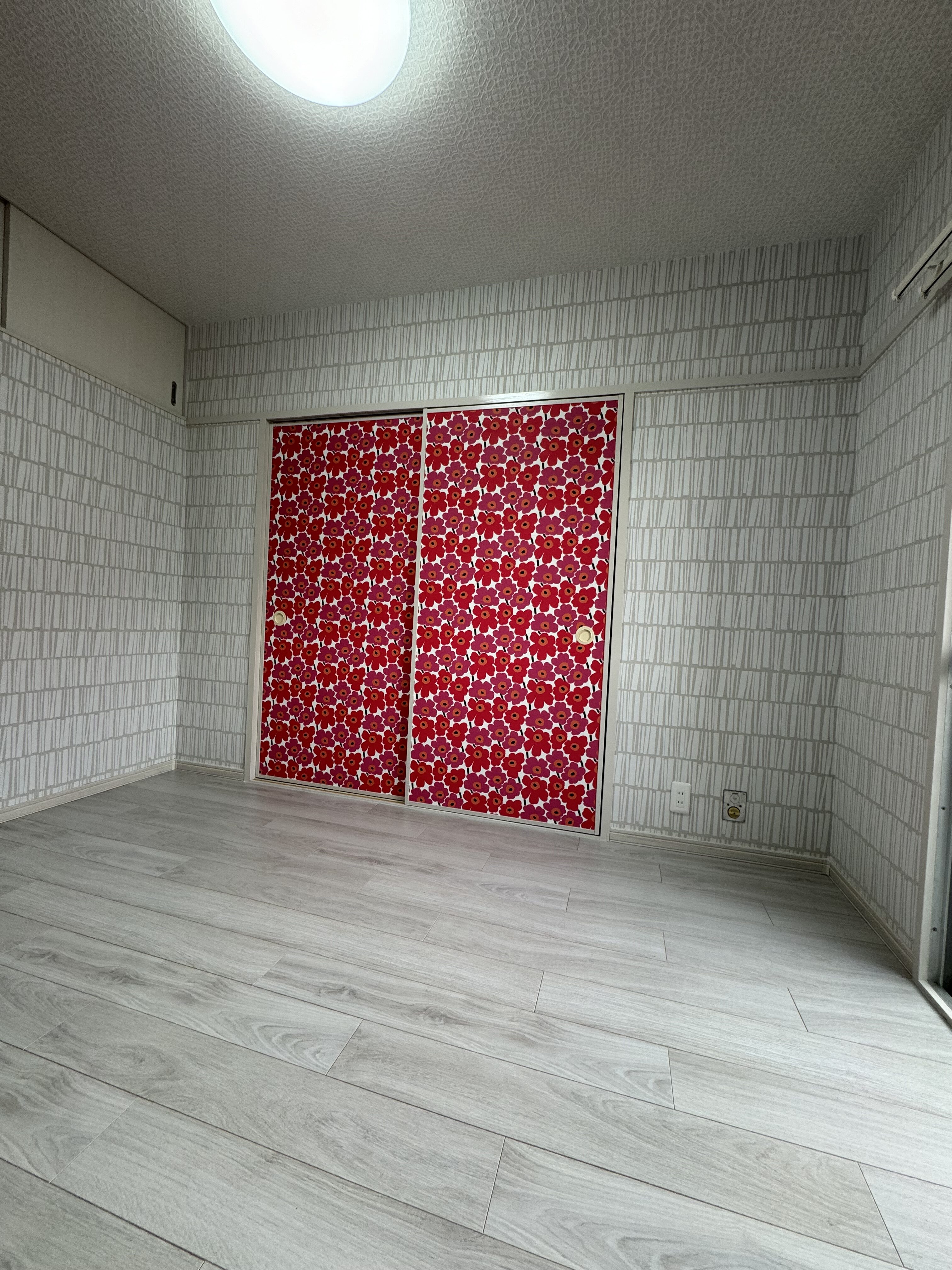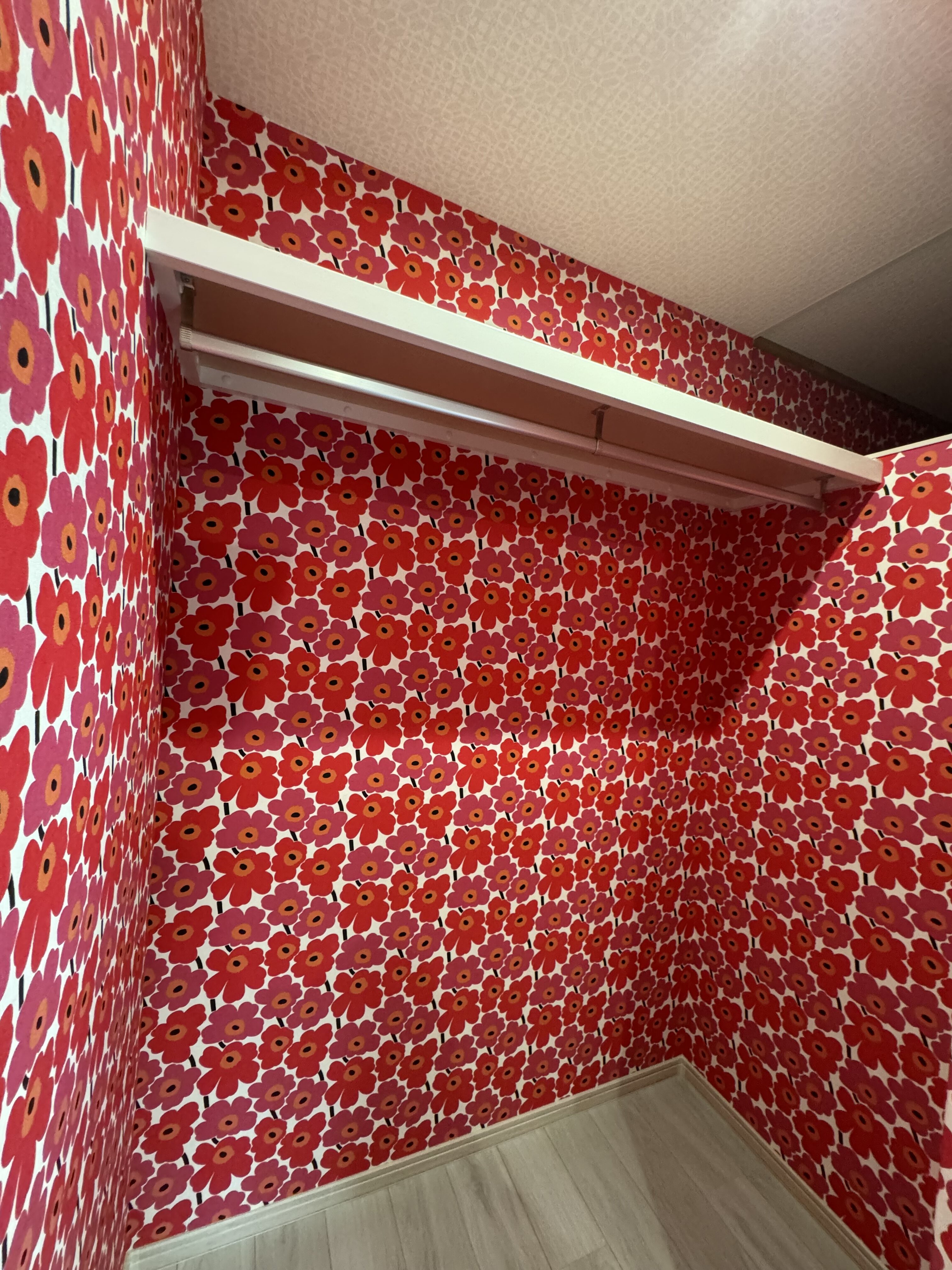 収納スペースにはマリメッコの壁紙を使用し、印象的なデザインにしました。収納折り戸やマリメッコ以外の壁紙は床のグレージュ系フローリングと合わせ、統一感のあるおしゃれな空間に仕上げました。収納折り戸につけた姿見の鏡も便利です。和室が唯一無二の洋室に生まれ変わり、収納も使いやすくなり大満足!お客様からは「使うのがもったいない」と言っていただけるほどの素敵な洋室になりました。